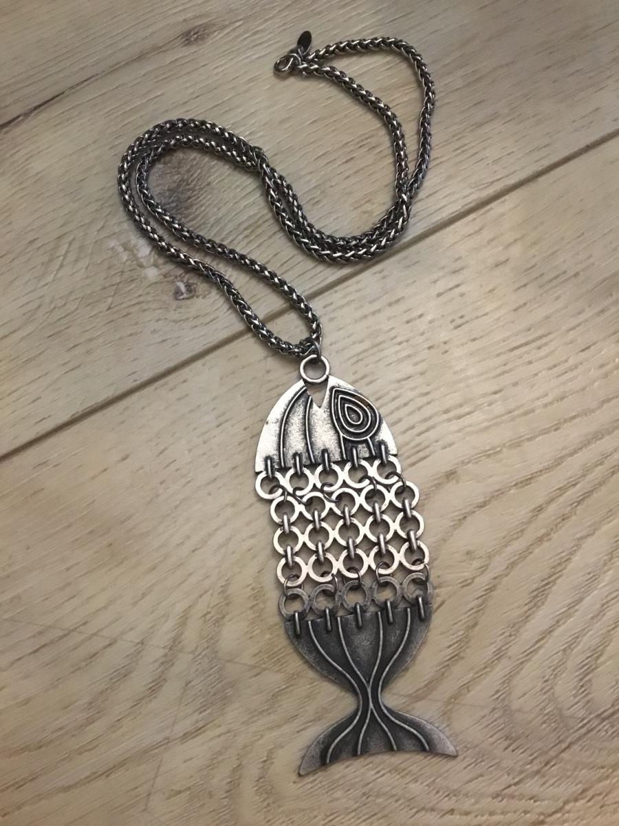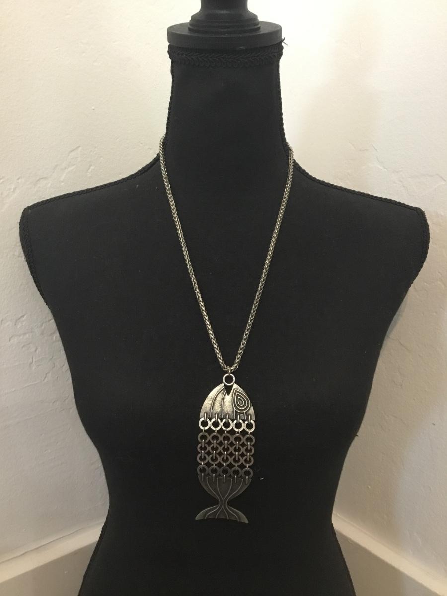 Large Silver tone, mid century, fish, pendant, statement, necklace