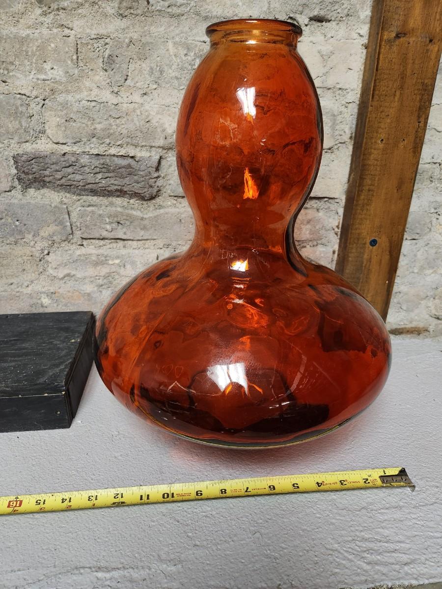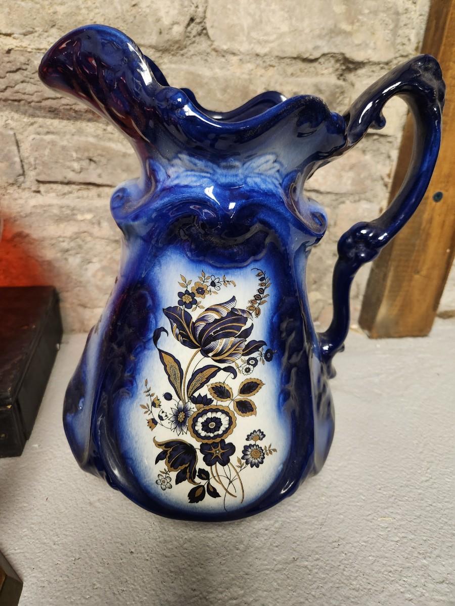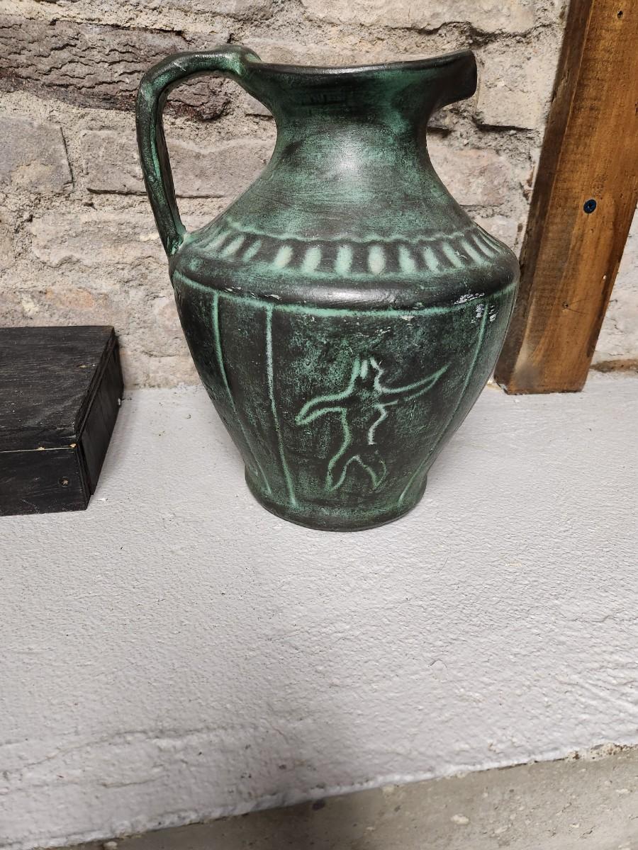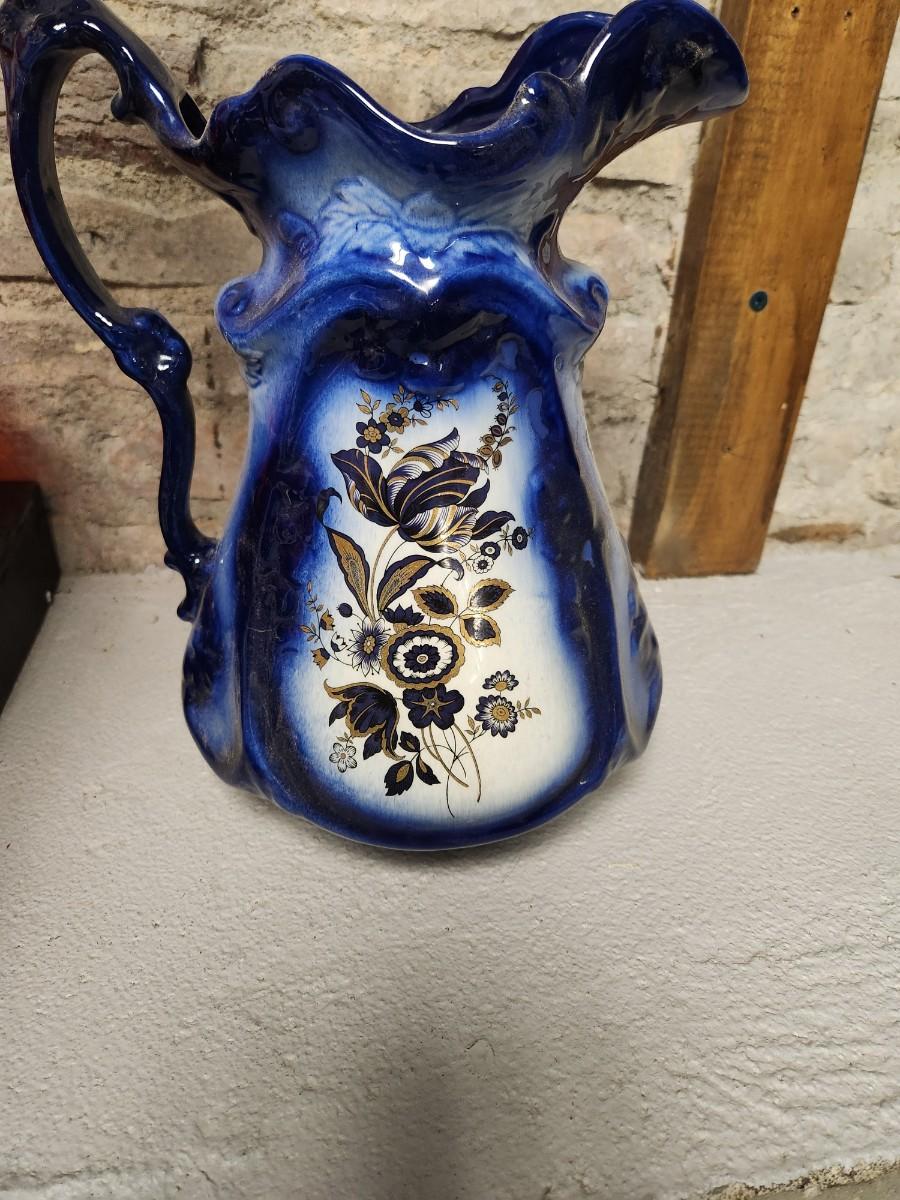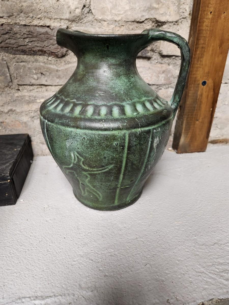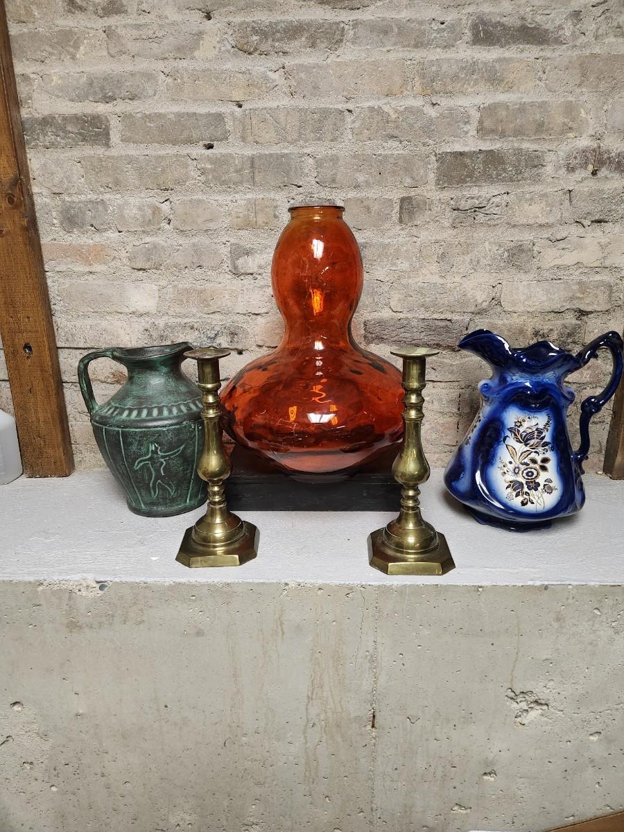 Orange glass vase, green Spanish pitcher, blue washstand pitcher and a pair of big old brass candlesticks