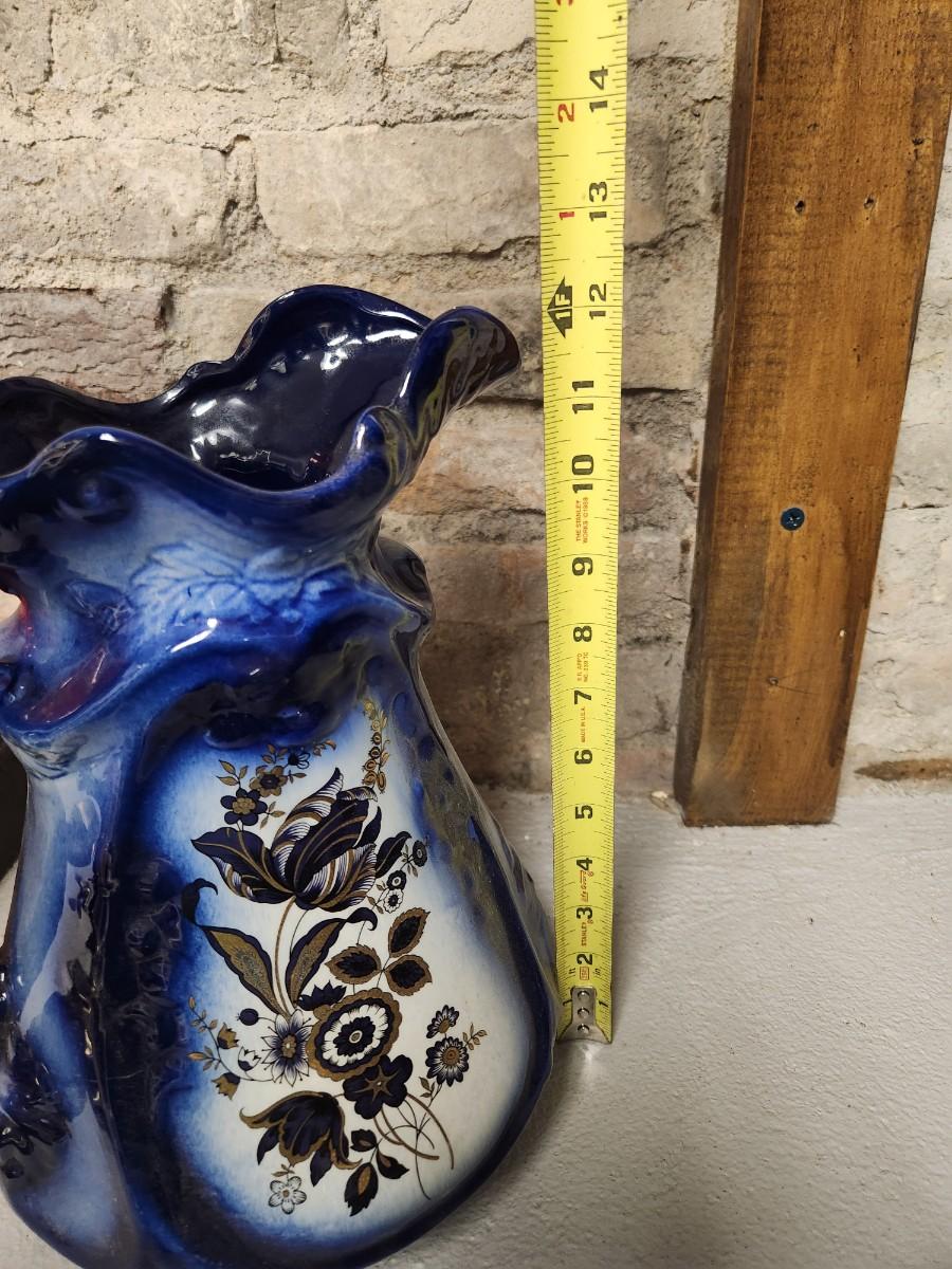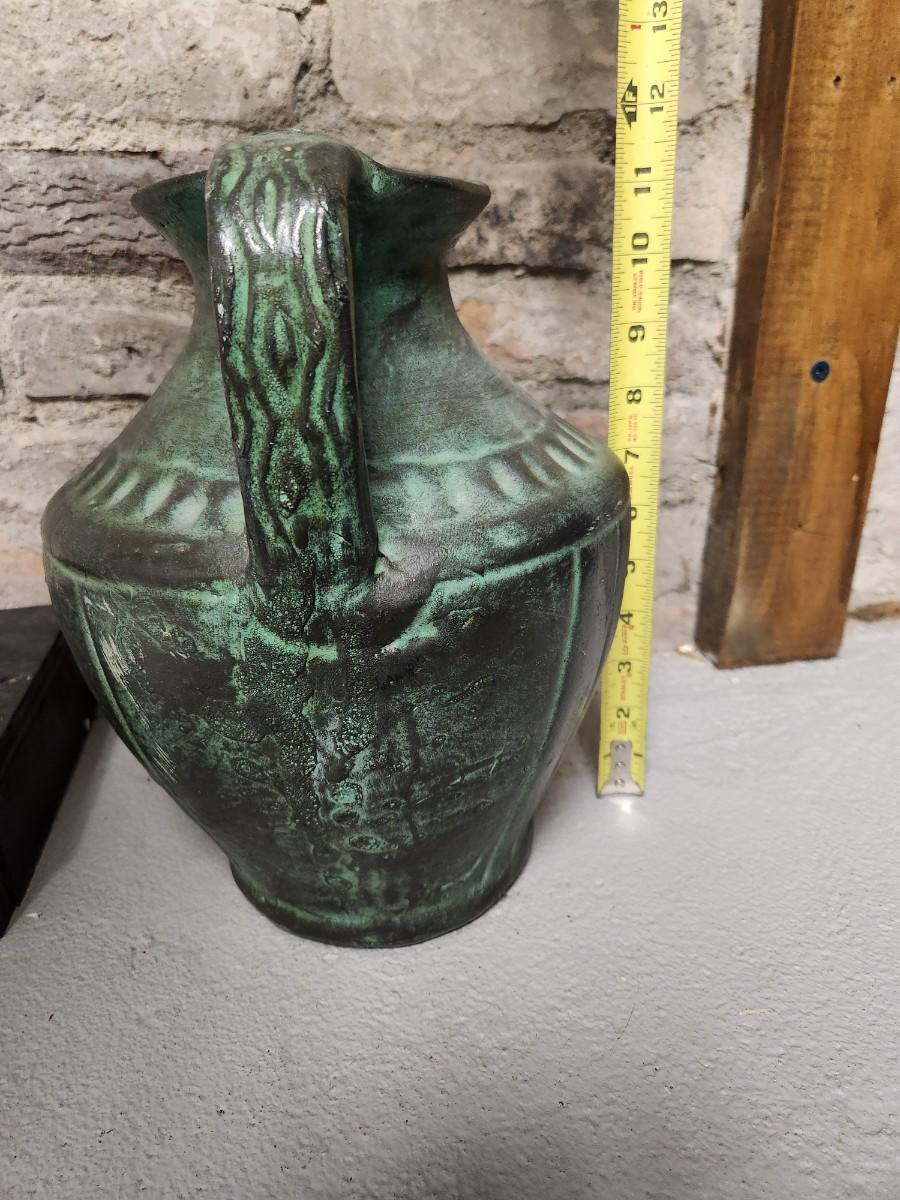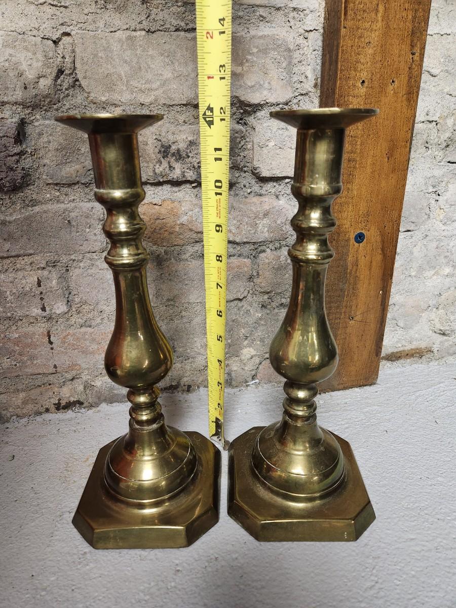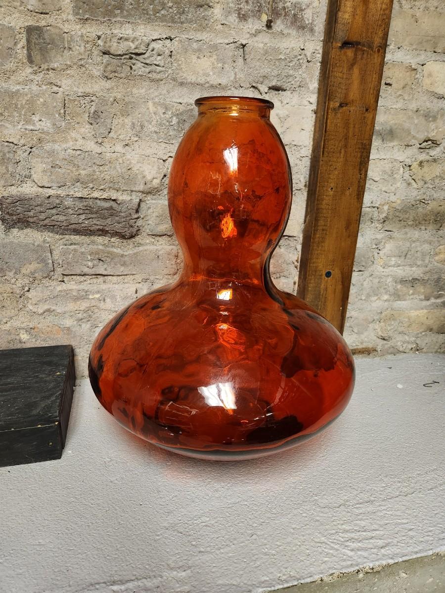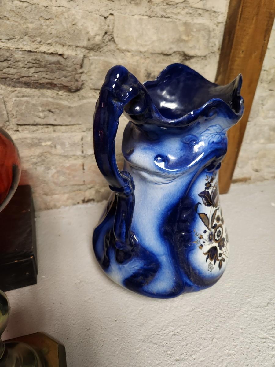 Orange glass vase, green Spanish pitcher, blue washstand pitcher and a pair of big old brass candlesticks