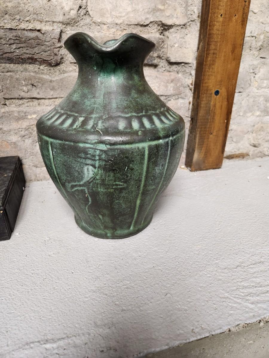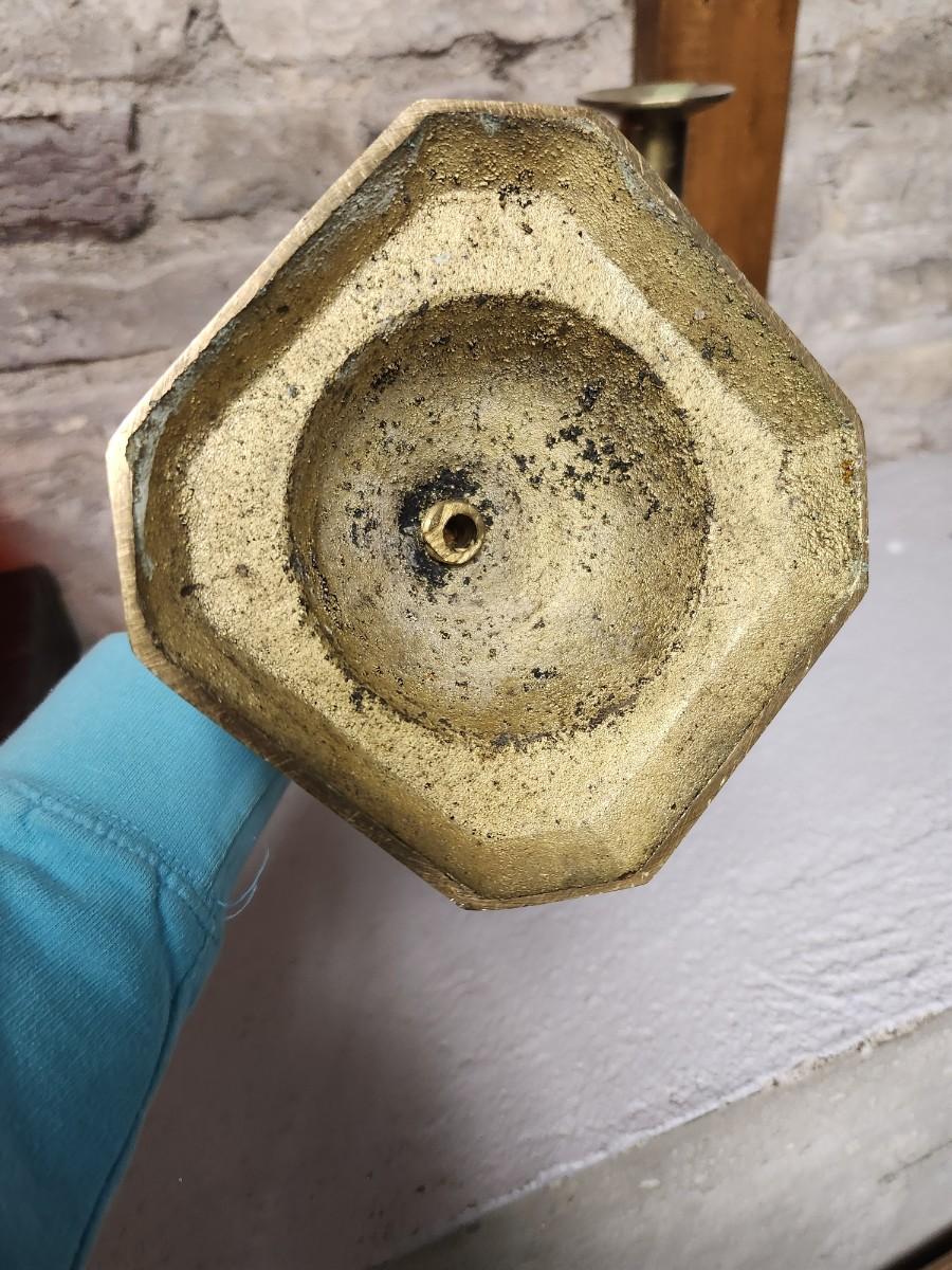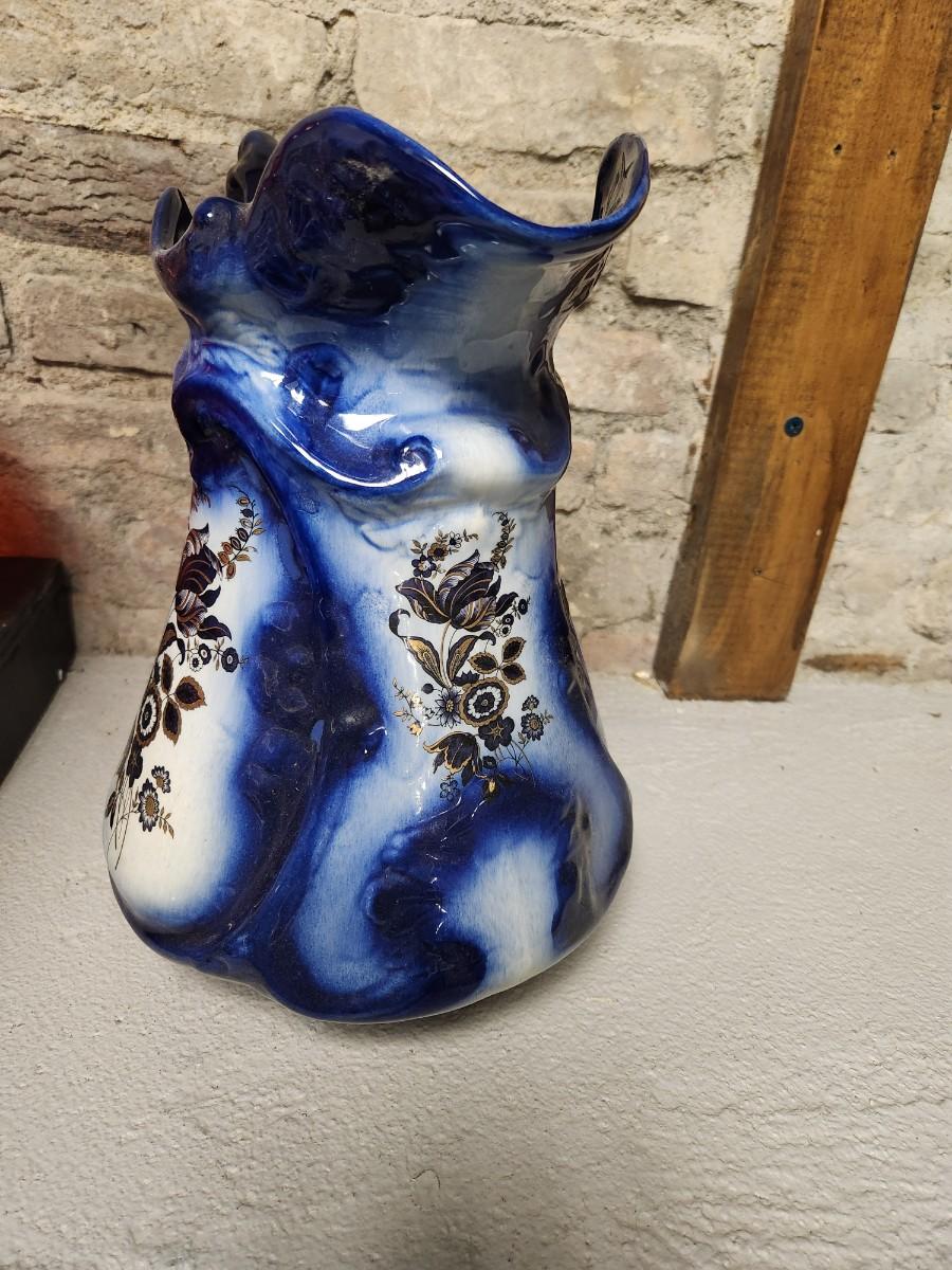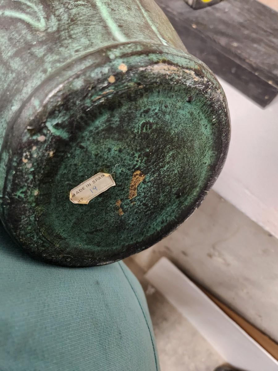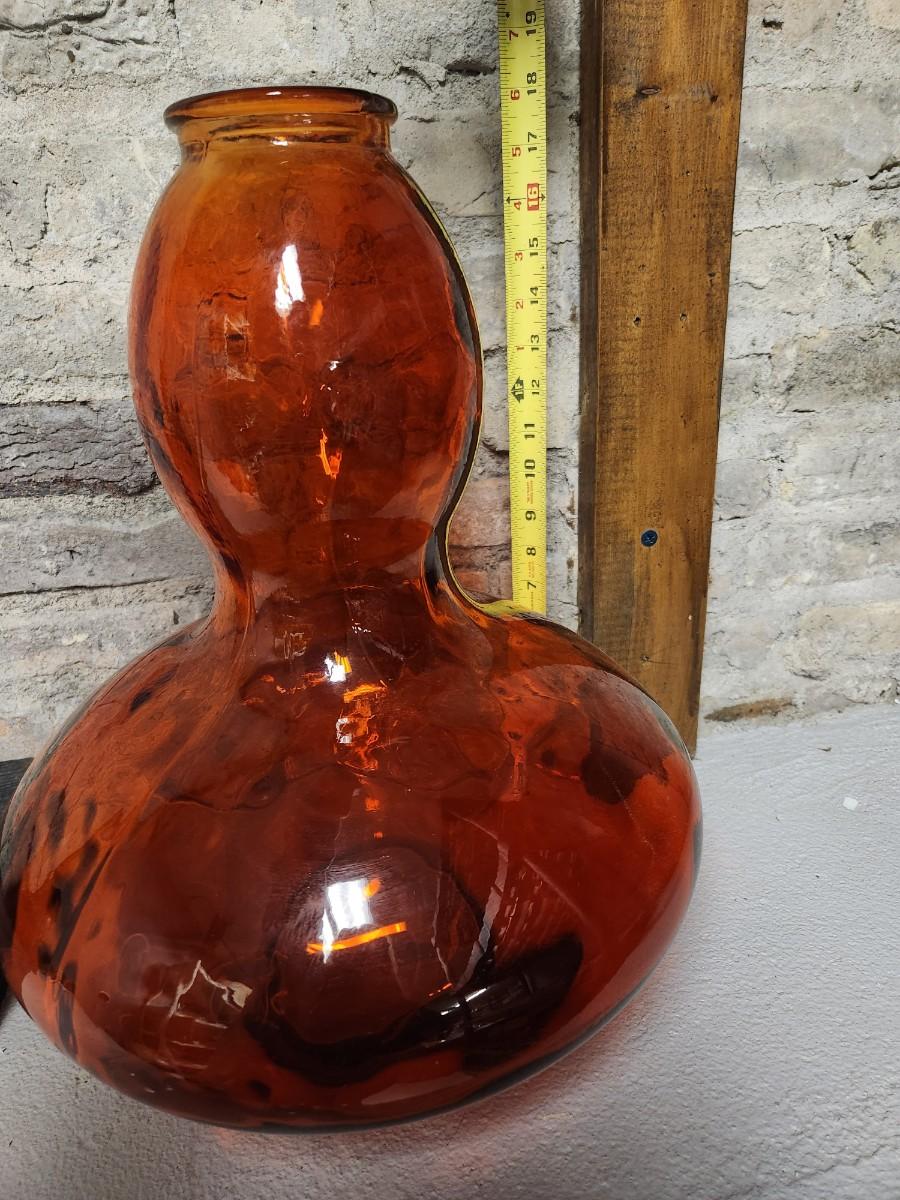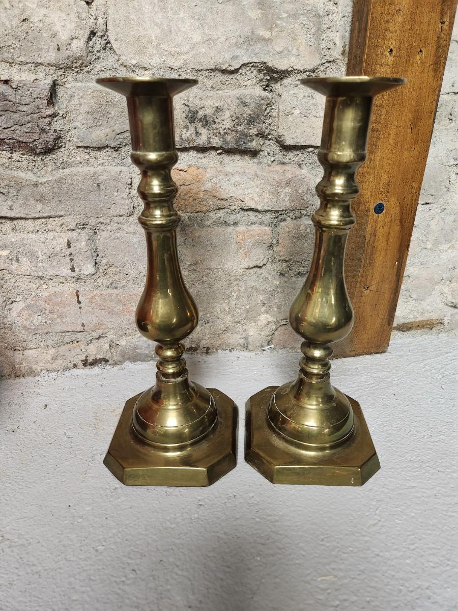 Orange glass vase, green Spanish pitcher, blue washstand pitcher and a pair of big old brass candlesticks