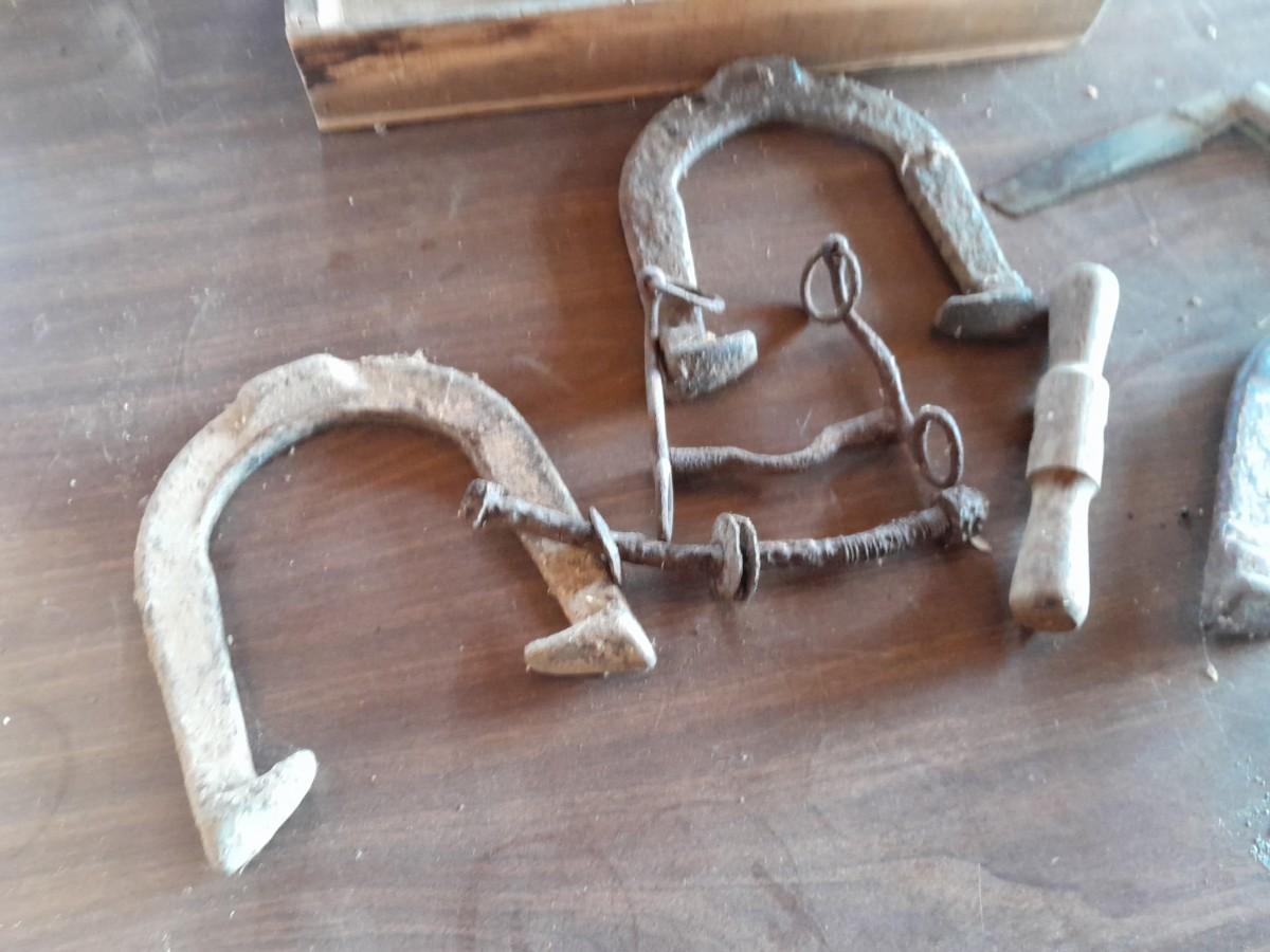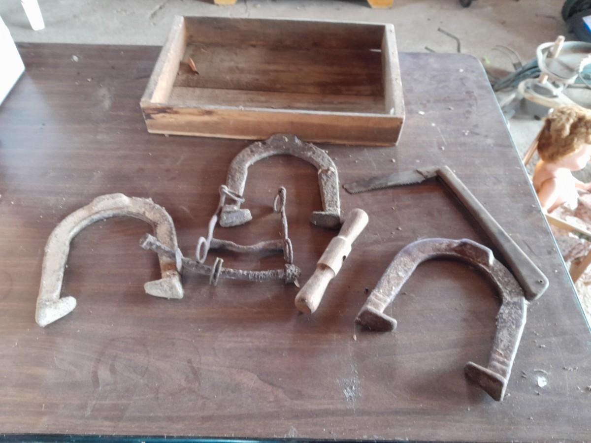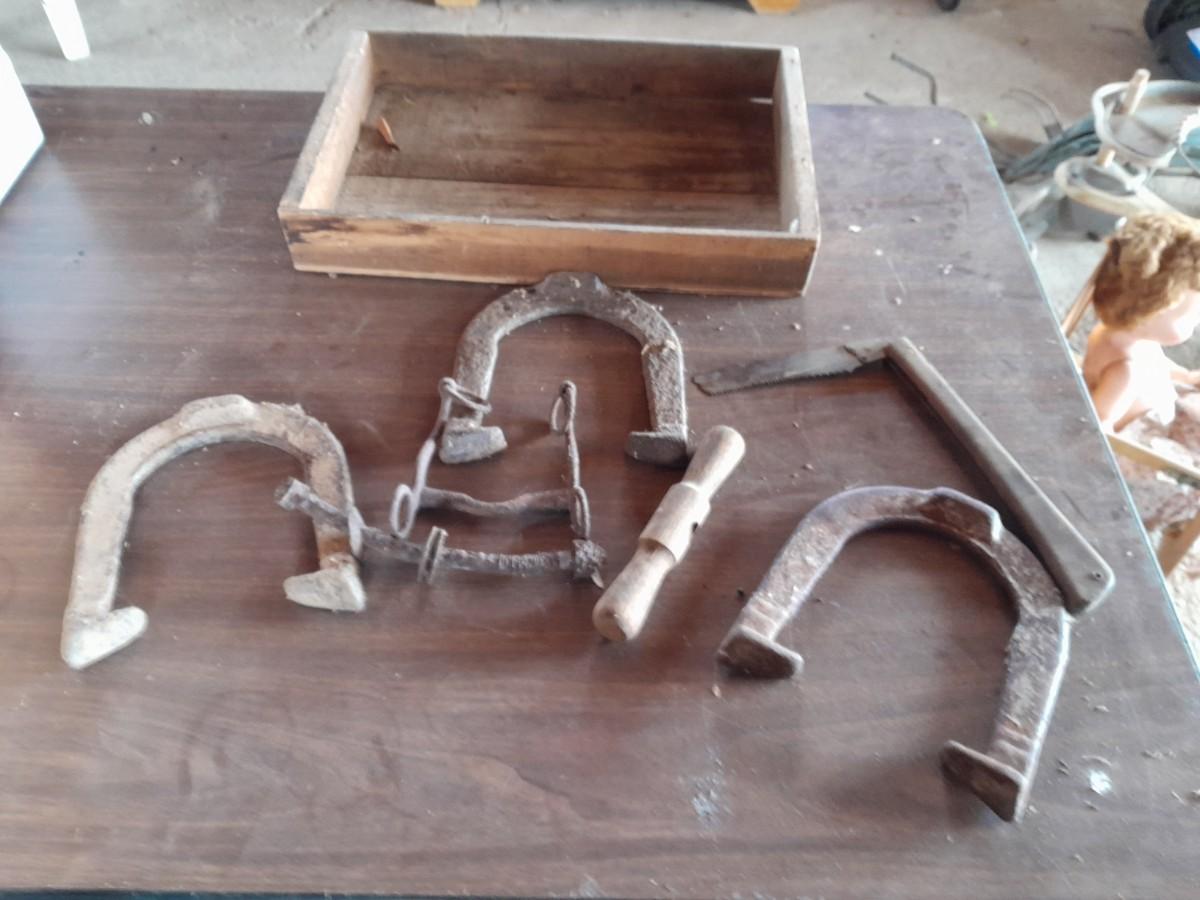 LARGE SIZED HORSESHOES OLD HORSE BITS AND WOODEN BOX