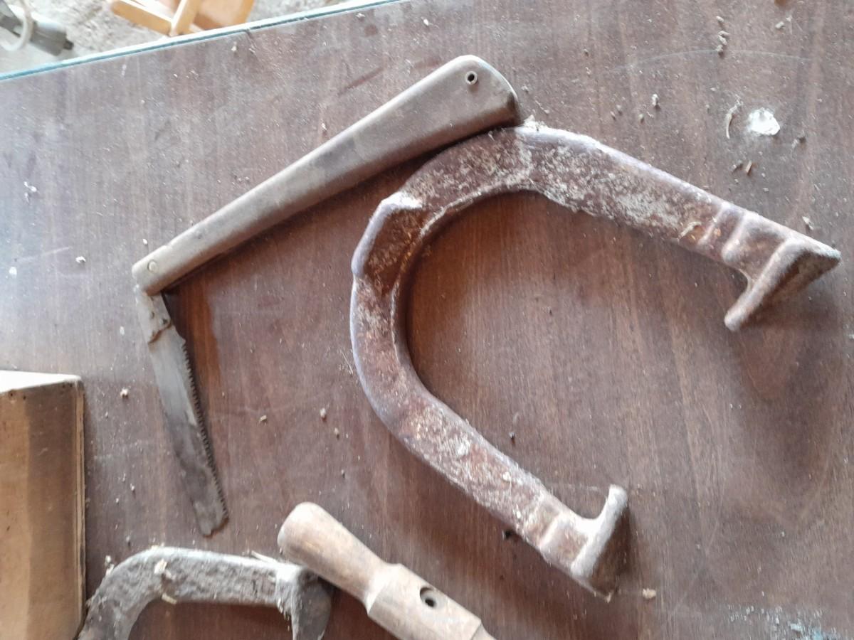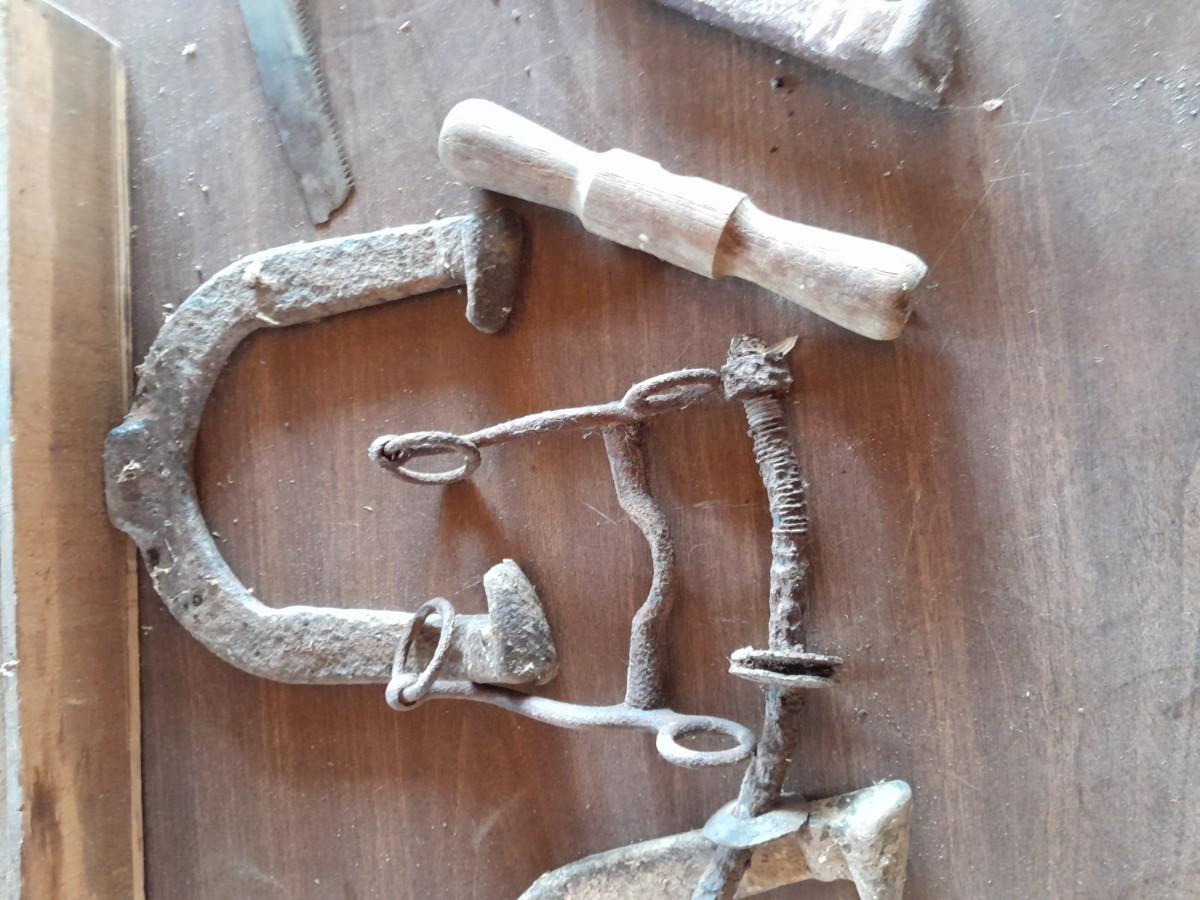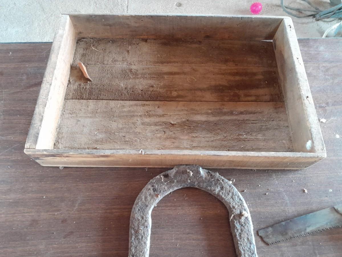 LARGE SIZED HORSESHOES OLD HORSE BITS AND WOODEN BOX