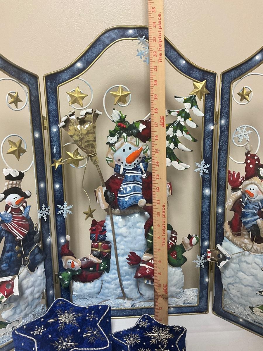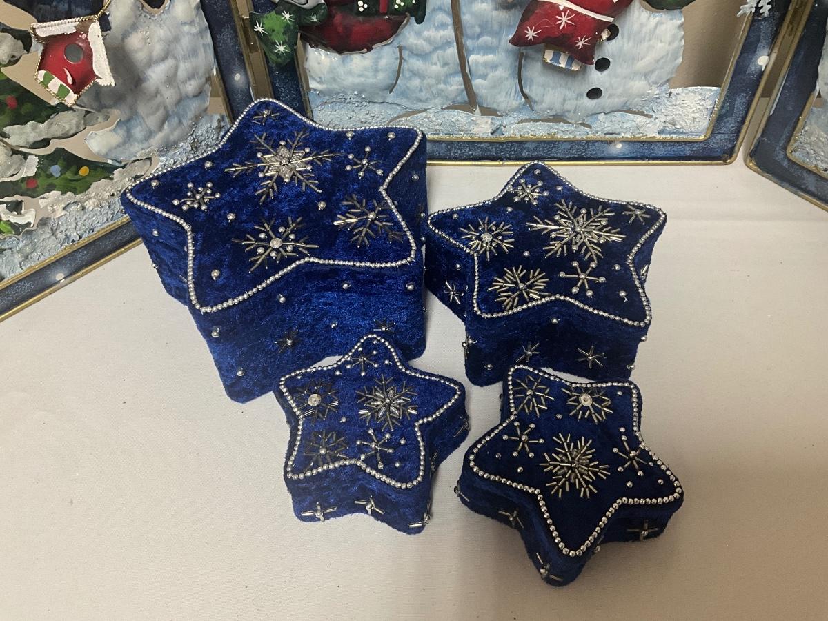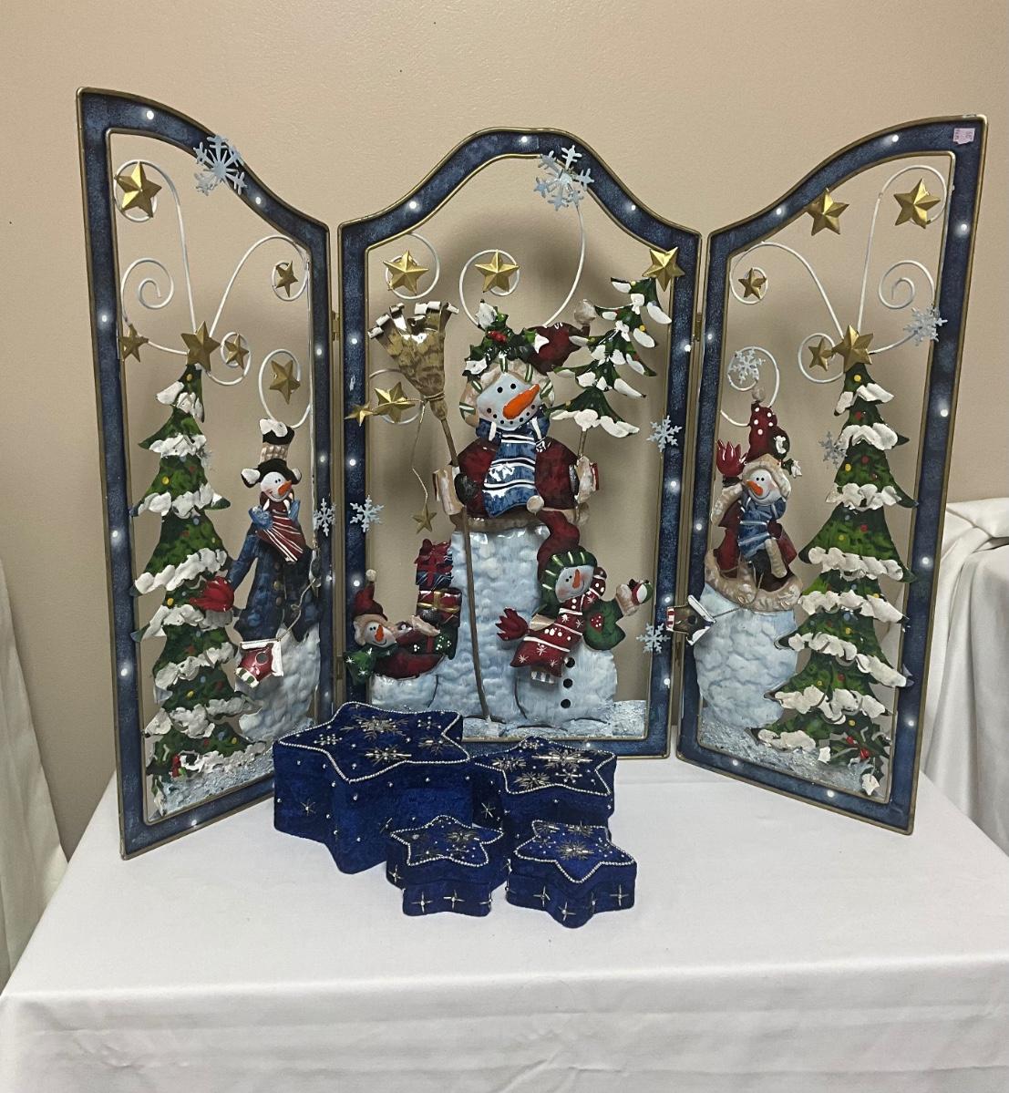 Large Metal Snowman Art and 4 Blue Velvet Star Boxes