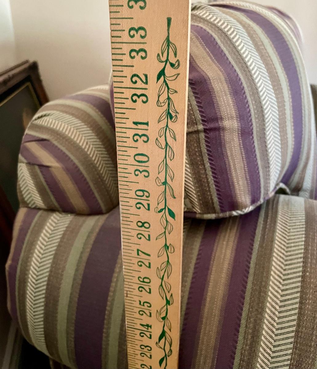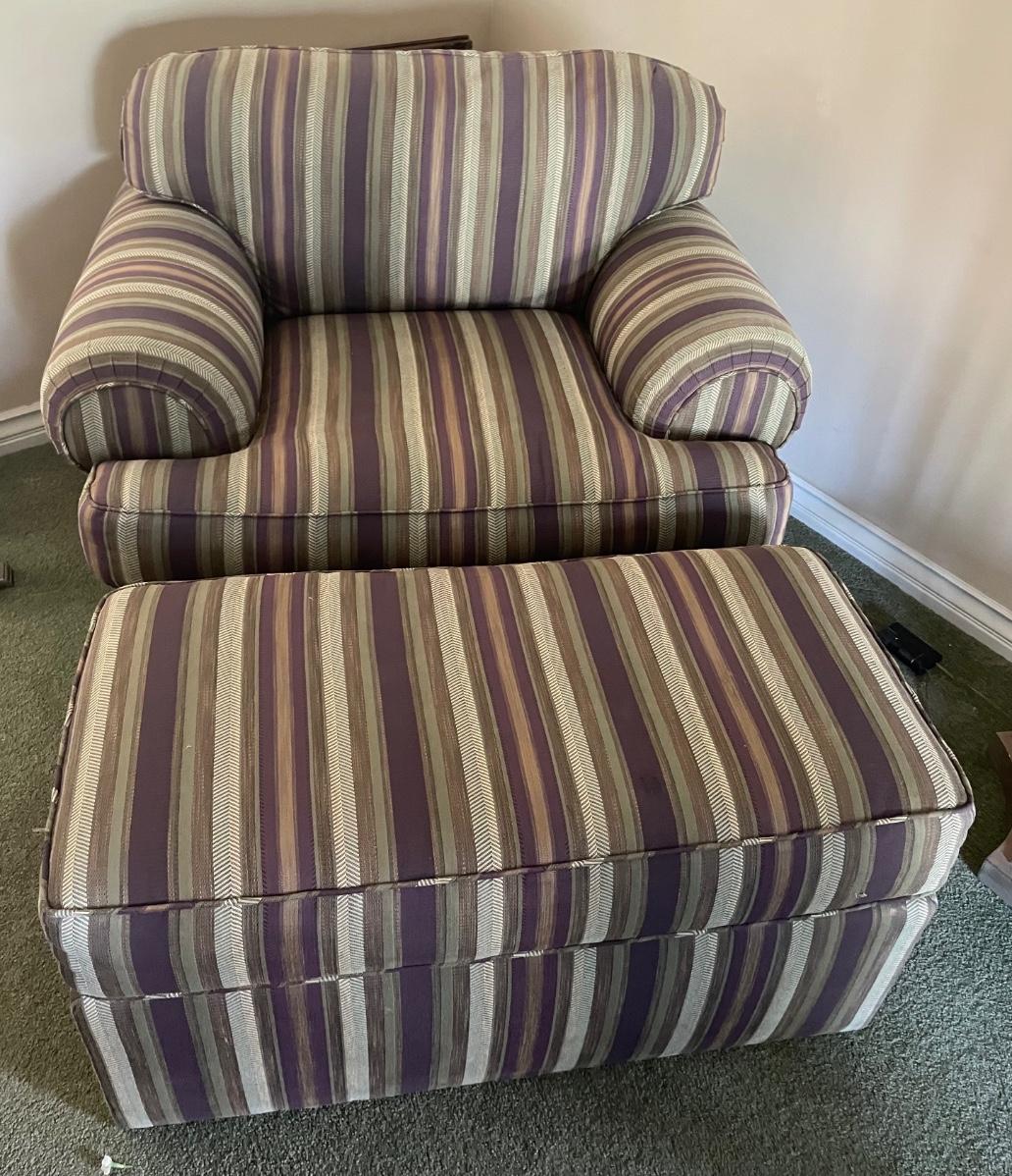 Measures: approx. 48” wide, 36” deep (chair only) and Ottoman is 20” x 40”. In good condition without wear marks.