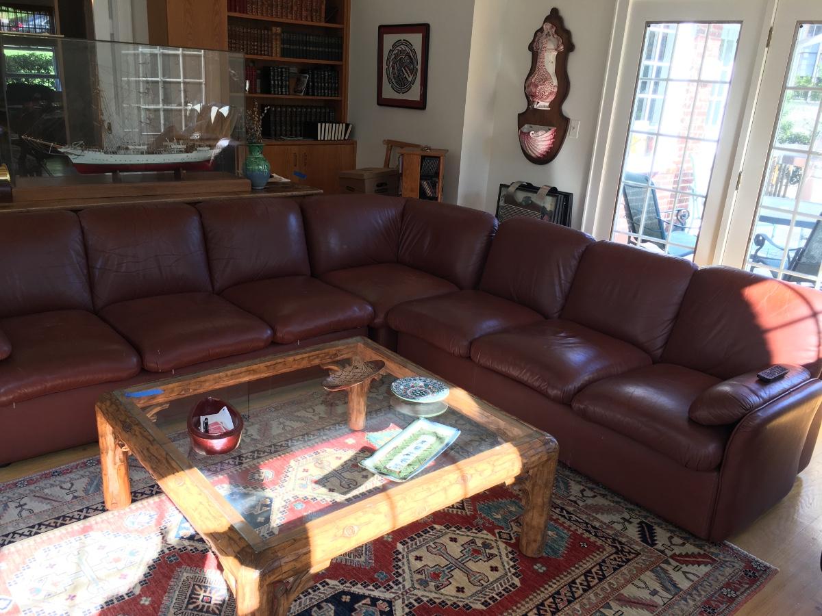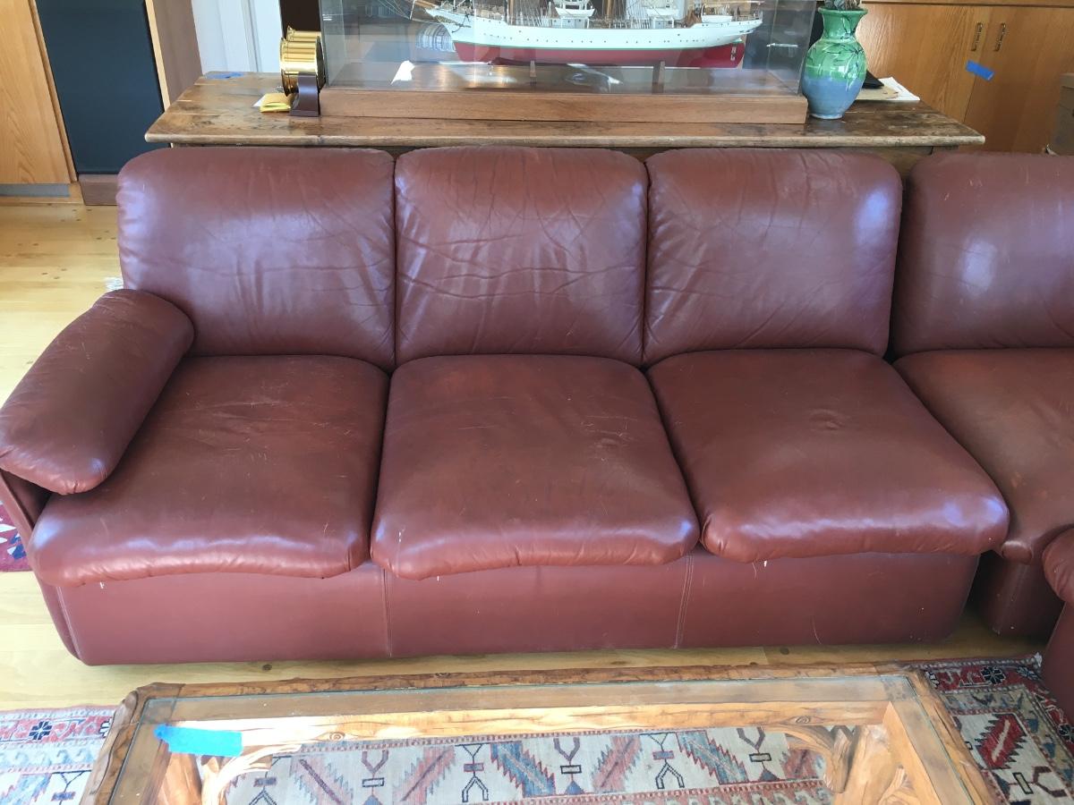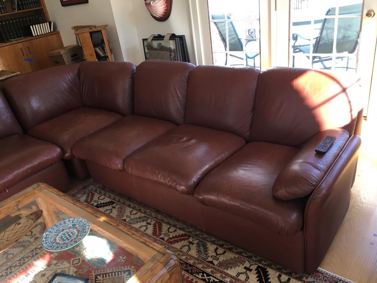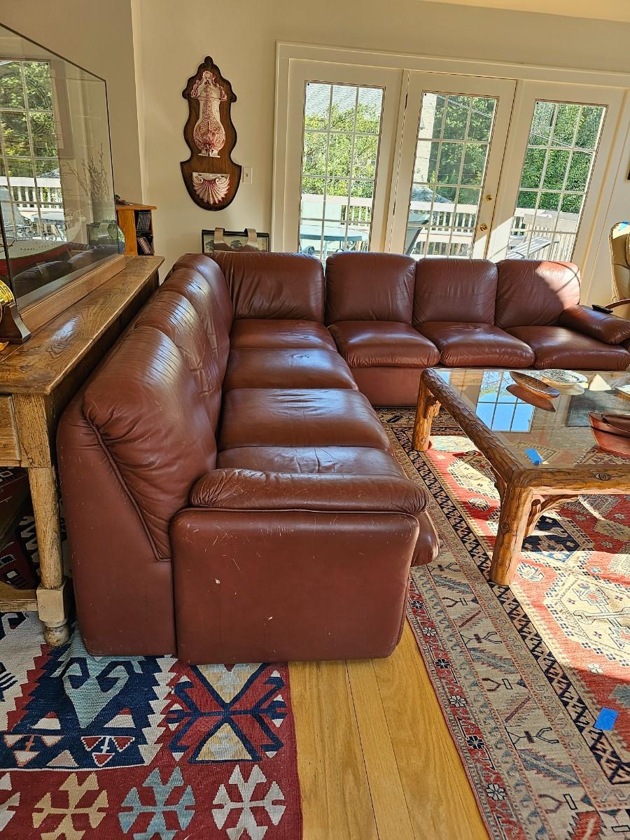 This sectional has 3 sepearte pieces. 2 longer and one corner piece. Cushion do have zippers, but larger back pieces do not. Does have signs of wear as shown in photos, but very comfortable.