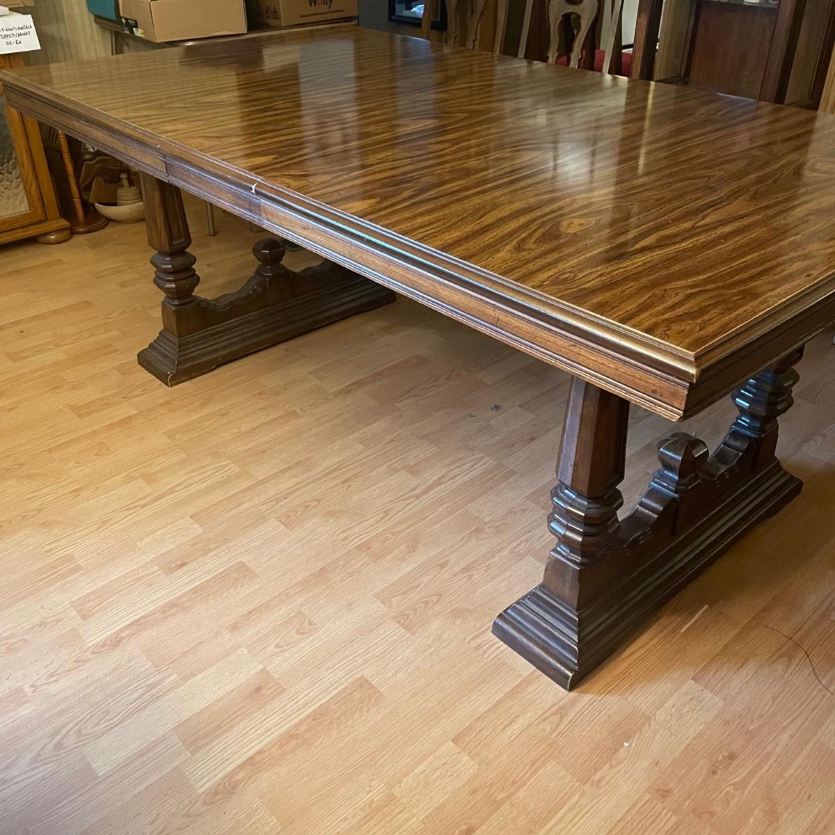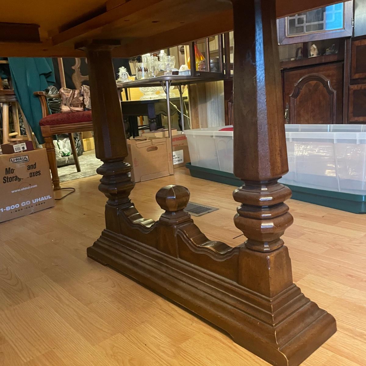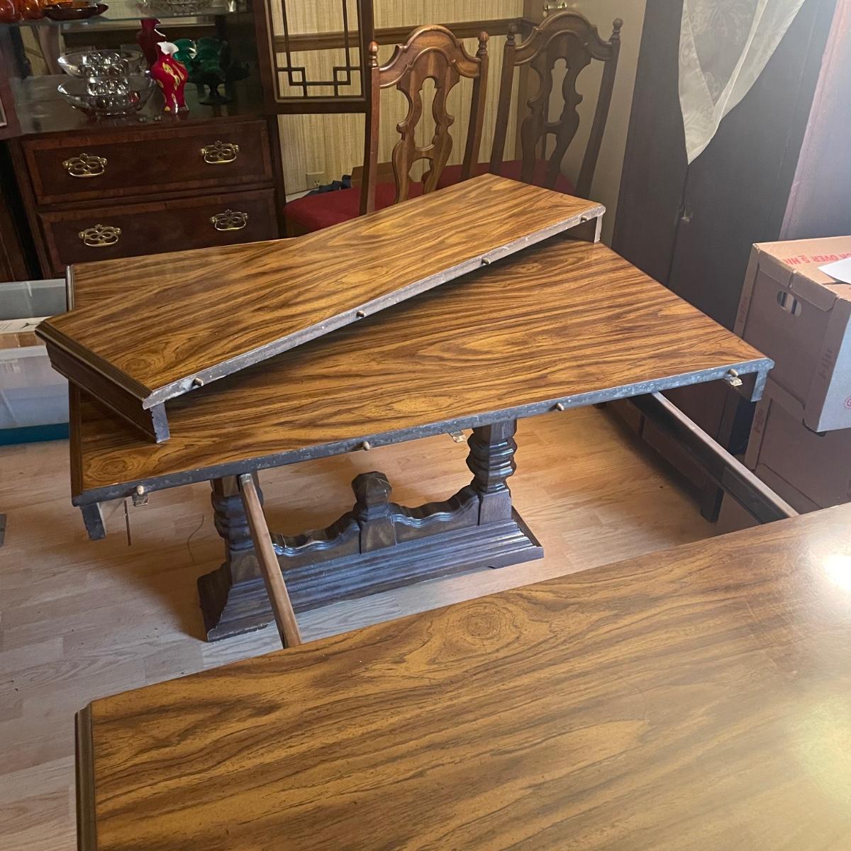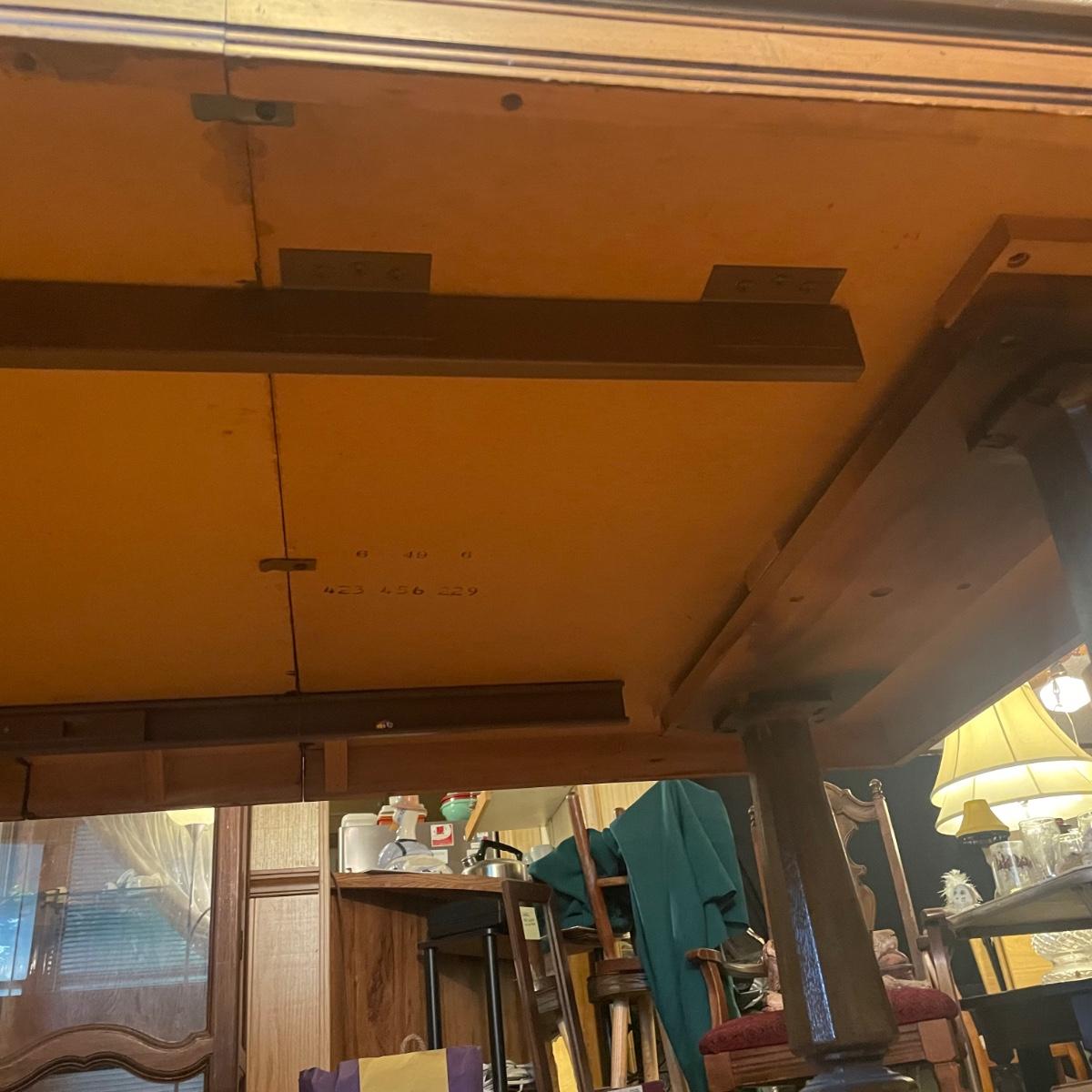 This solid wood dining table has a laminate top (a couple of scratches shown in images). There is beautiful detail in its very sturdy wood legs. It’s a heavy piece so bring good help to load. Extra leaf is easy to install or uninstall, as you will see from images, it has wooden pegs that slot into place.