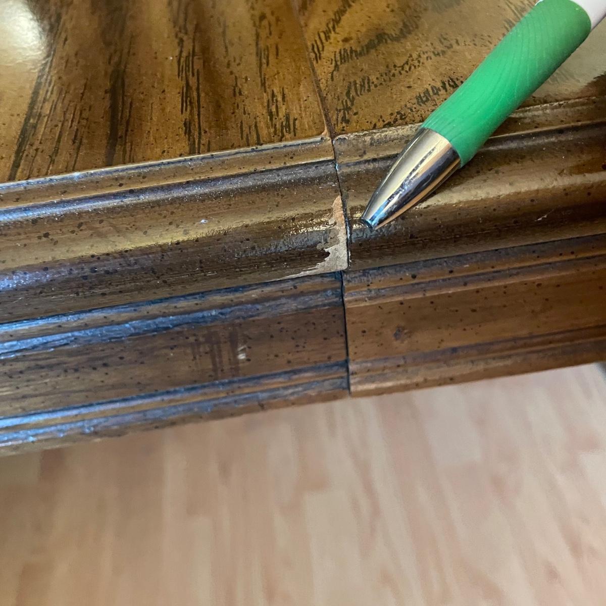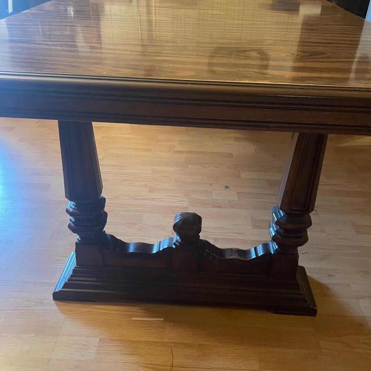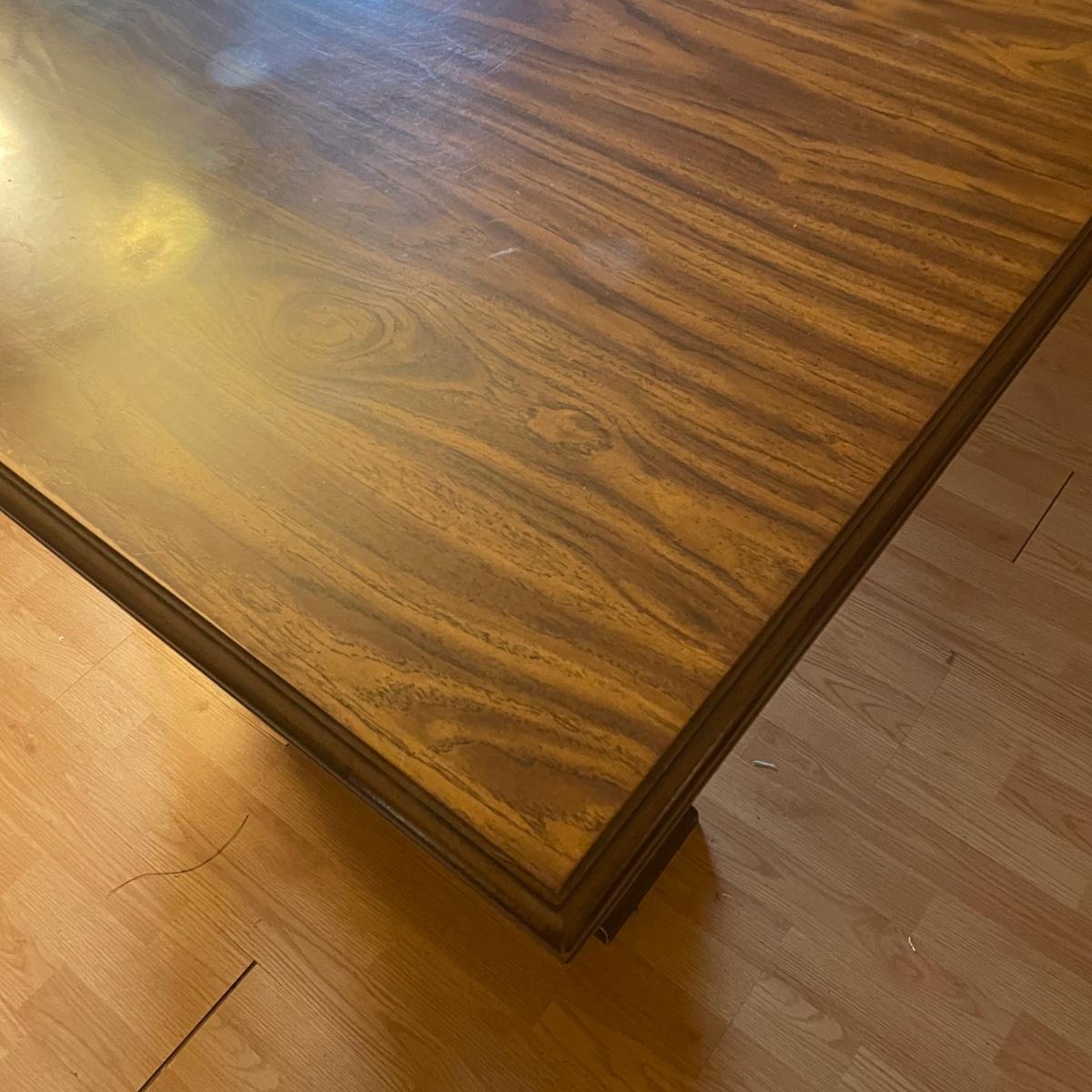 This solid wood dining table has a laminate top (a couple of scratches shown in images). There is beautiful detail in its very sturdy wood legs. It’s a heavy piece so bring good help to load. Extra leaf is easy to install or uninstall, as you will see from images, it has wooden pegs that slot into place.