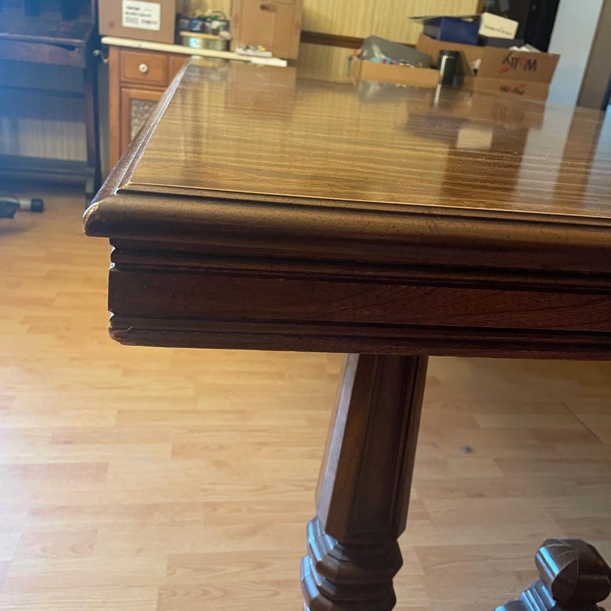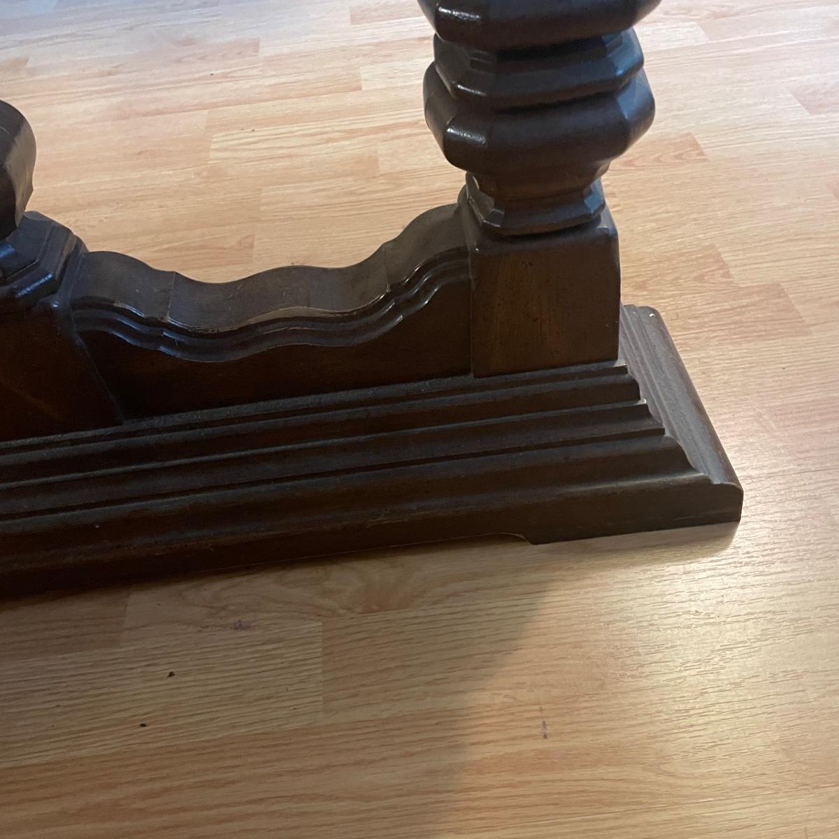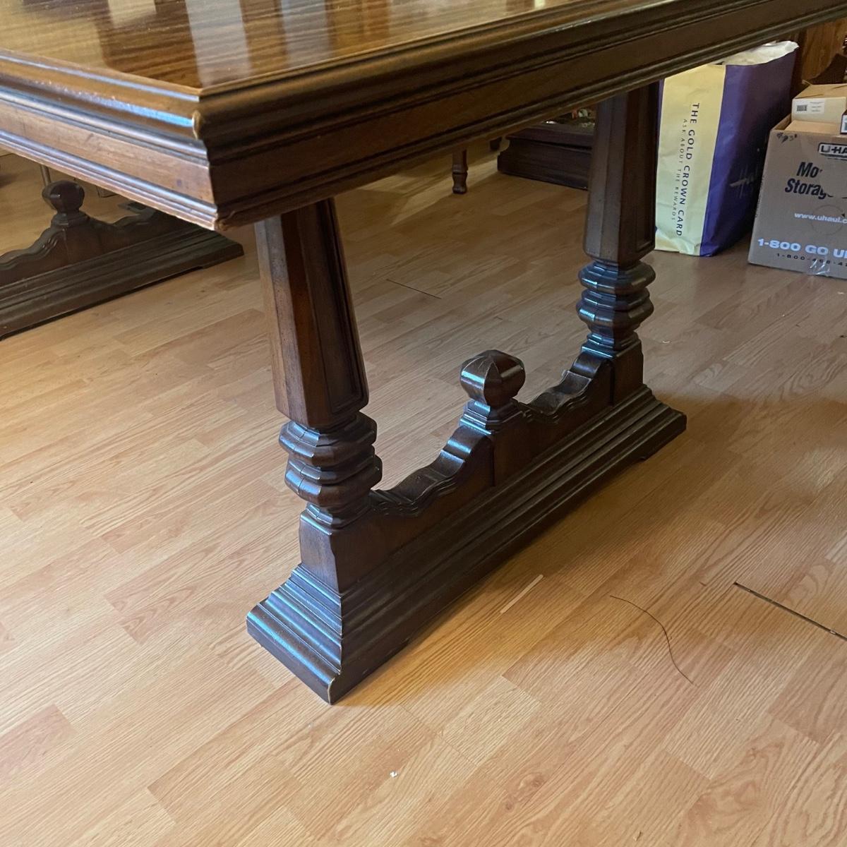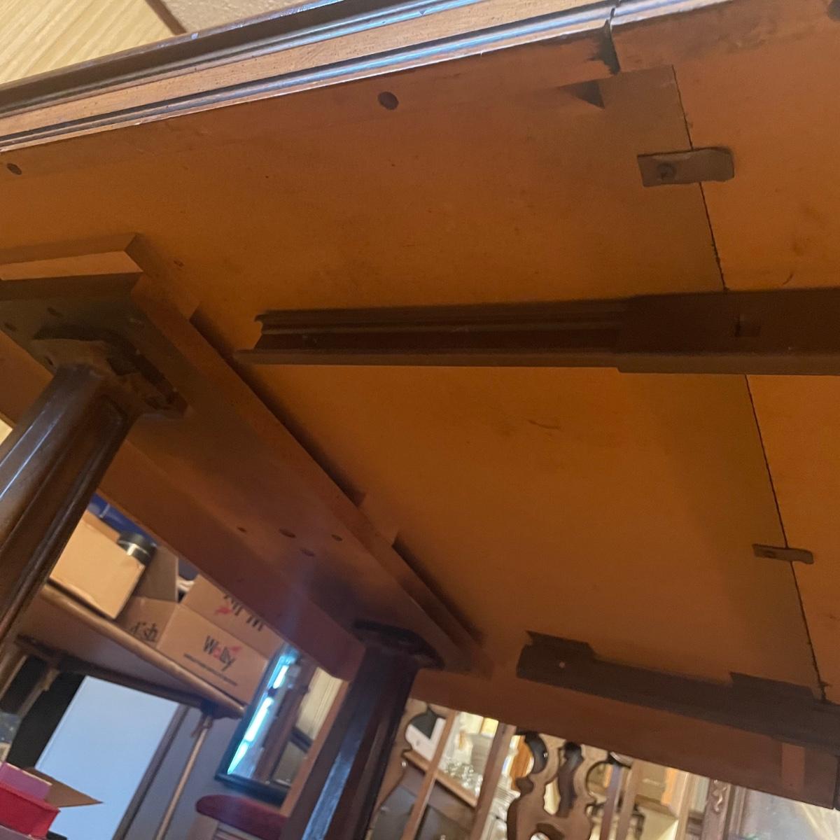 This solid wood dining table has a laminate top (a couple of scratches shown in images). There is beautiful detail in its very sturdy wood legs. It’s a heavy piece so bring good help to load. Extra leaf is easy to install or uninstall, as you will see from images, it has wooden pegs that slot into place.