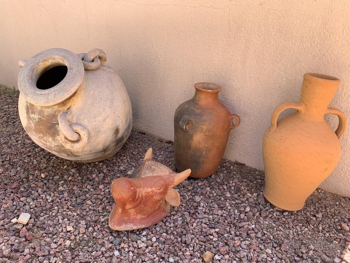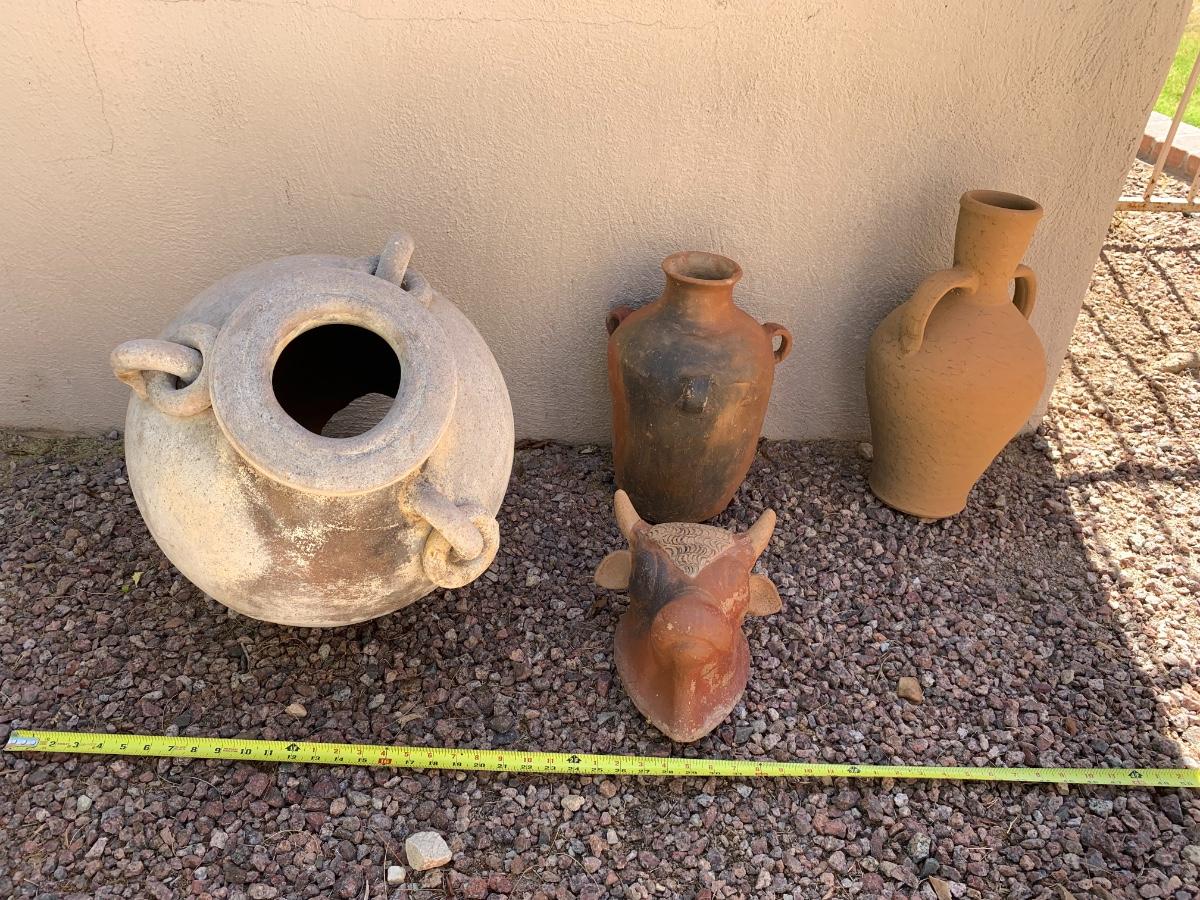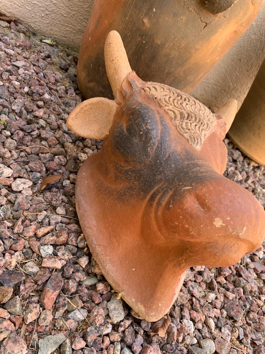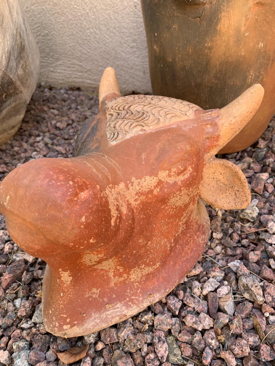 Large Southwest Outdoor Decor including 3 pots (please note the gray one is broken at the bottom) the other pots are fine and in excellent condition. Cows head in great condition, minor wear.