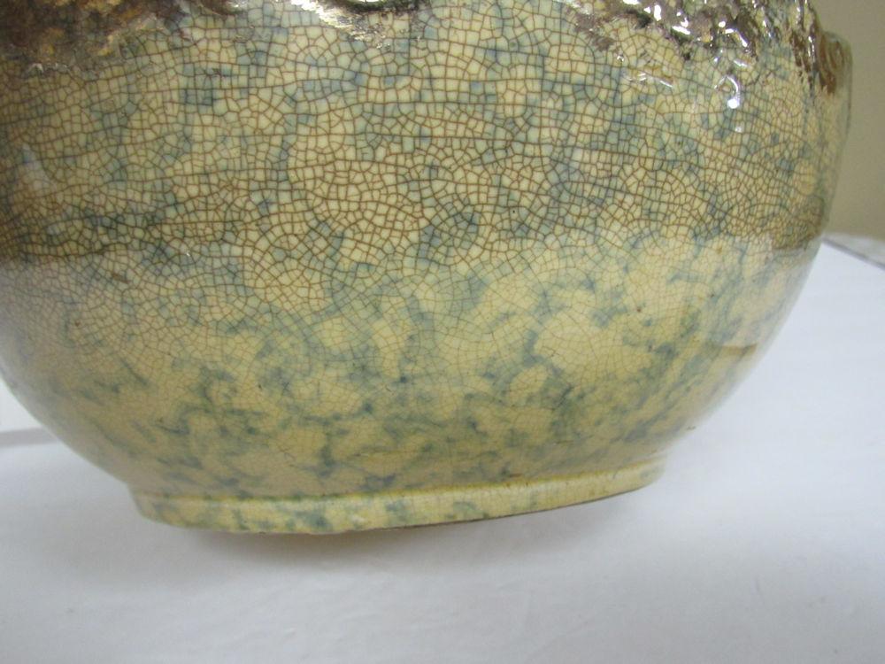 Has a lot of crazing and dark spots, but I don't see any chips or cracks. Gold trim wear.
