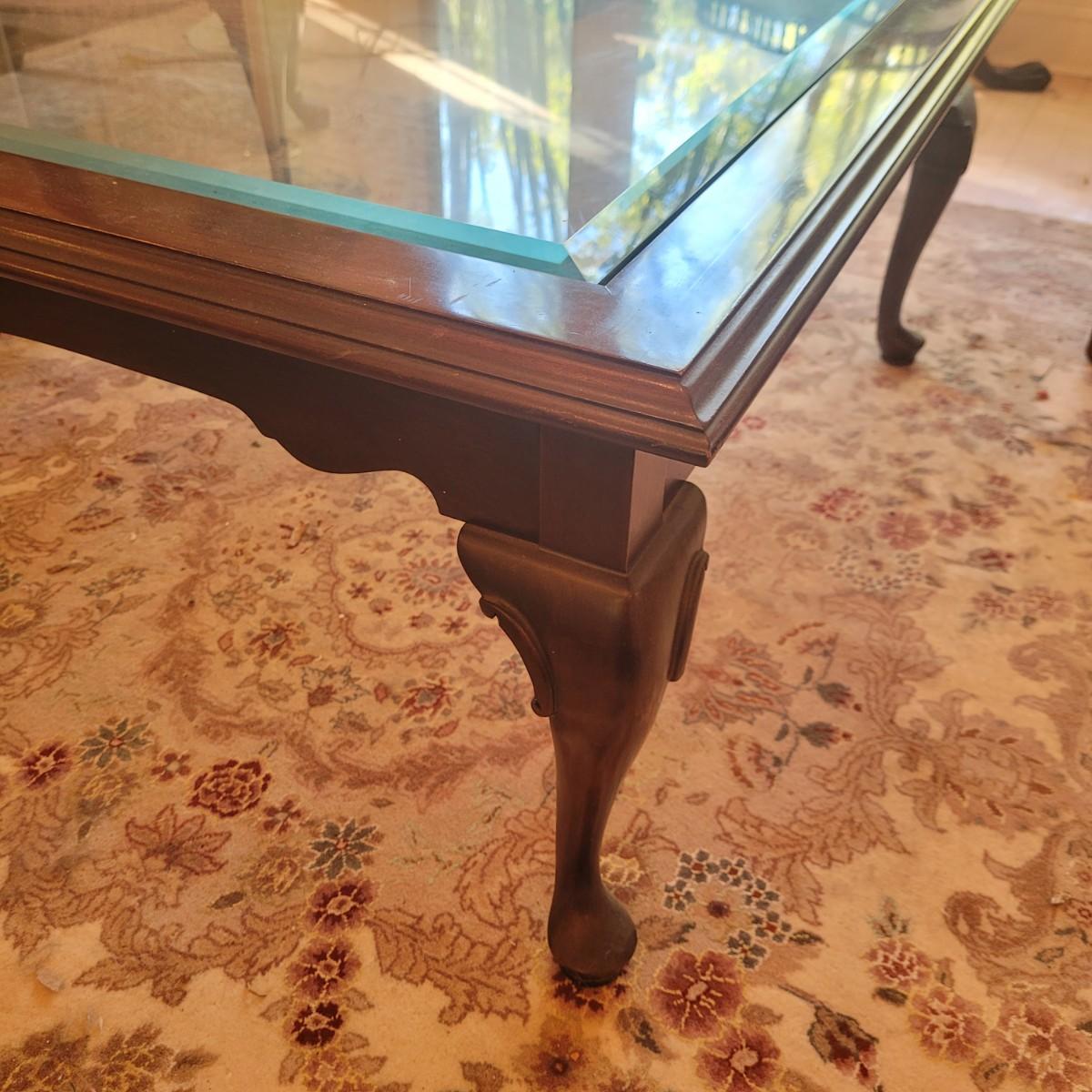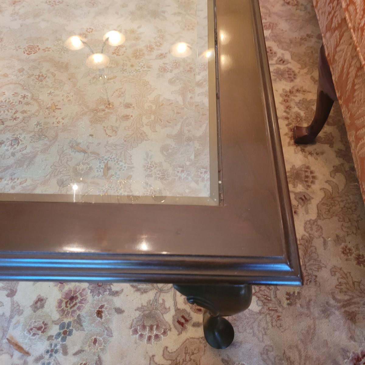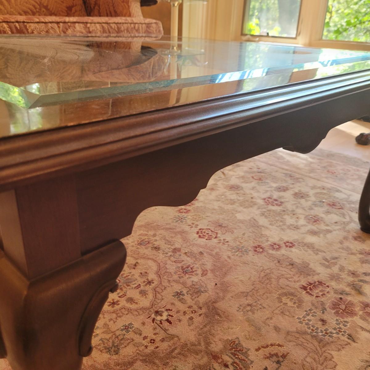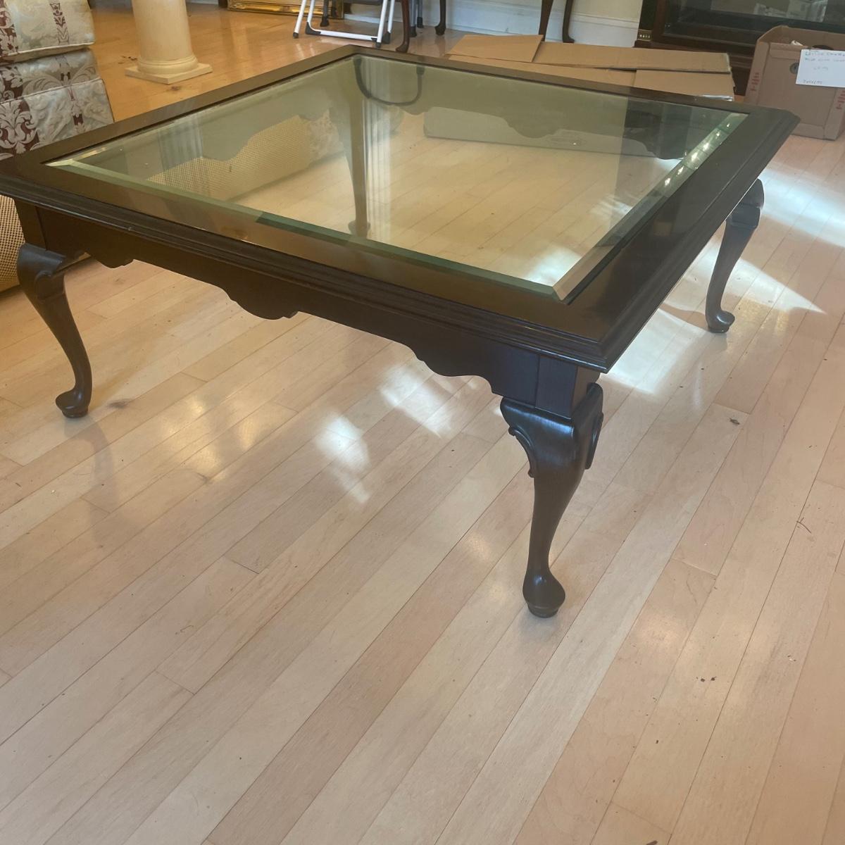 Large wooden coffee table with beveled glass top. In good condition with very few scuffs and scratches. Measures approximately 38"SQ x17"H. Local pickup only.