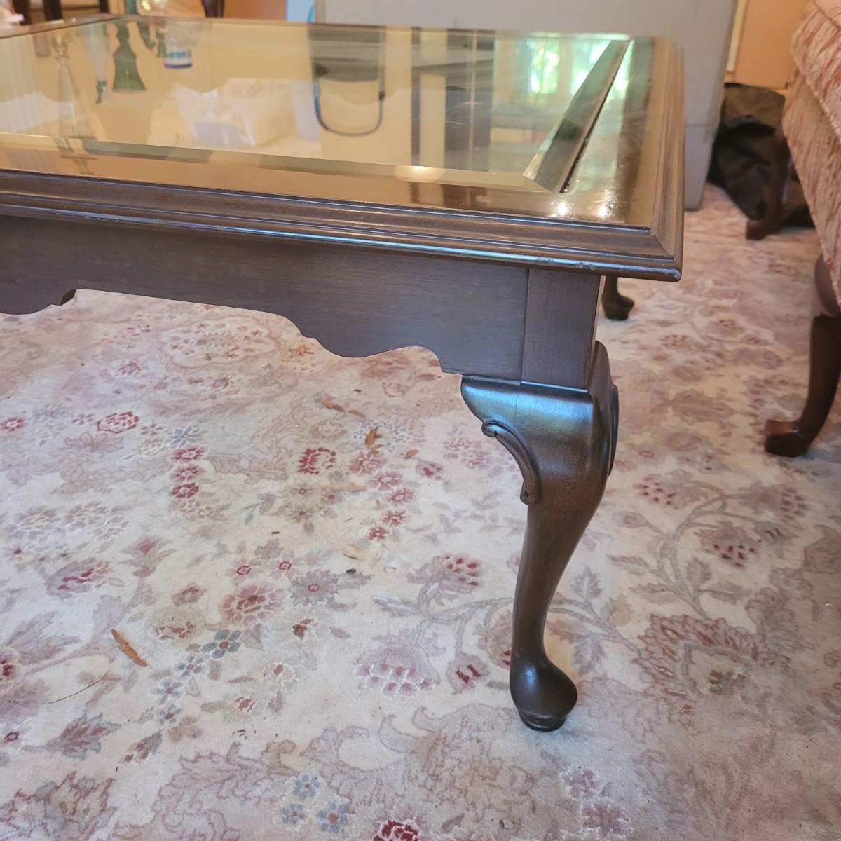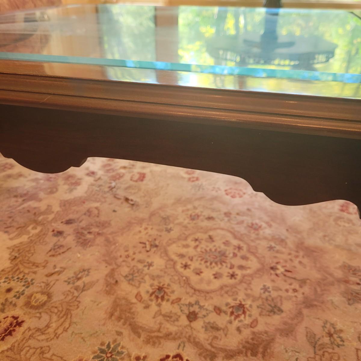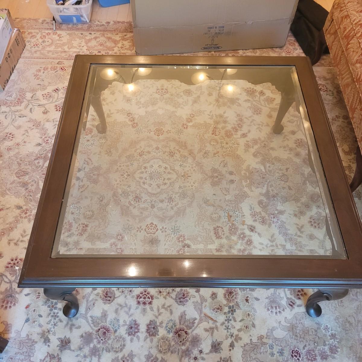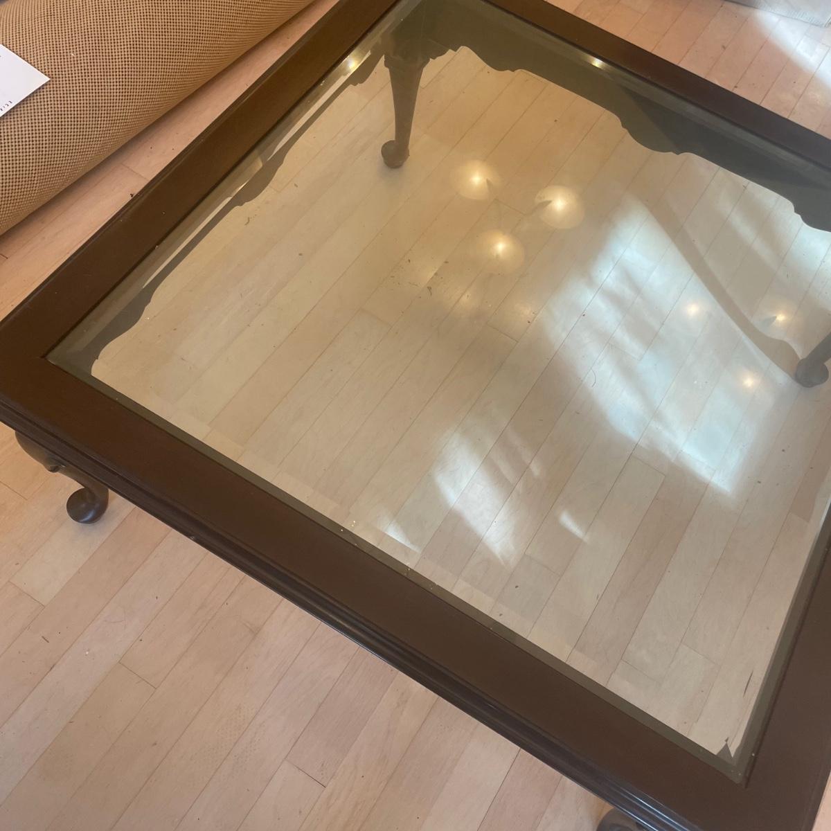 Large wooden coffee table with beveled glass top. In good condition with very few scuffs and scratches. Measures approximately 38"SQ x17"H. Local pickup only.
