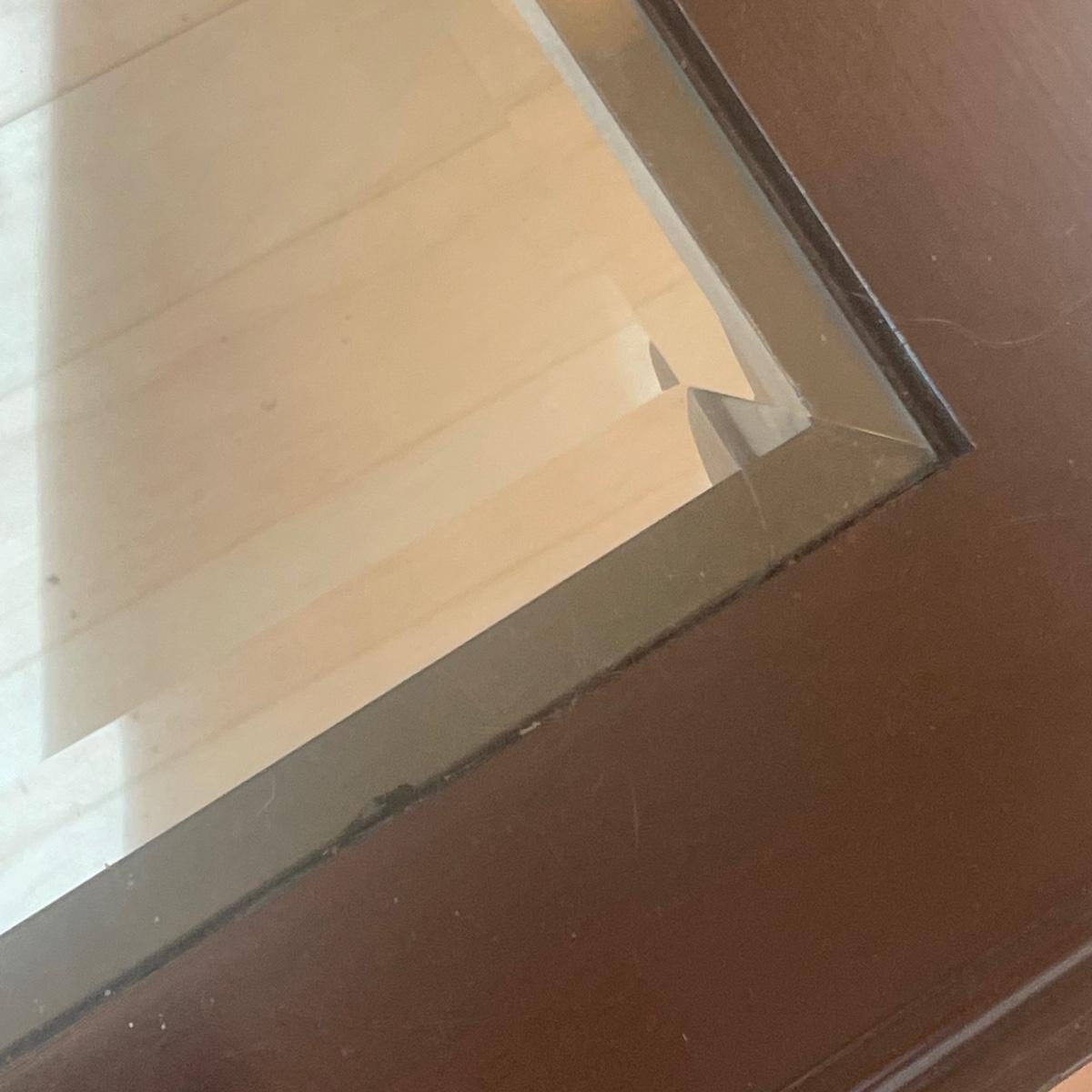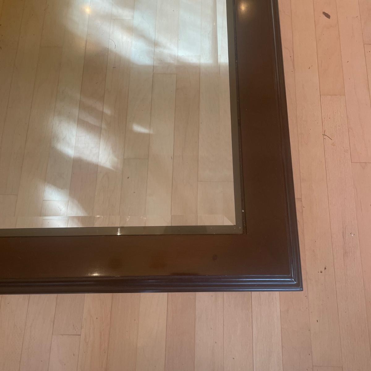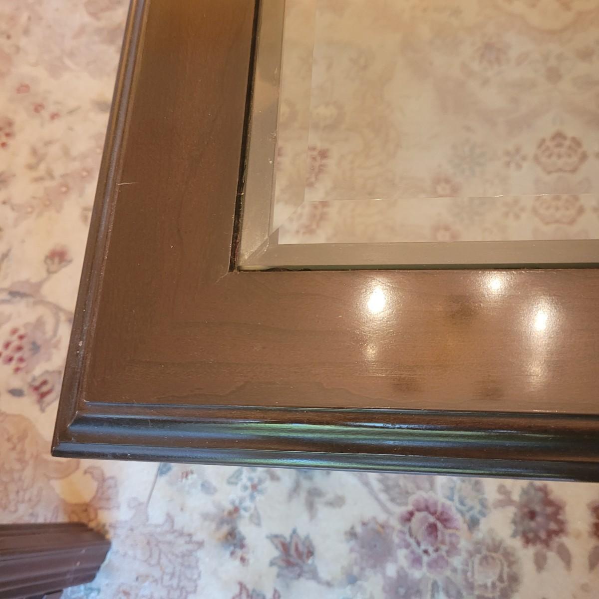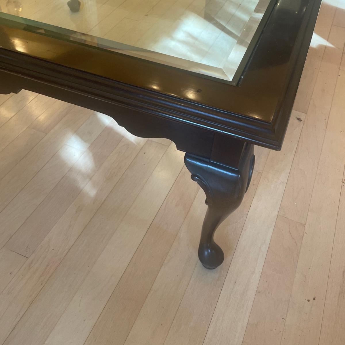 Large wooden coffee table with beveled glass top. In good condition with very few scuffs and scratches. Measures approximately 38"SQ x17"H. Local pickup only.