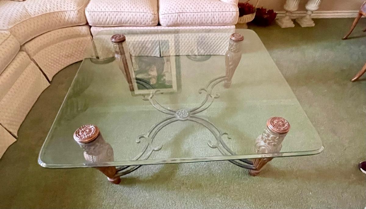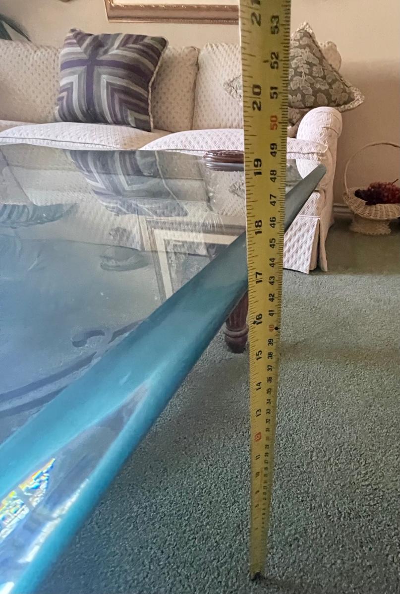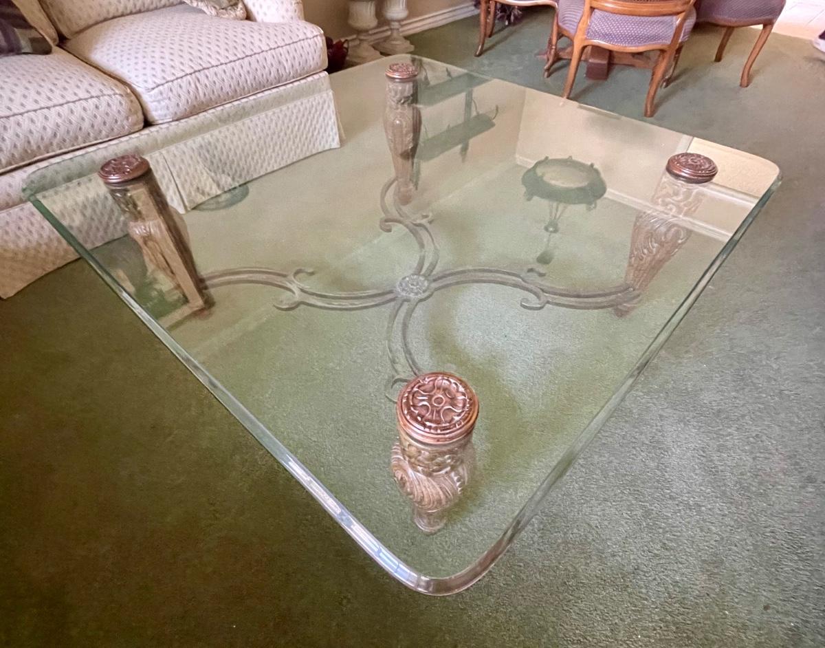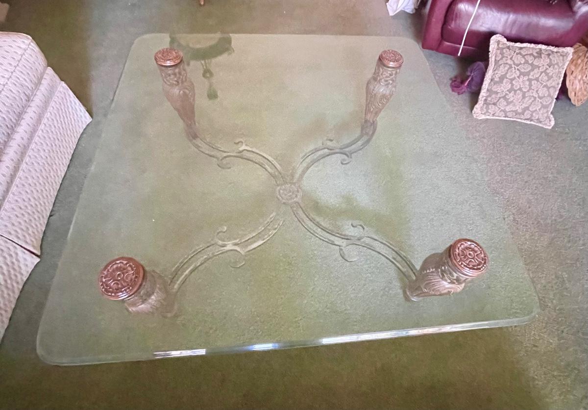 Approx. 48" x 48". Very thick glass, metal frame and wood legs. Approx. 18" tall.