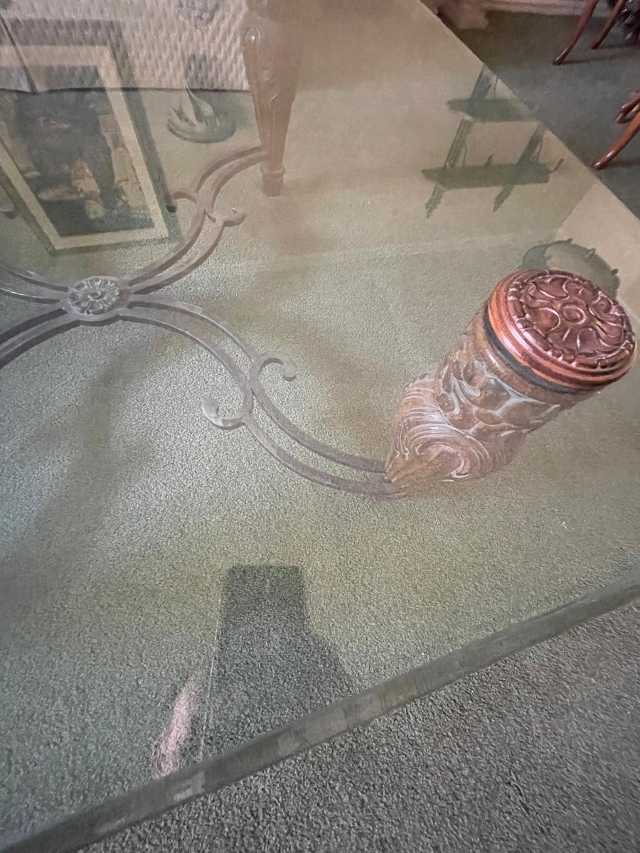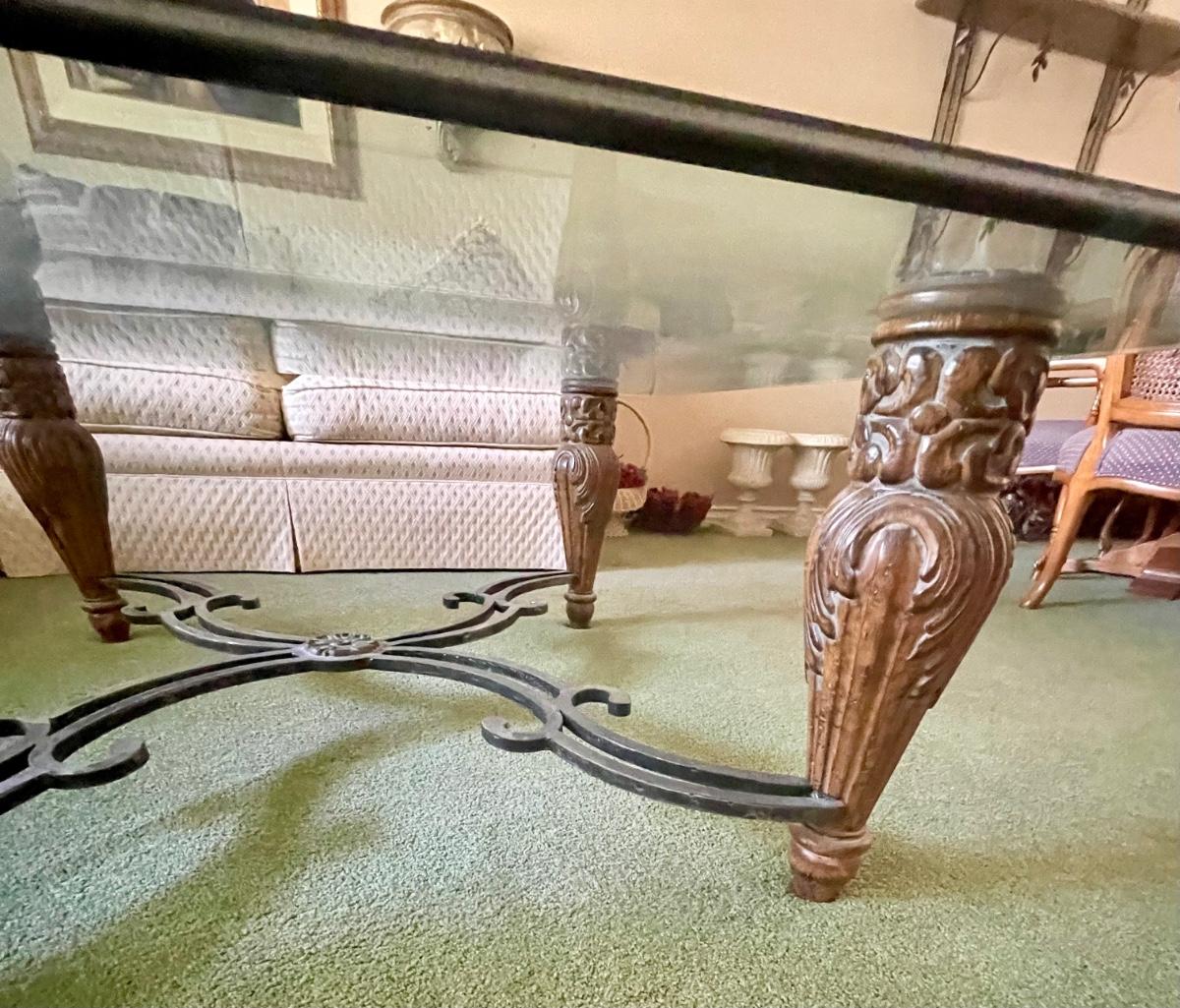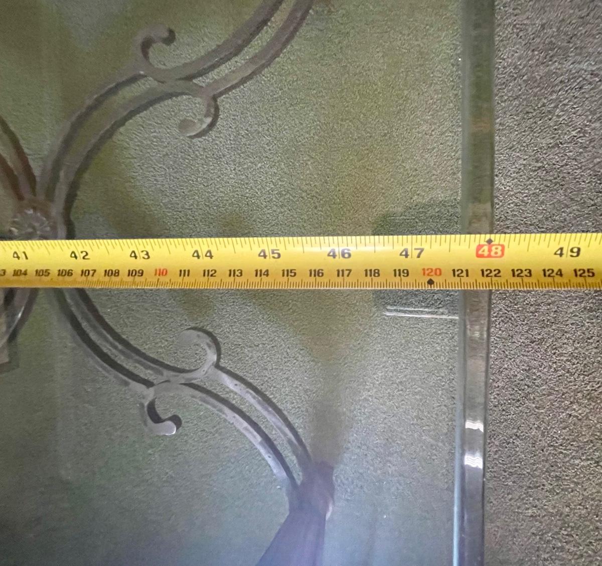 Approx. 48" x 48". Very thick glass, metal frame and wood legs. Approx. 18" tall.