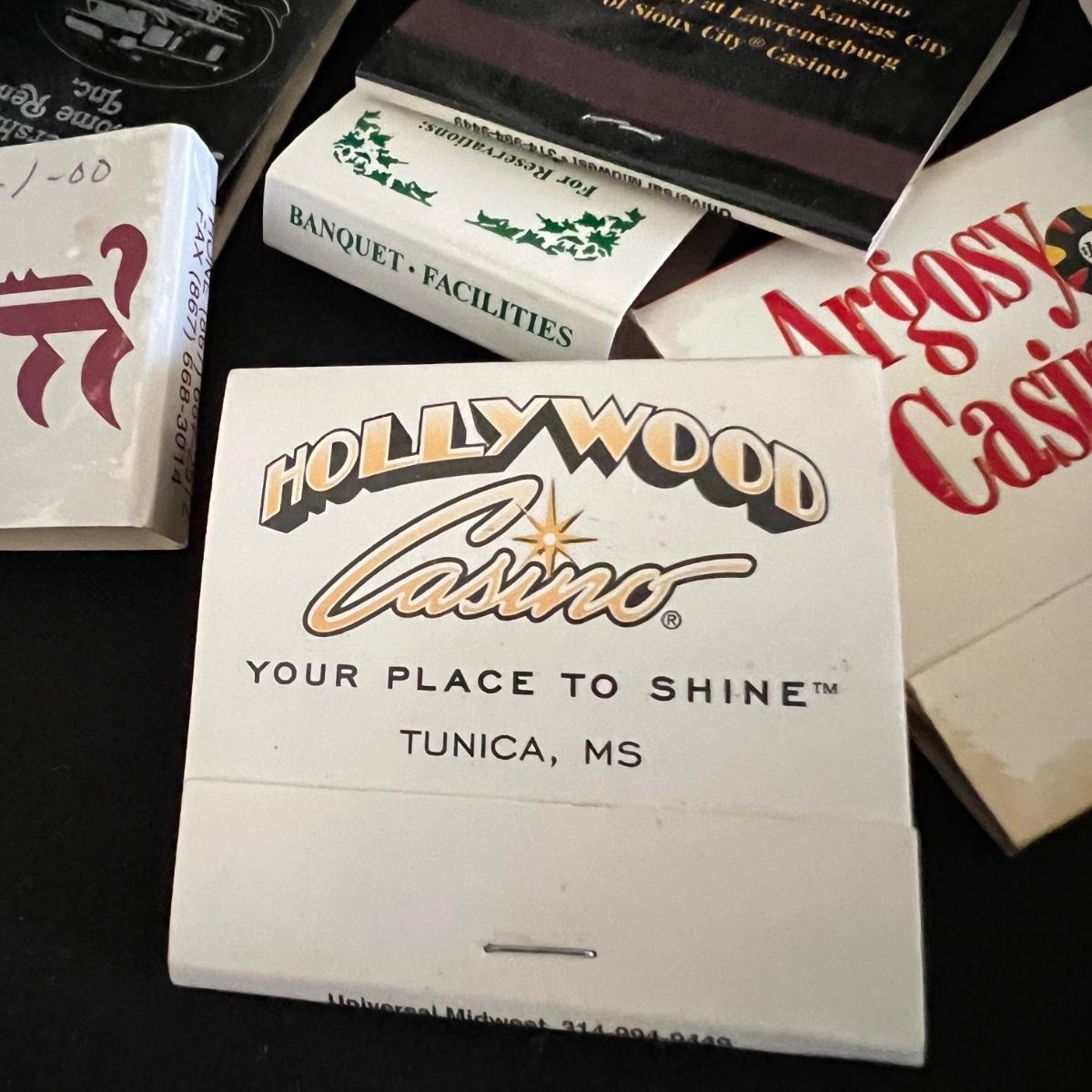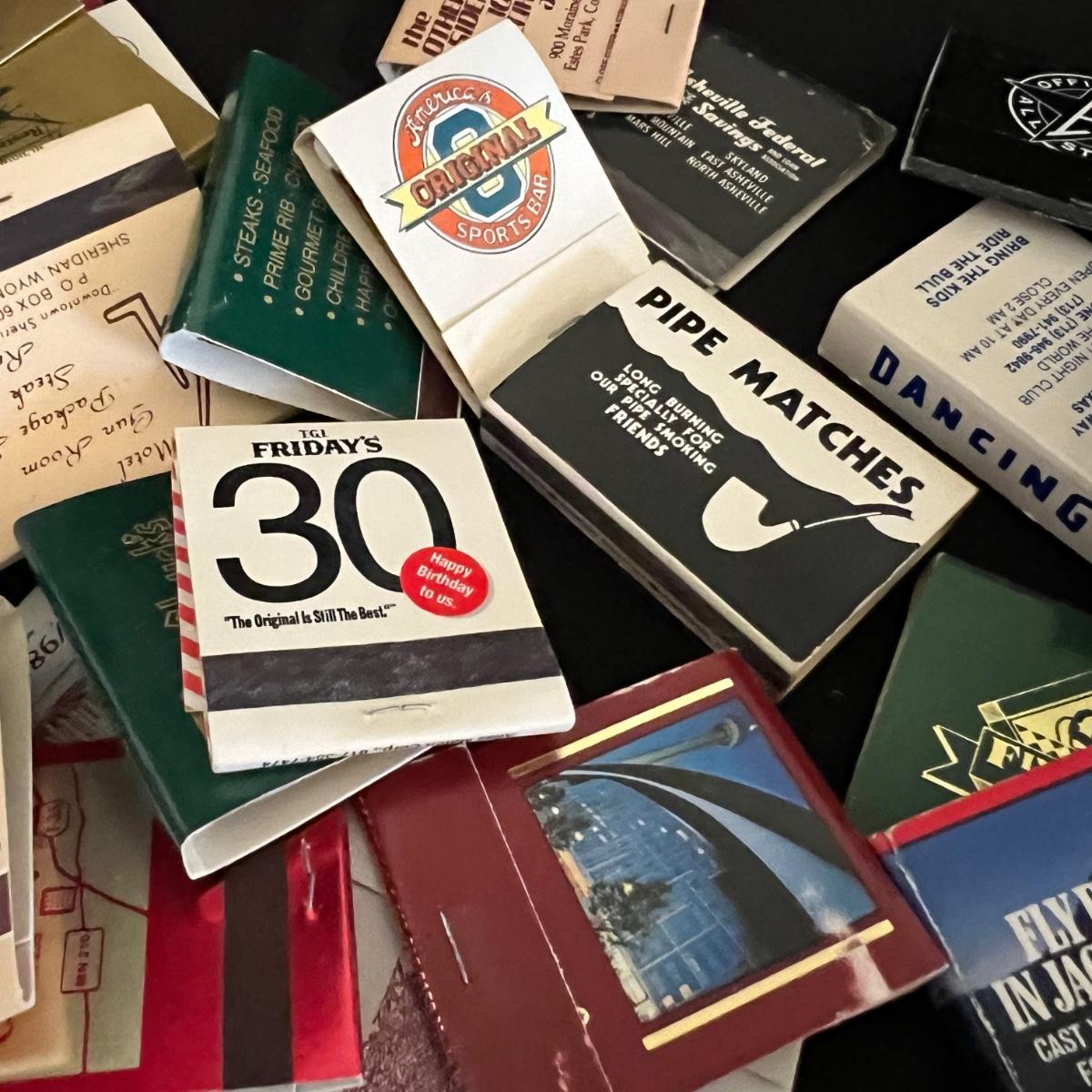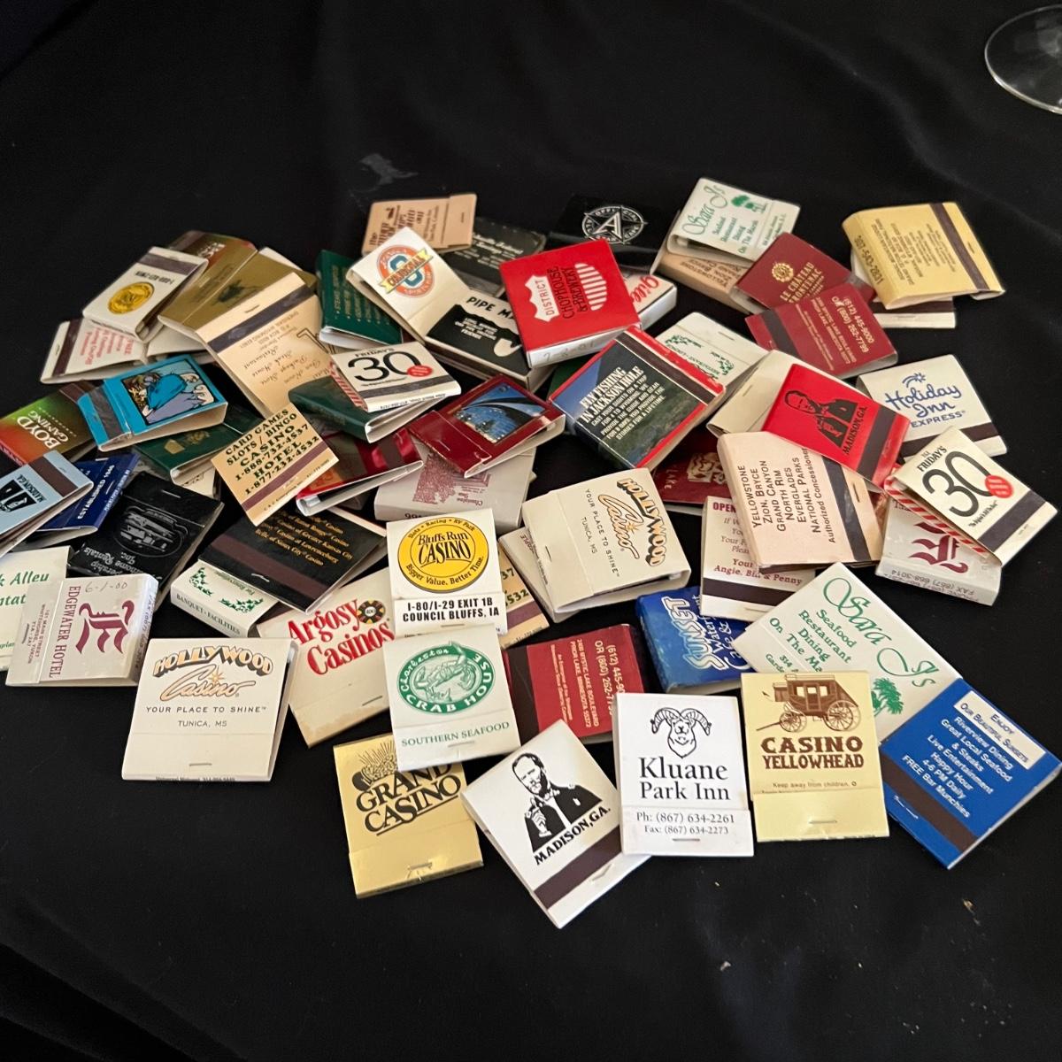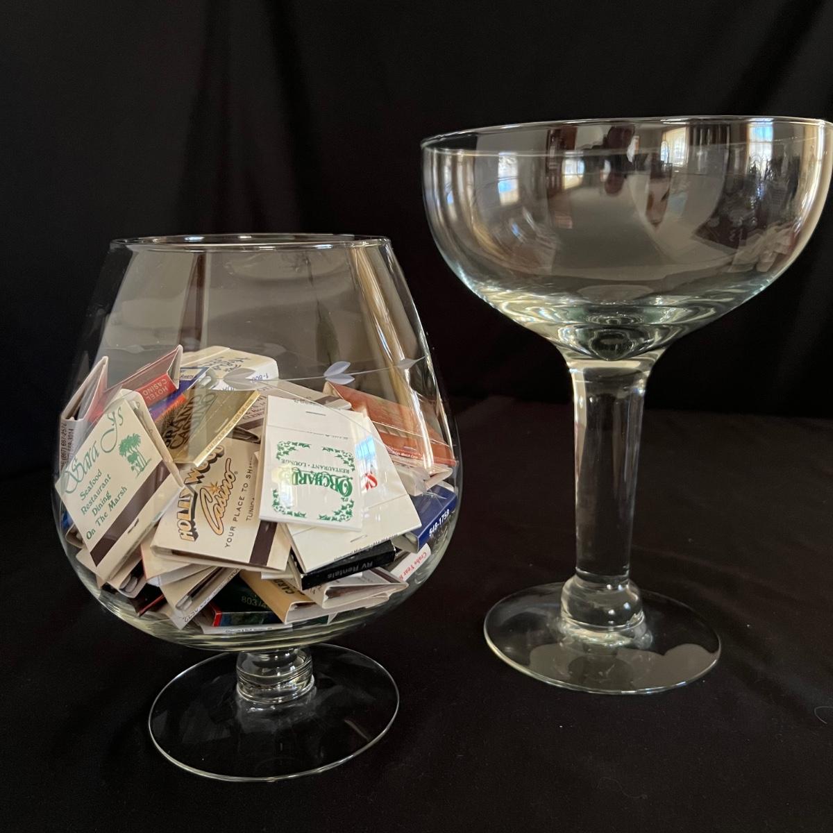 Both of these stemmed glasses/bowls are very large, tallest measuring 7.5” d x 11.5” high. Also included are over 50 matchbooks.