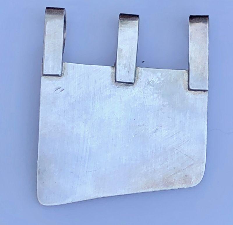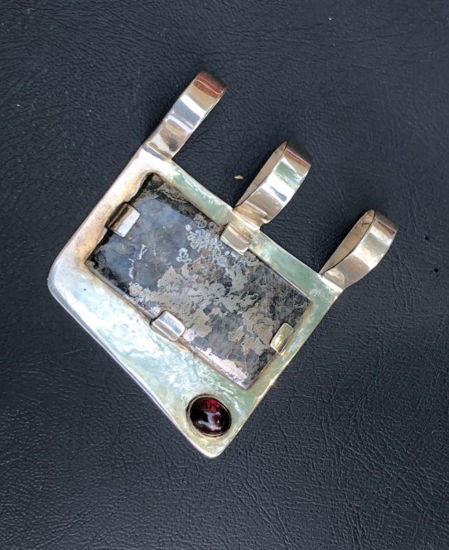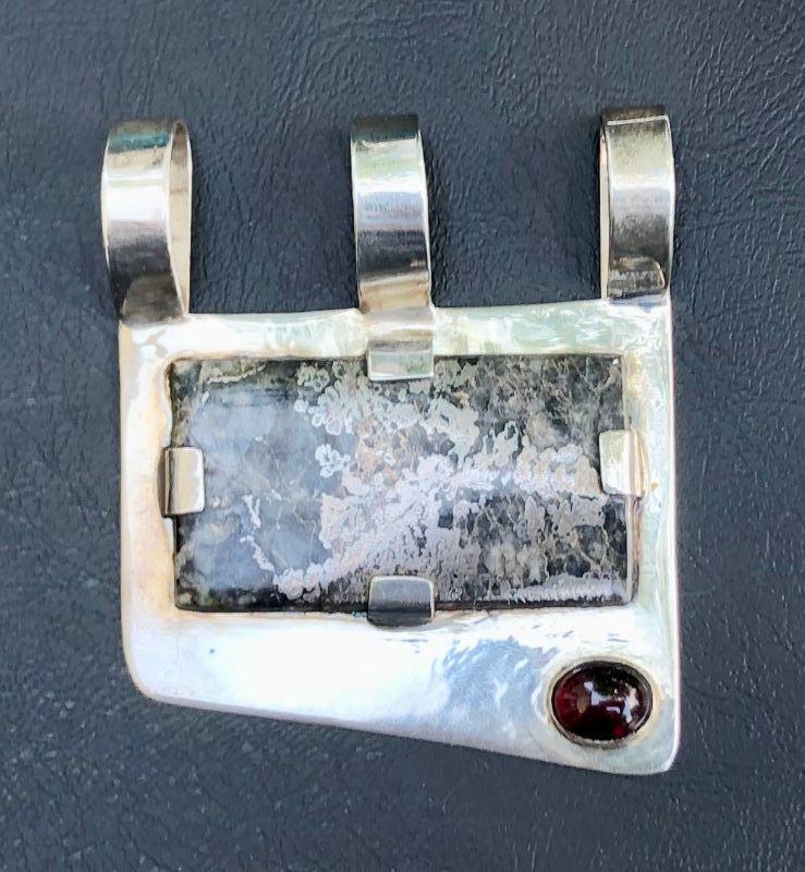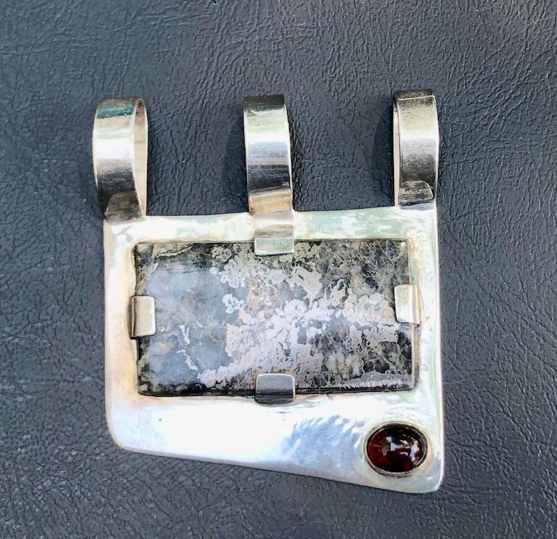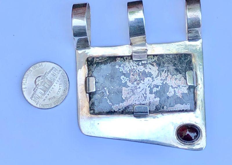 Artist Sterling Silver Modernist Abstract Pendant with Elongated 1.875" Hematite Stone and Cabochon Garnet. No Markings.