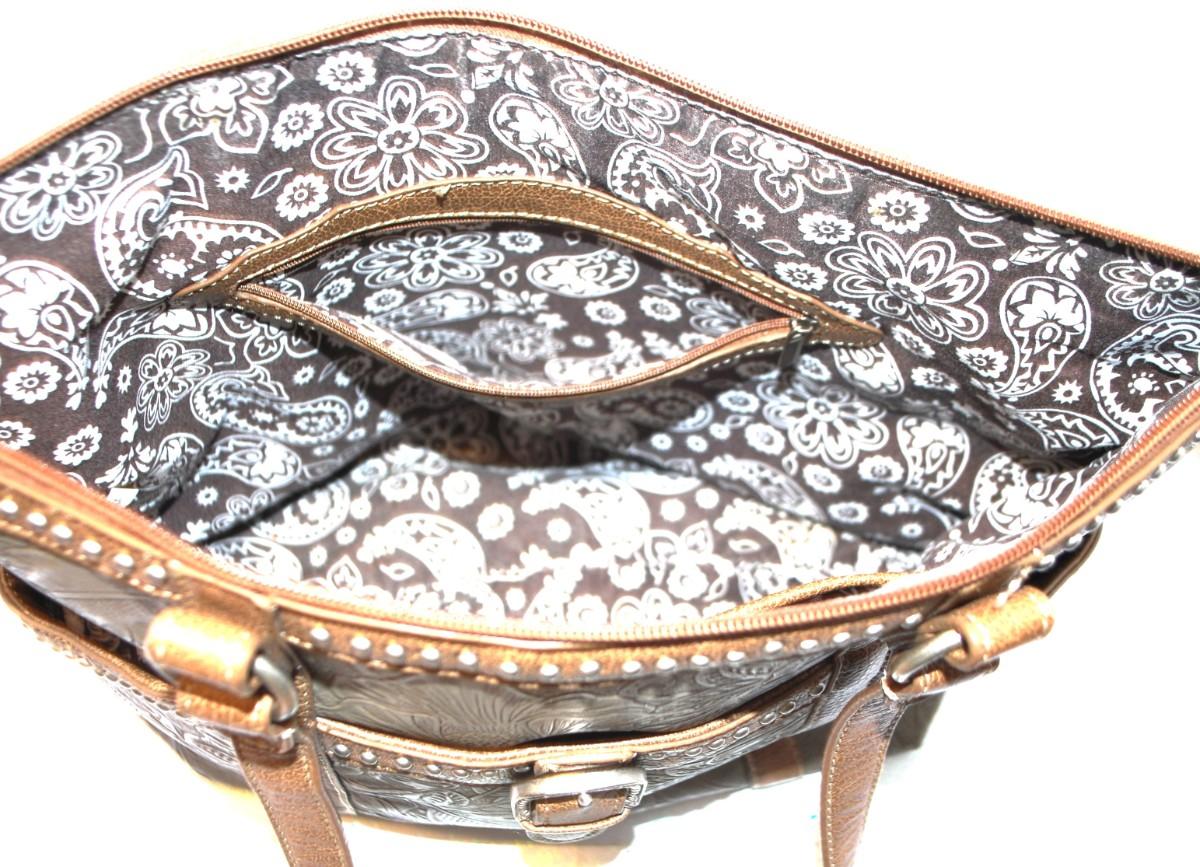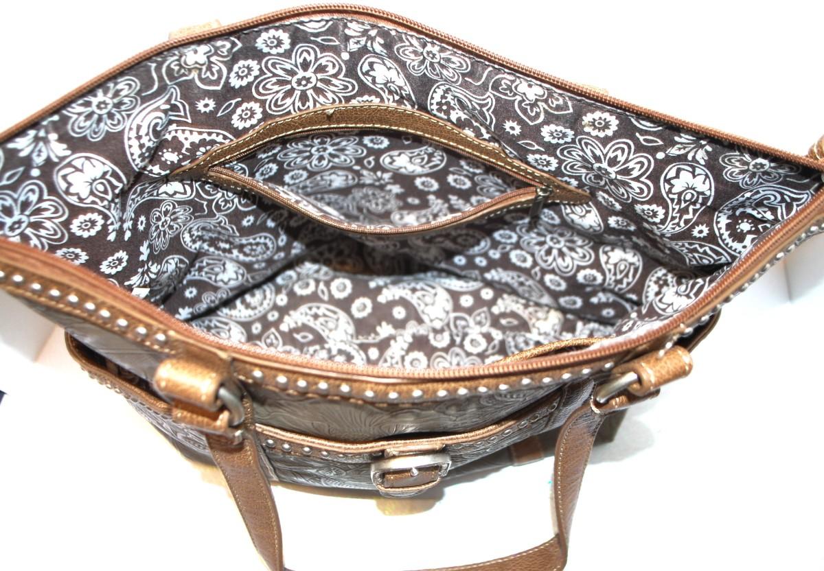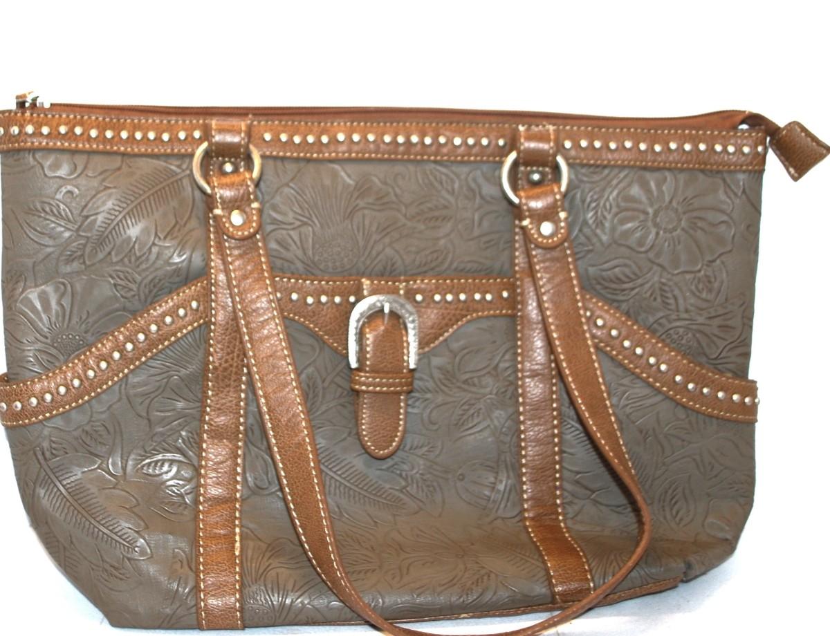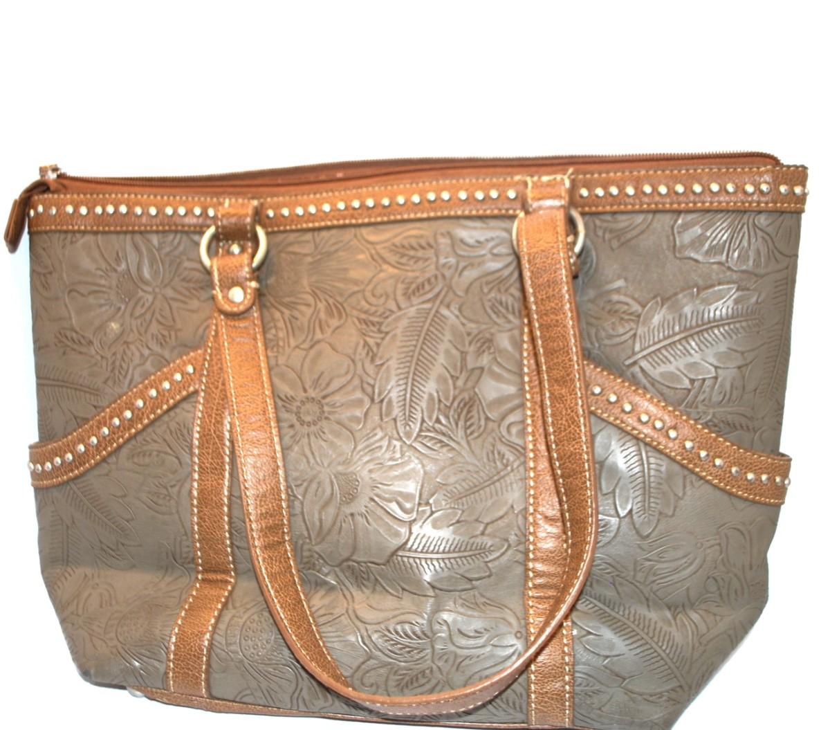 Large Studded Strap Purse with Flower Embossed Sides & Multiple Pockets 15" x 10" + Opens to 10"