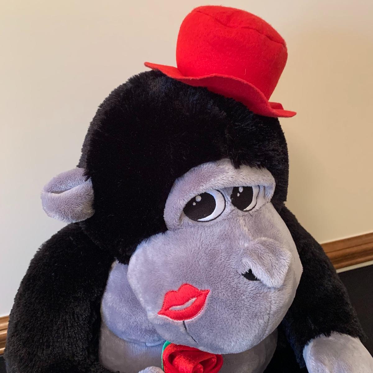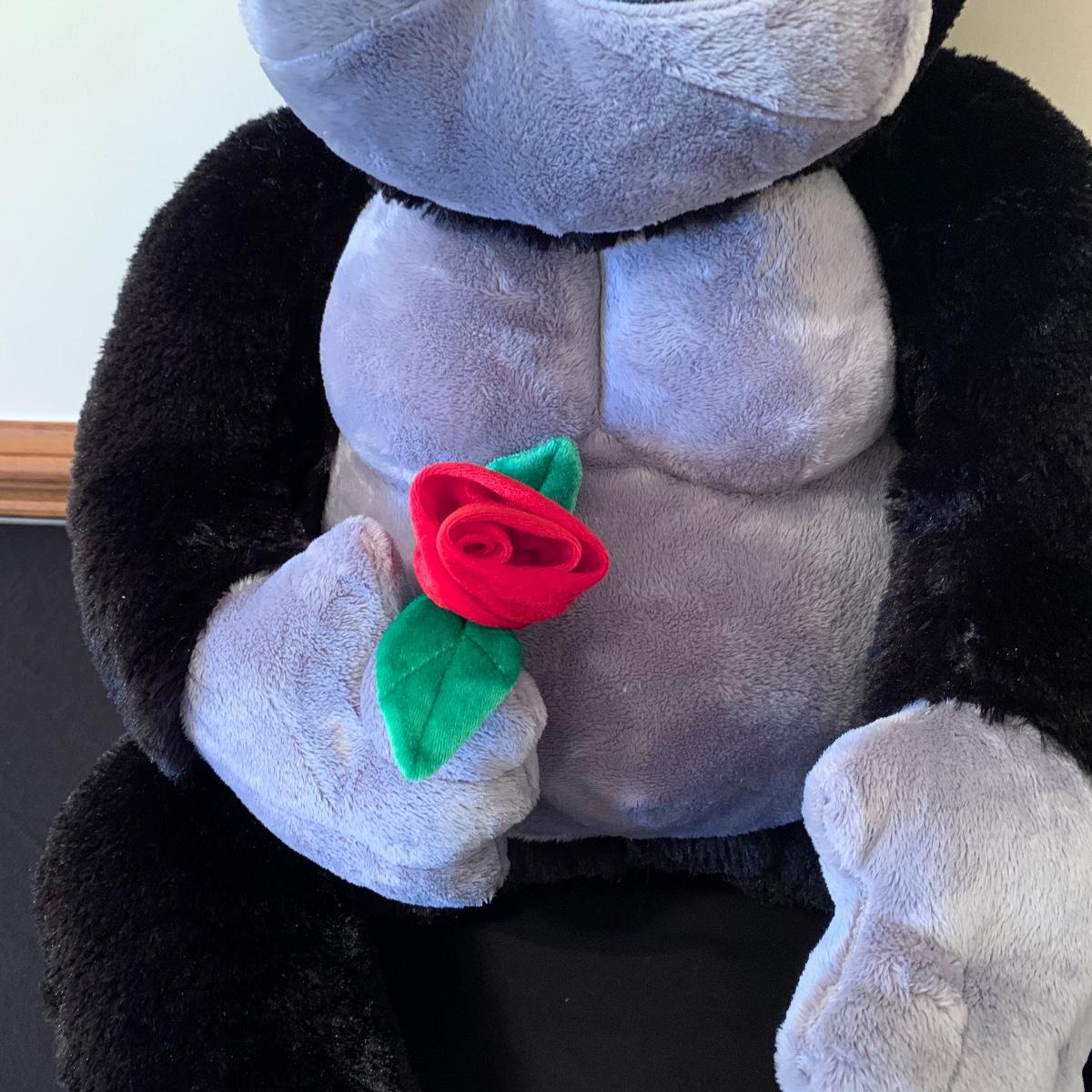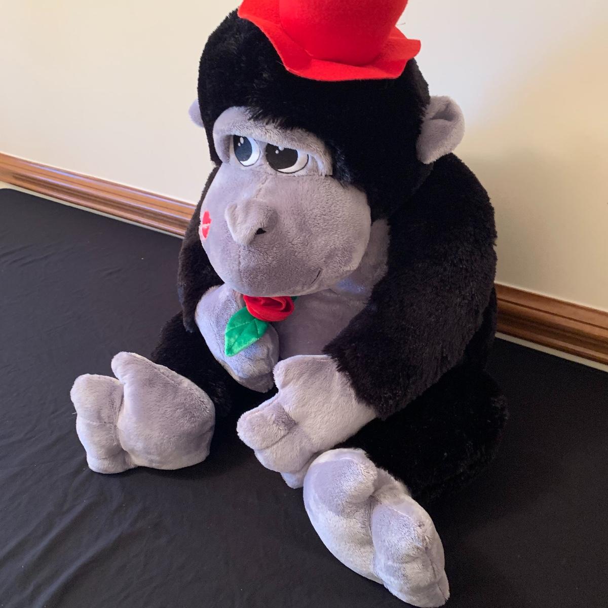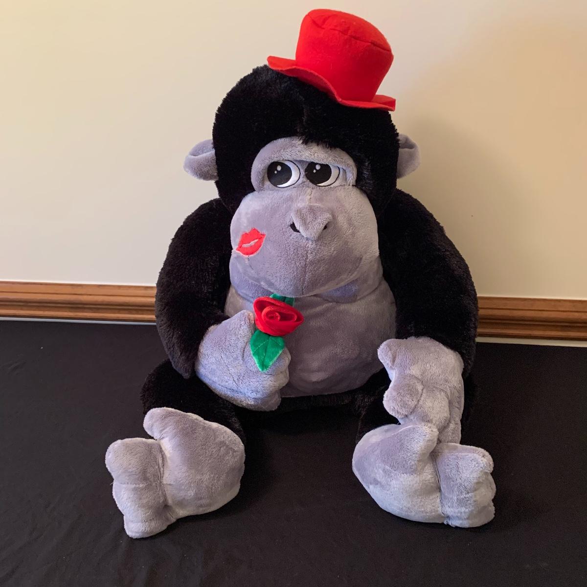 This is a large Dan Dee Collector’s Choice stuffed plush gorilla. He’s wearing a hat, holding a rose, and has a kiss on the cheek. It measures approximately 22” across and 23.5” tall. Local pickup only.