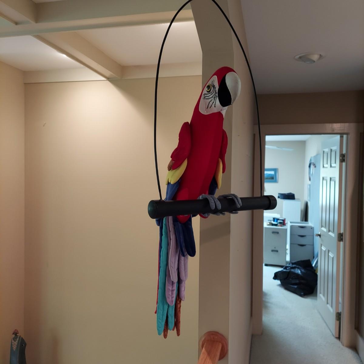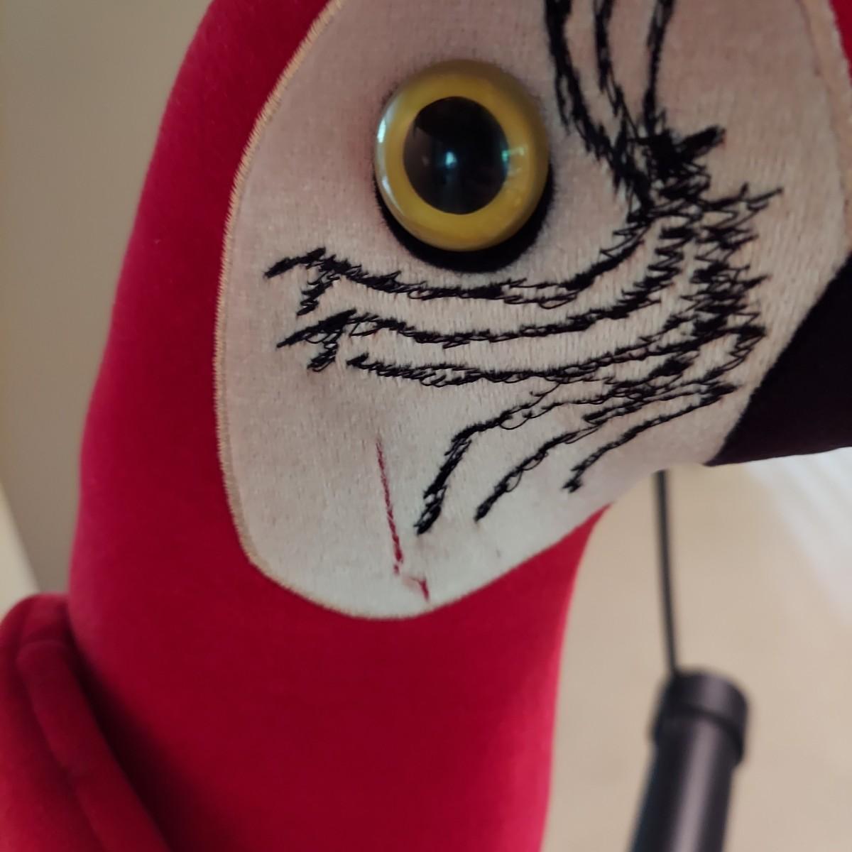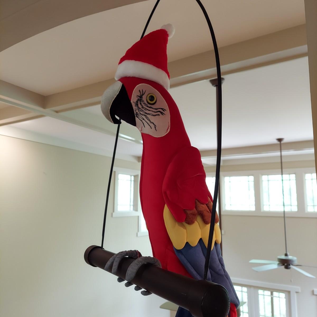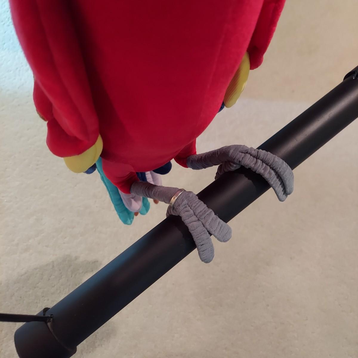 Large stuffed novelty parrot on a perch. Has three costumes. Measures approximately 19 x 12 x 44"H. Shipping available.