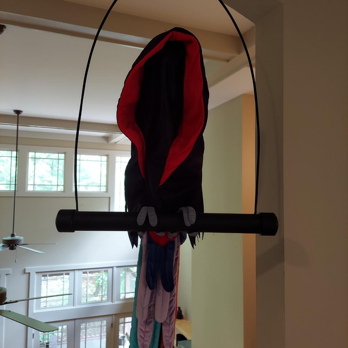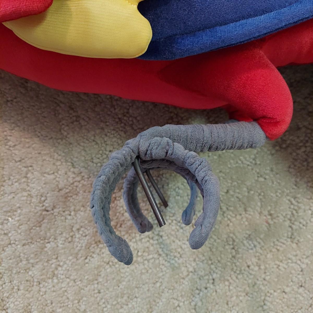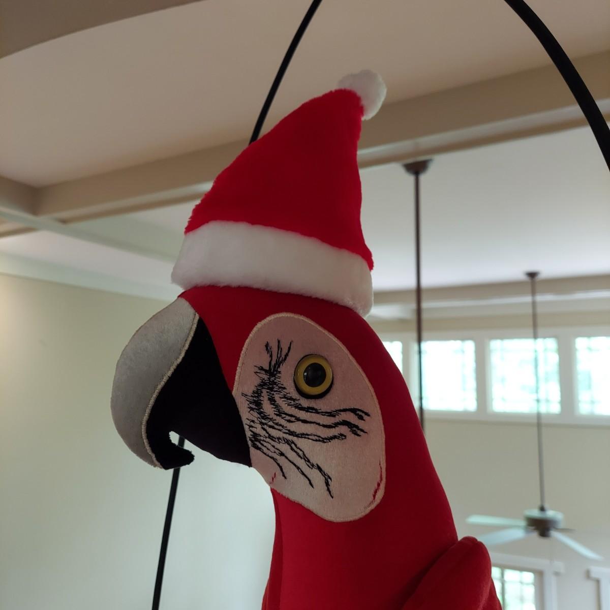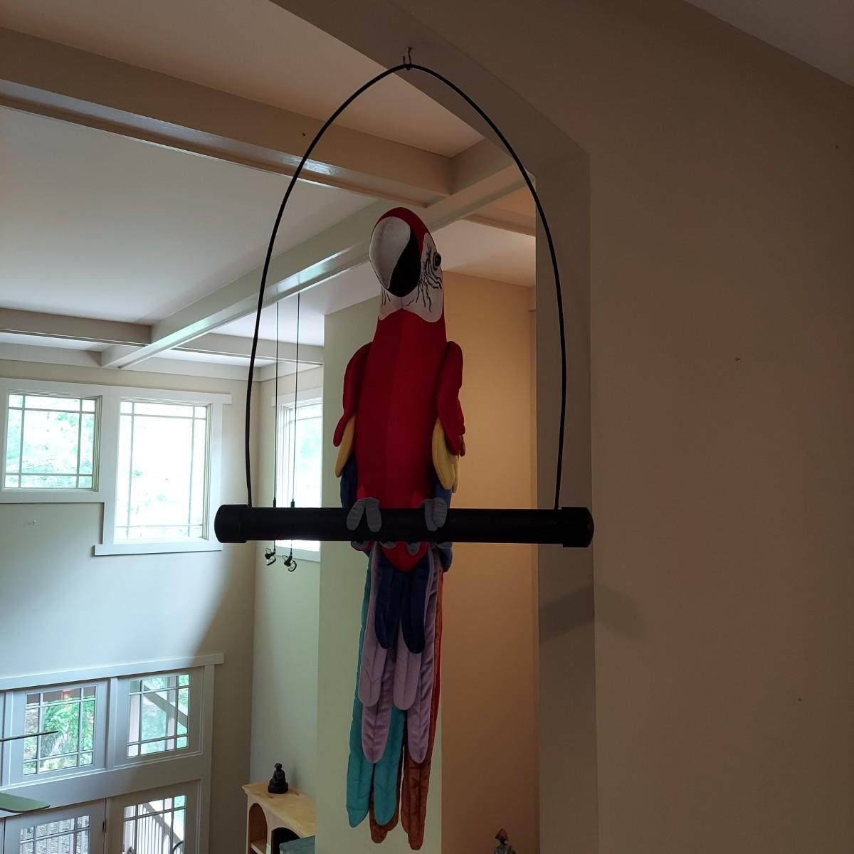 Large stuffed novelty parrot on a perch. Has three costumes. Measures approximately 19 x 12 x 44"H. Shipping available.