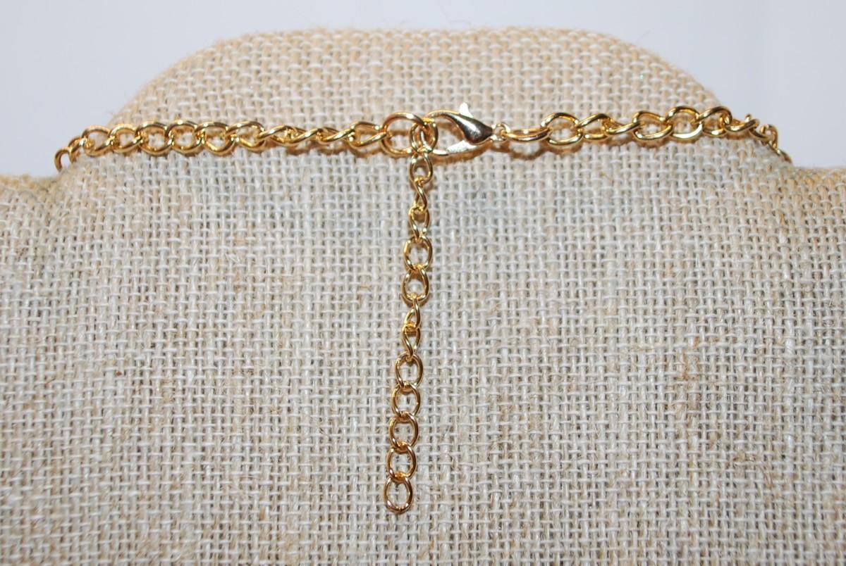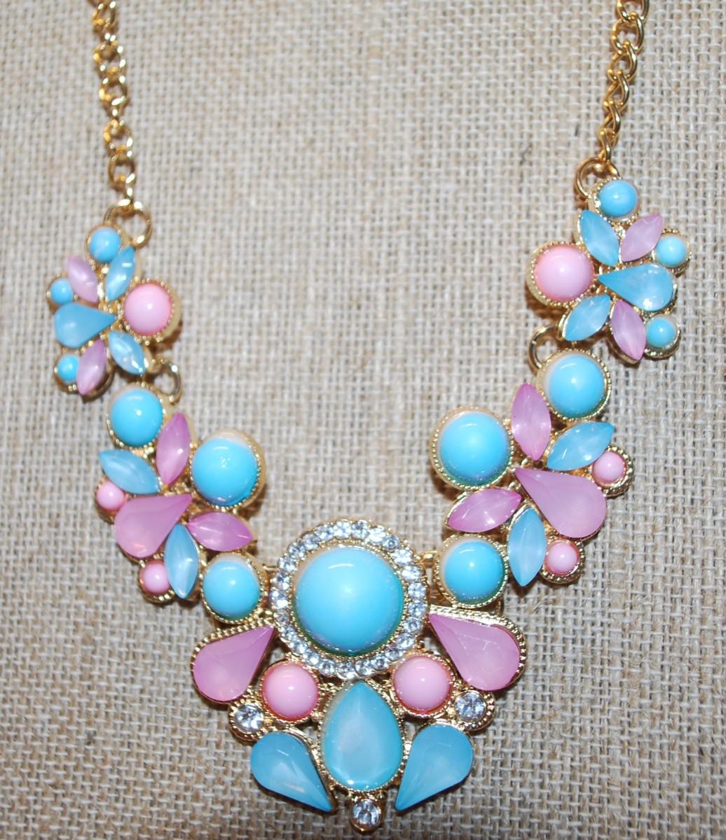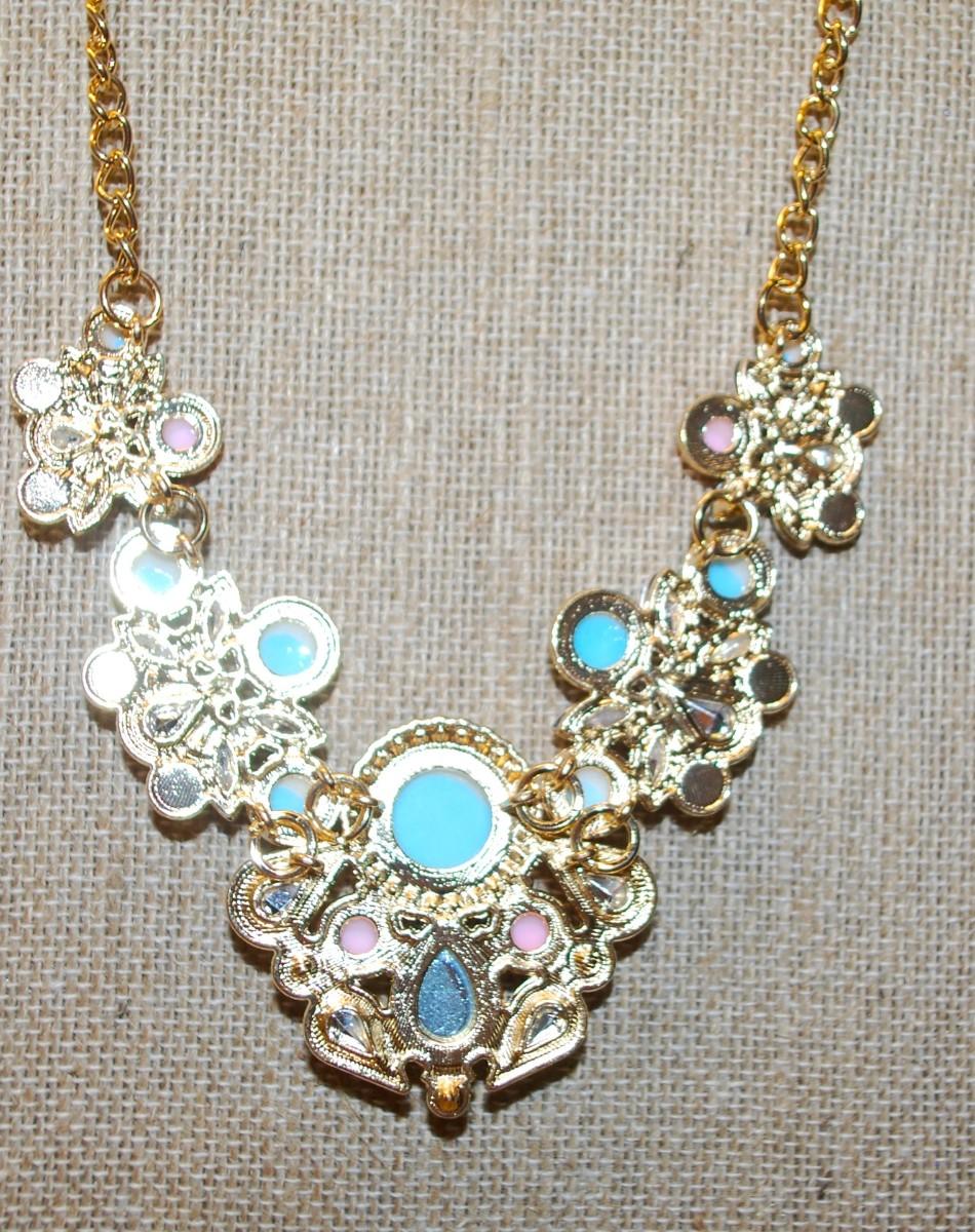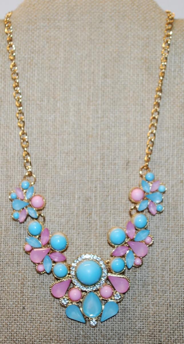 Large Swag Style Necklace (4½" x 2½") with Pink & Blue Stones on a Gold Tone Necklace Chain 14" L