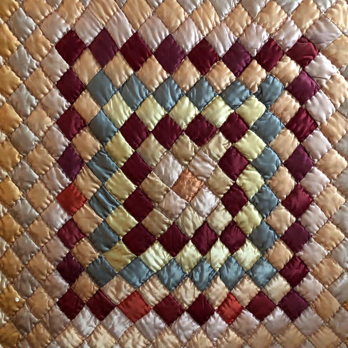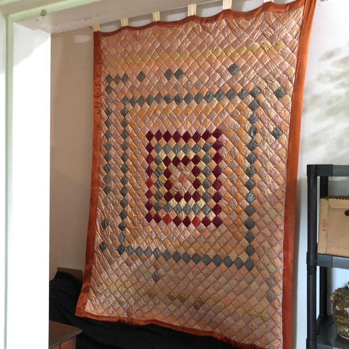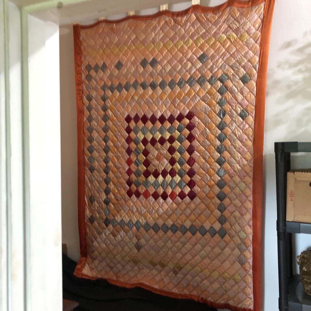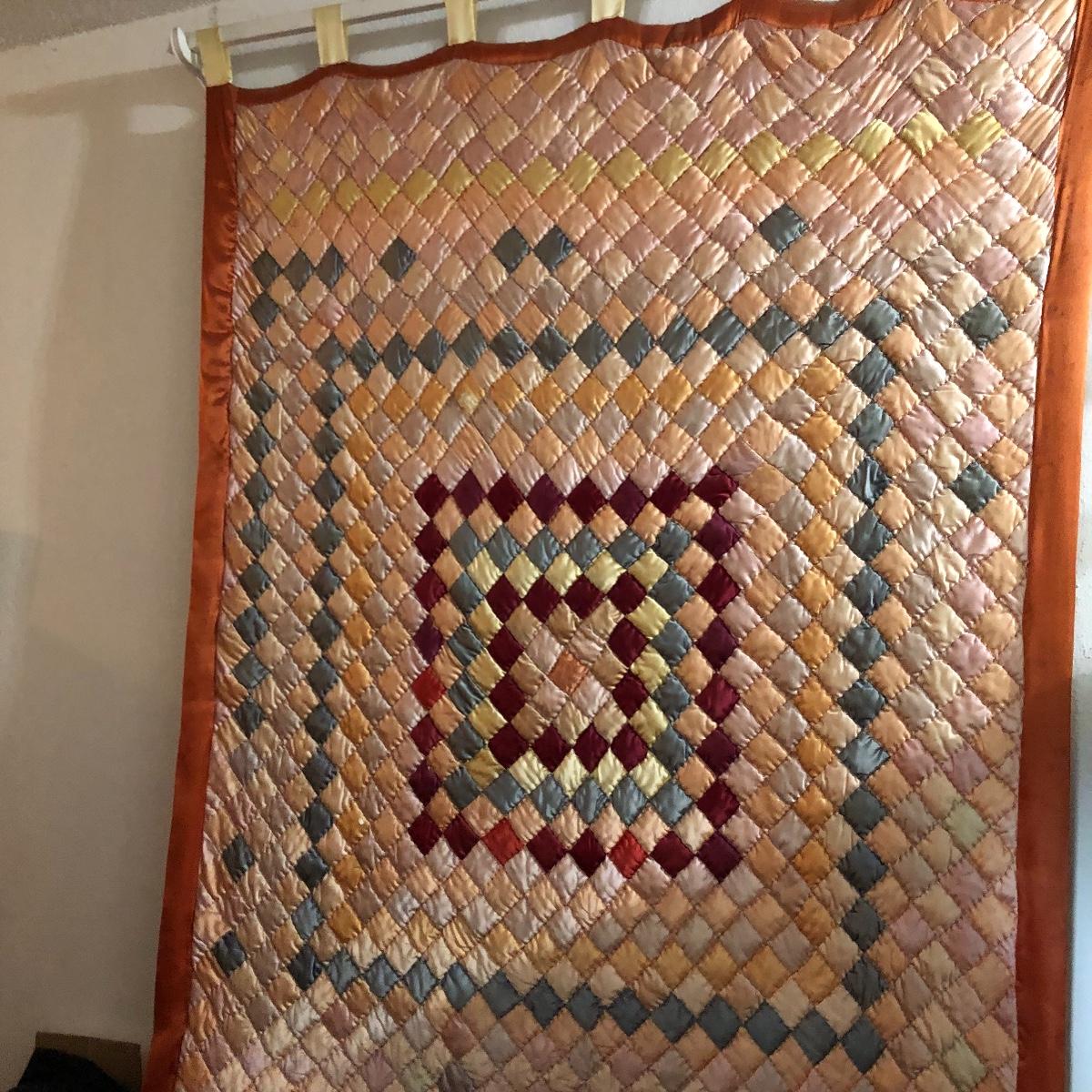 This large quilt is a combination of yellow, maroon, blue, peach, pink colors in a Diamond pattern. Quilt has some wear on side and back, see pictures. Quilt measures 59” x 88”. Rod not included.