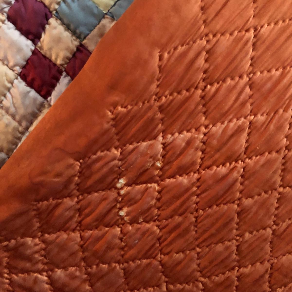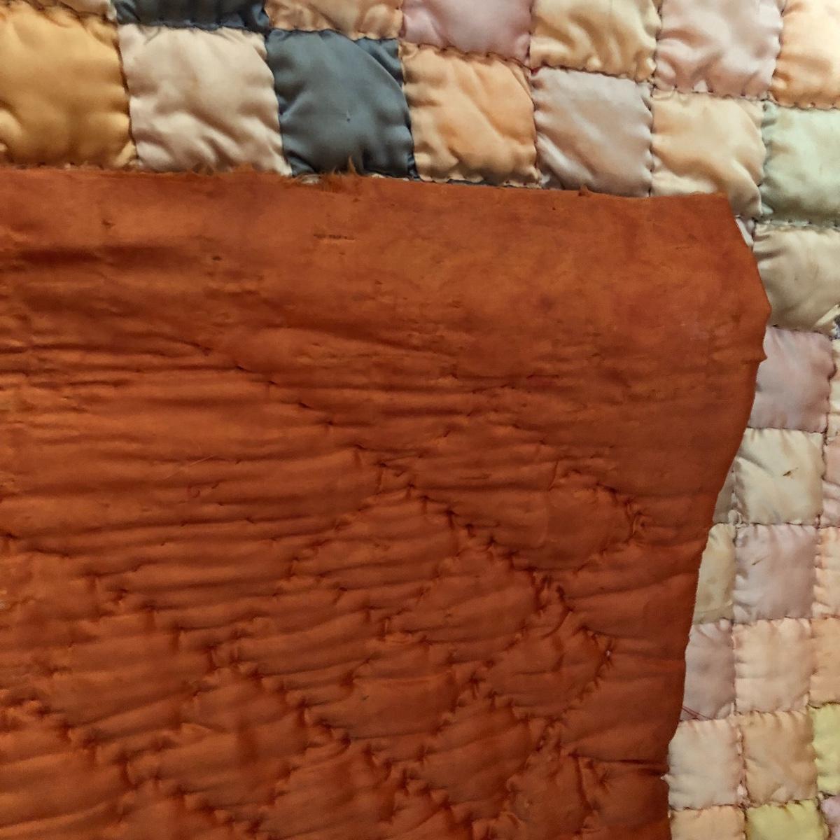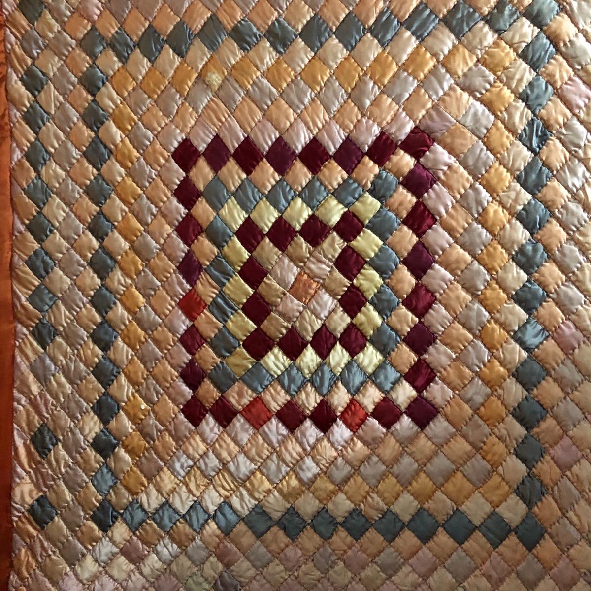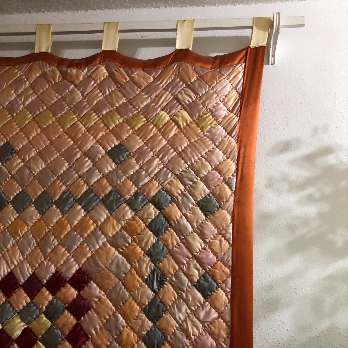 This large quilt is a combination of yellow, maroon, blue, peach, pink colors in a Diamond pattern. Quilt has some wear on side and back, see pictures. Quilt measures 59” x 88”. Rod not included.