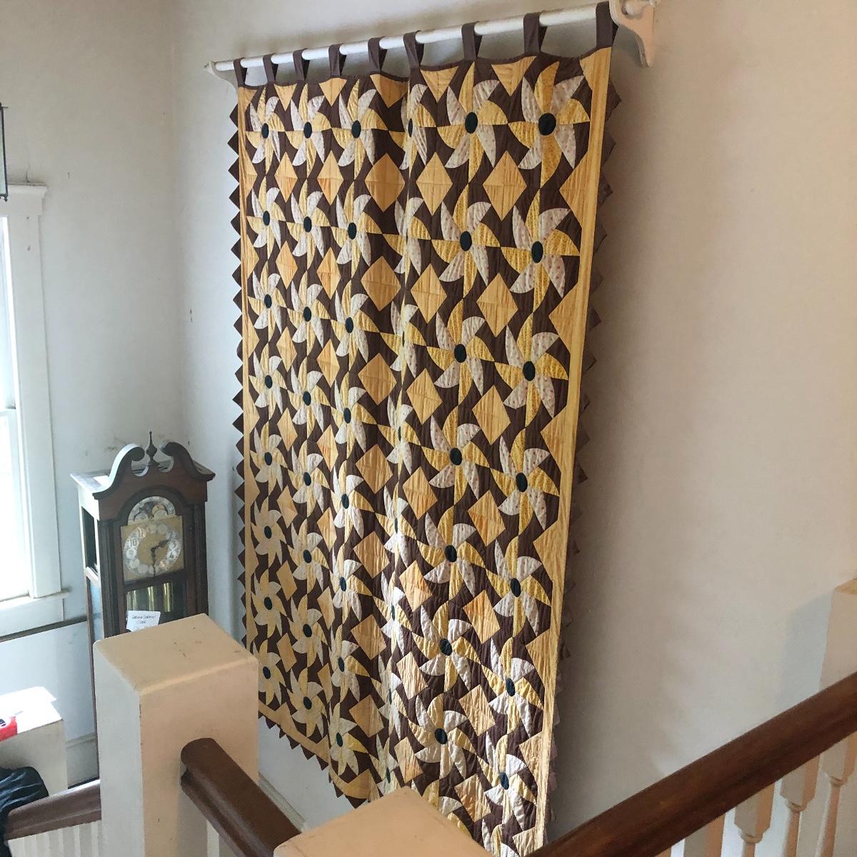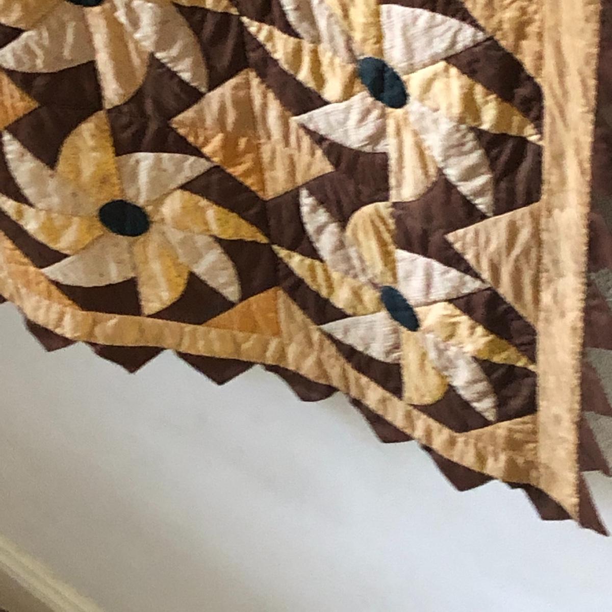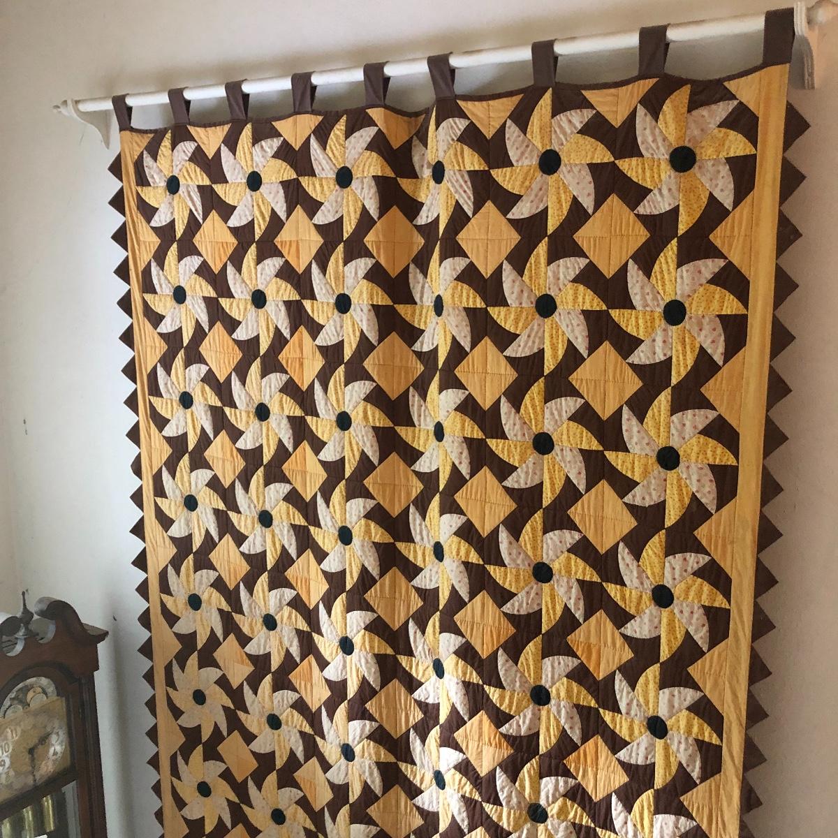 This huge quilt is a combination of brown, yellow and cream colors. It has a few minor signs of age with a few stains shown in images. Rod is not included.
