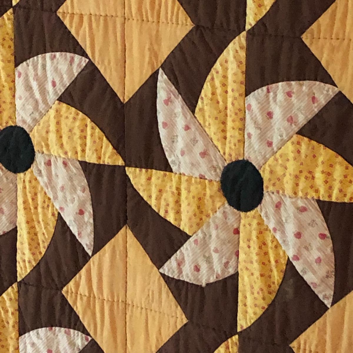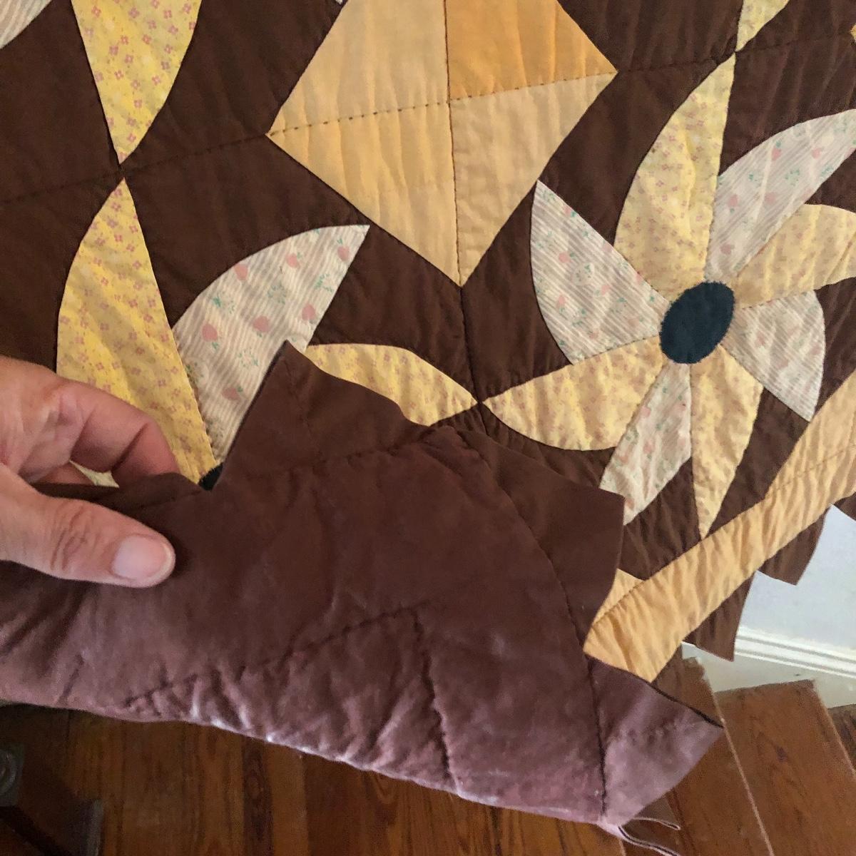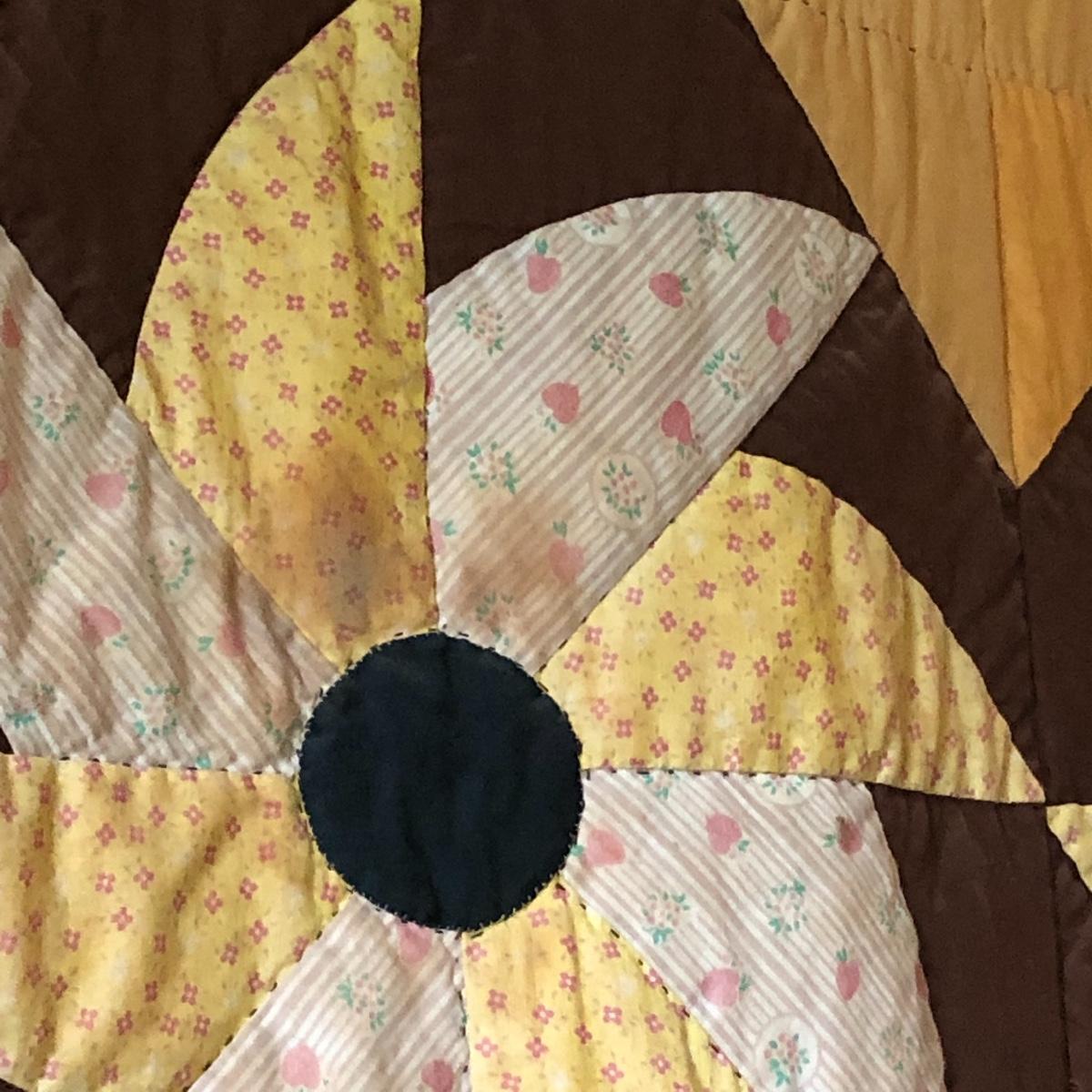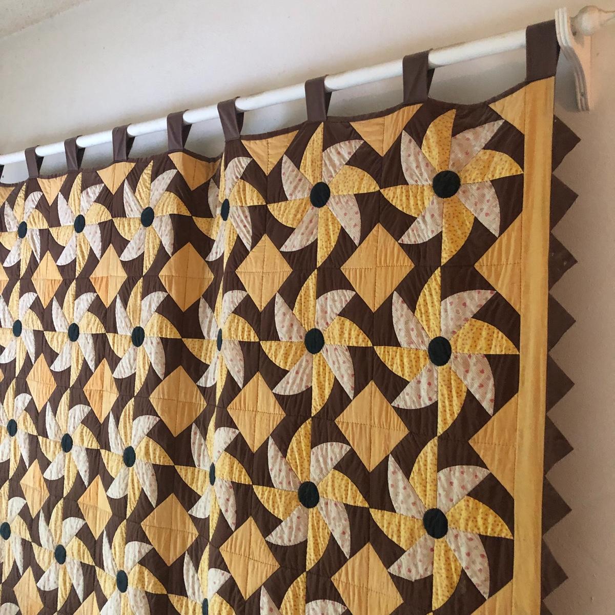 This huge quilt is a combination of brown, yellow and cream colors. It has a few minor signs of age with a few stains shown in images. Rod is not included.
