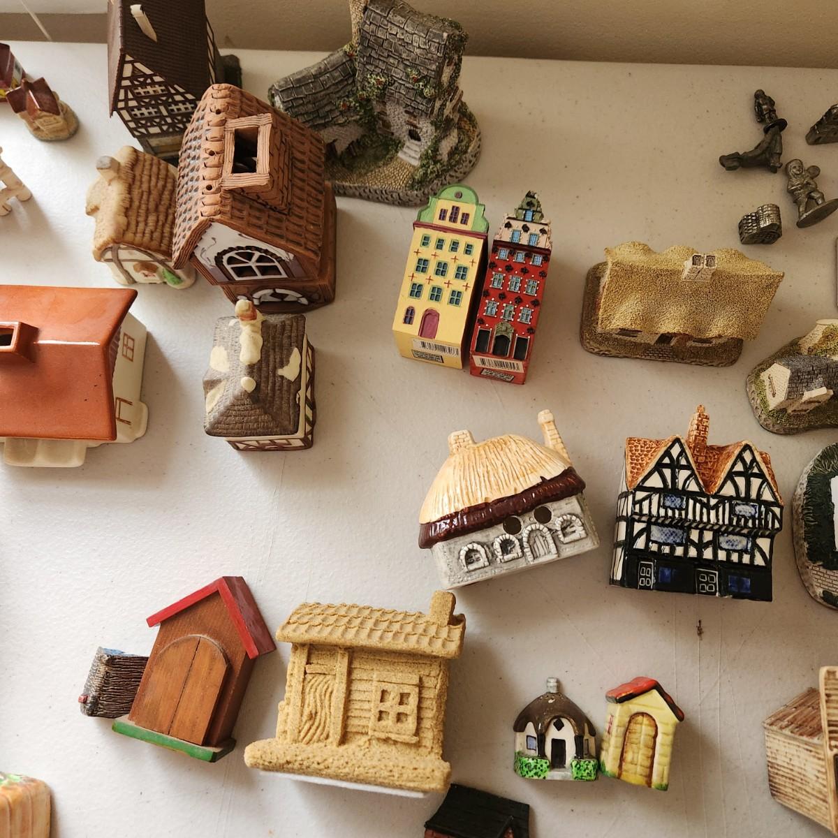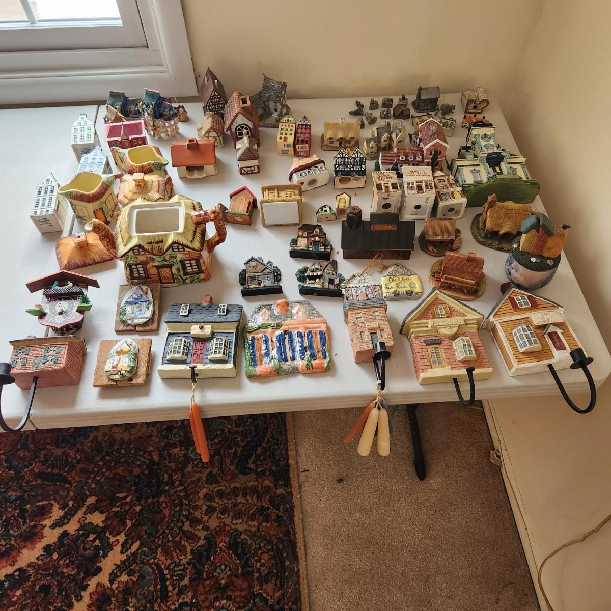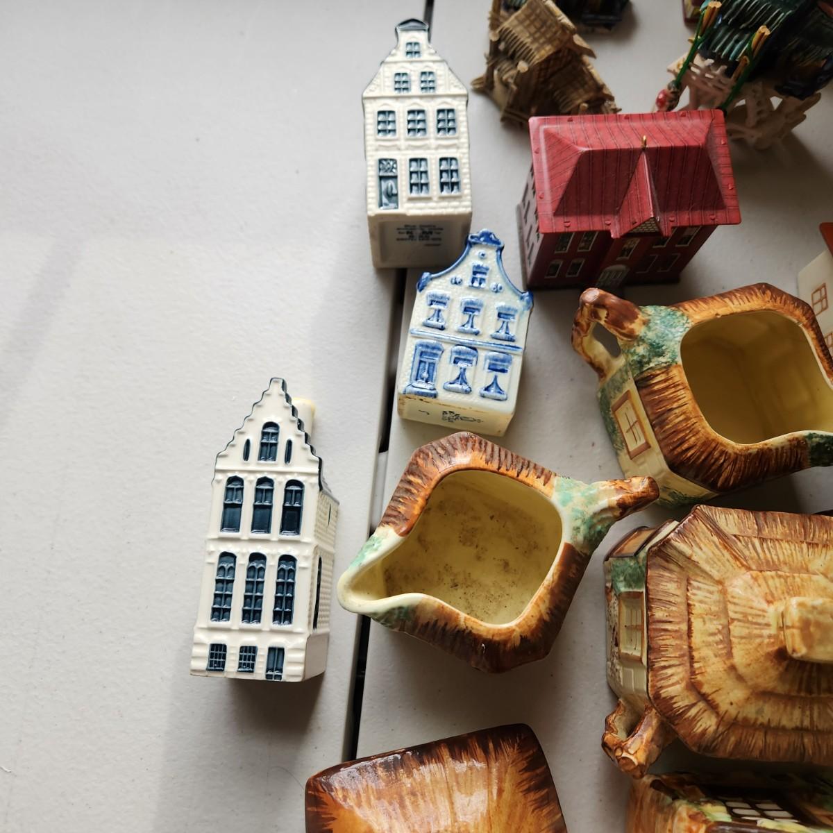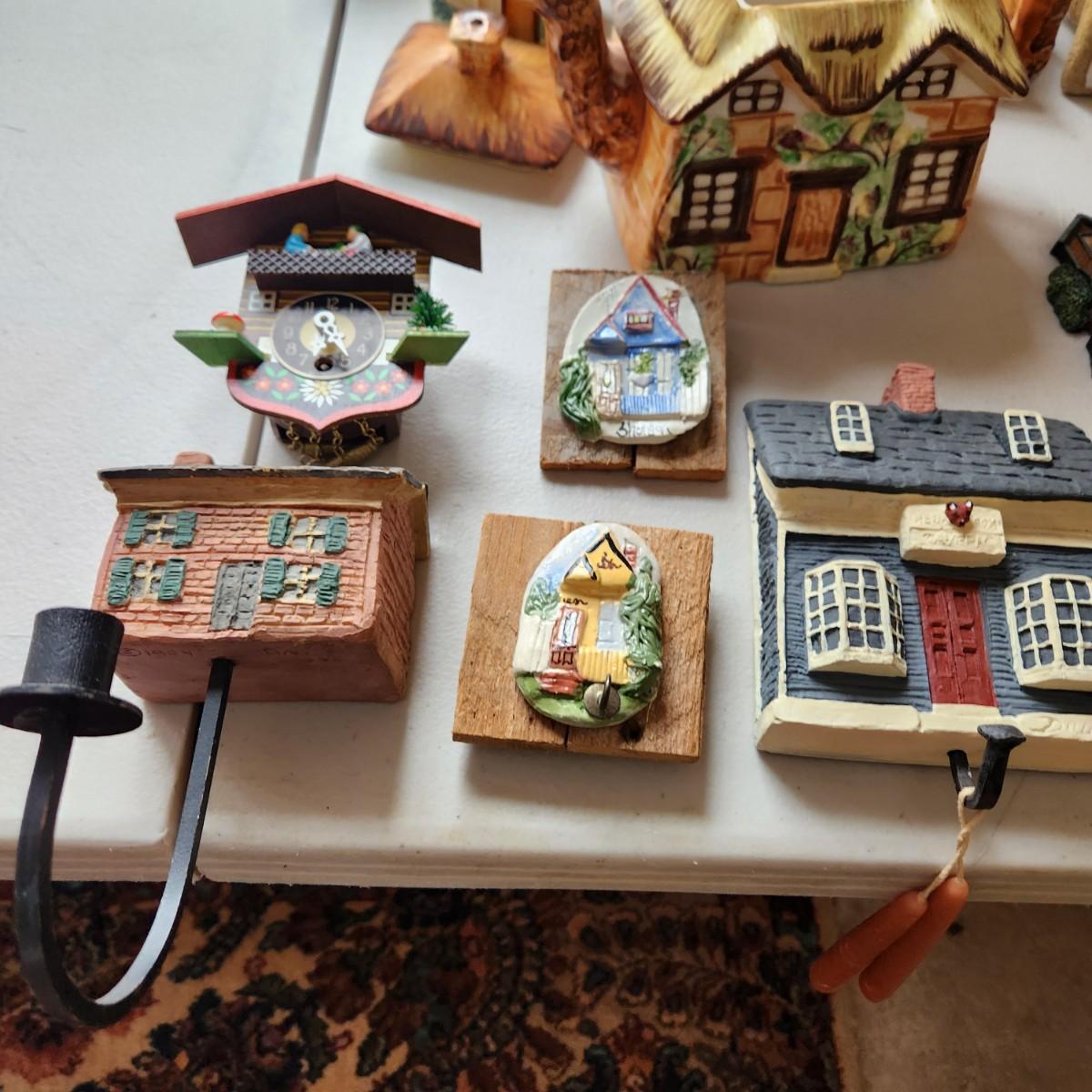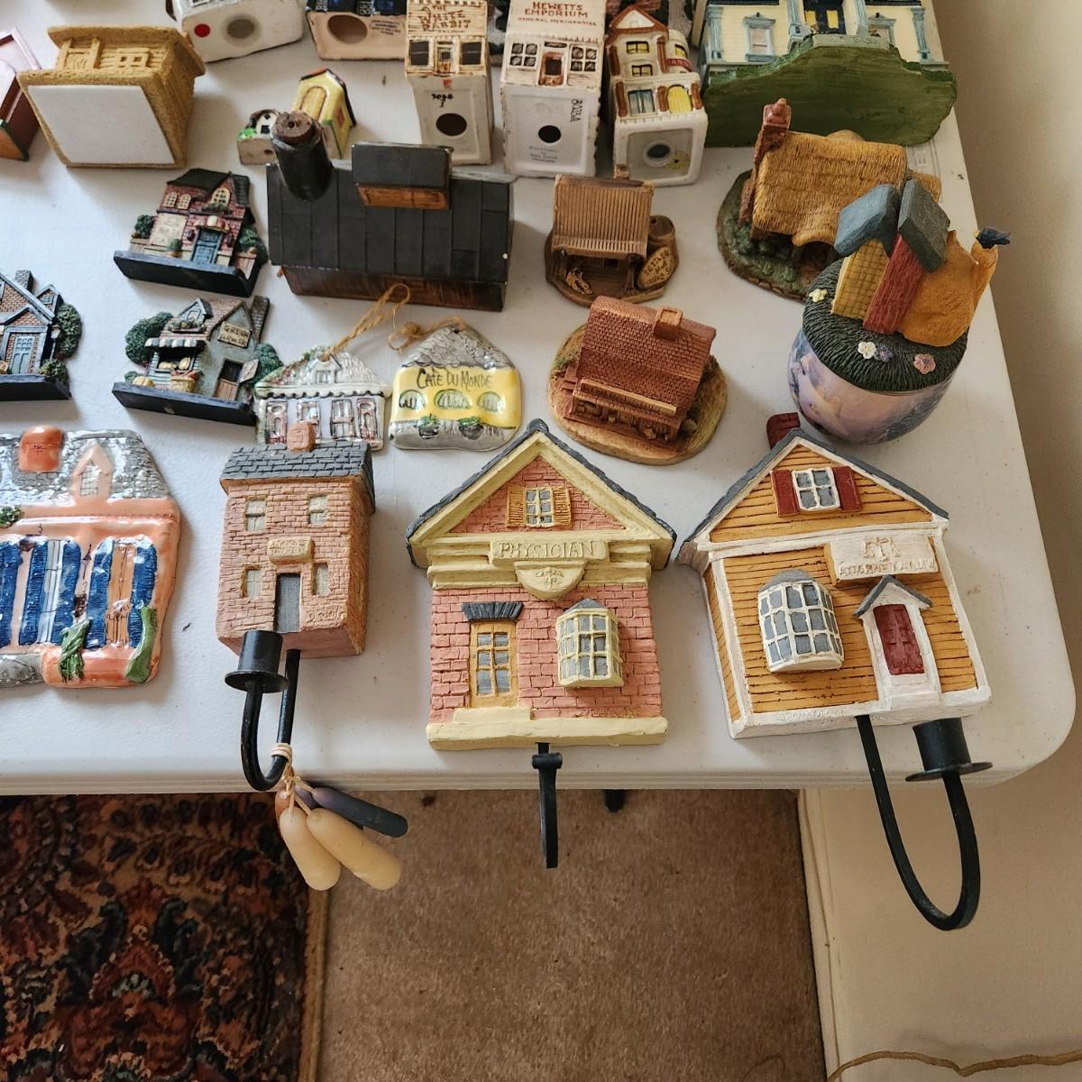 Large Table lot of Collectibles Small Buildings, Clock, Wall hooks, Occupied Japan items, KLM Dutch Airlines Houses