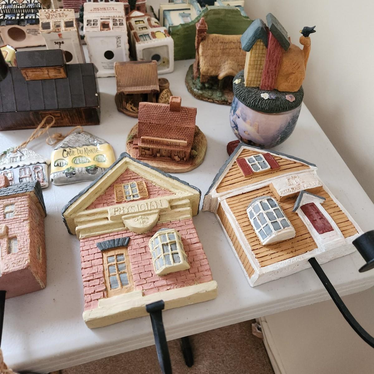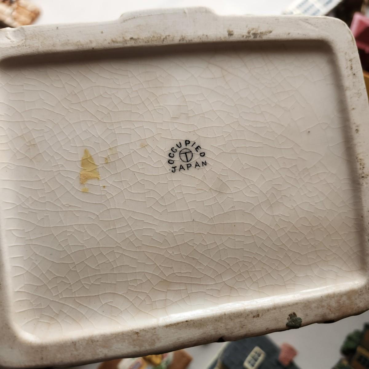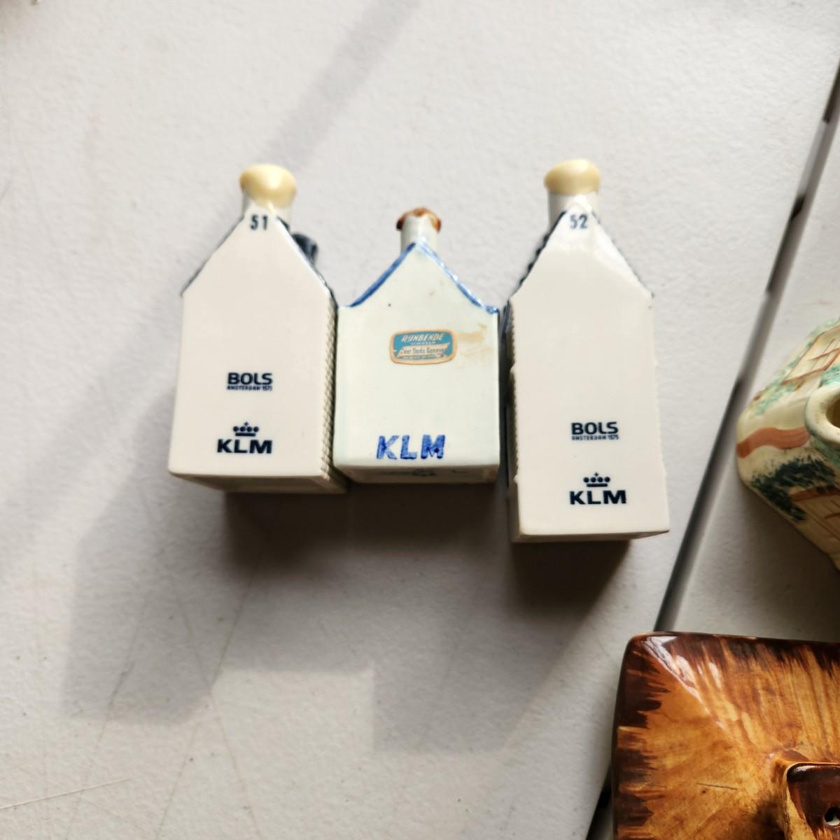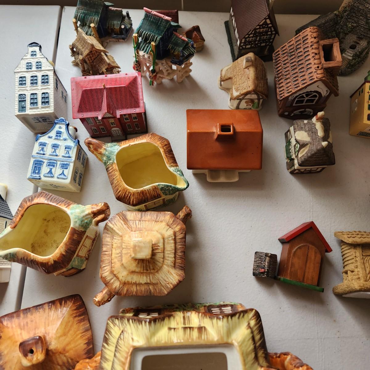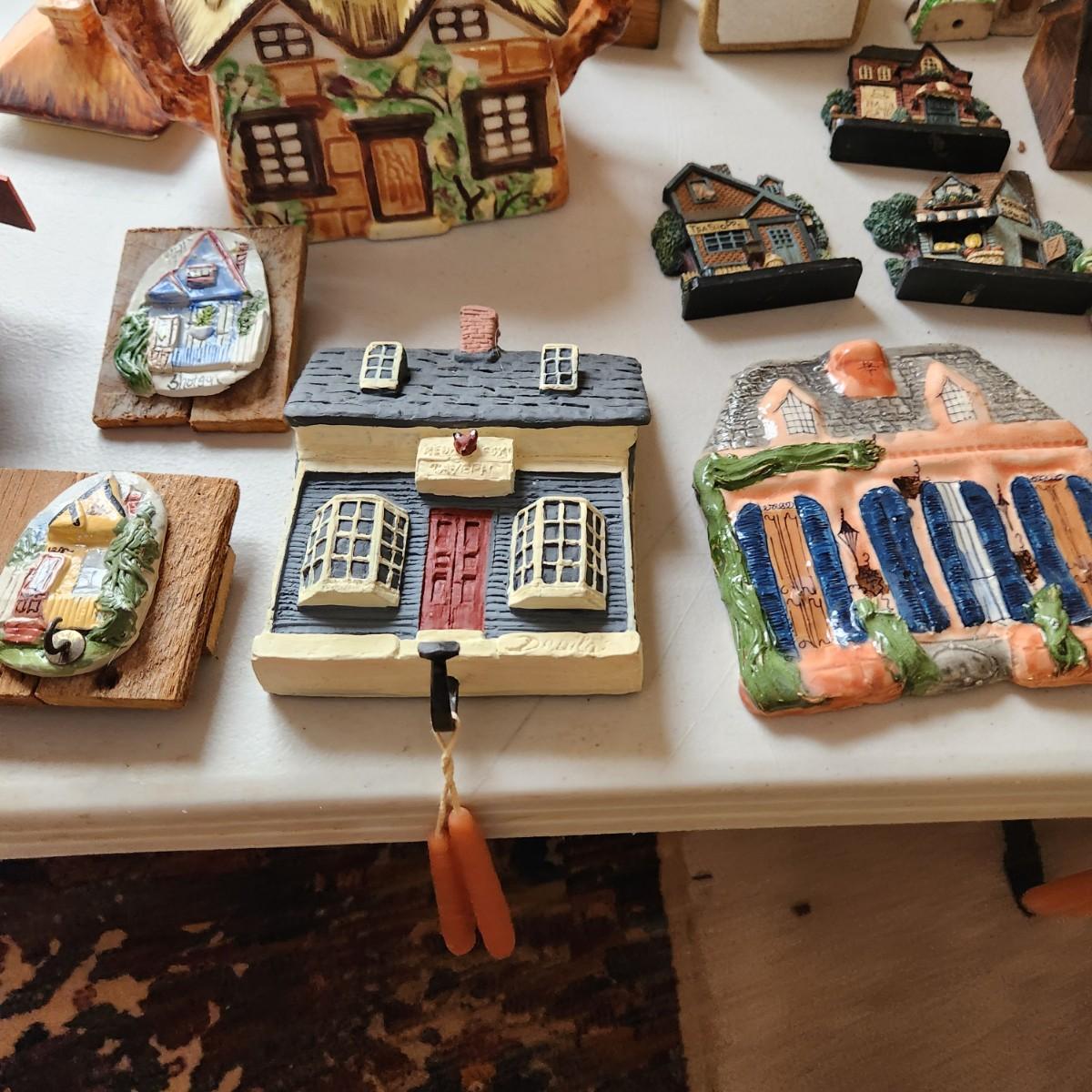 Large Table lot of Collectibles Small Buildings, Clock, Wall hooks, Occupied Japan items, KLM Dutch Airlines Houses