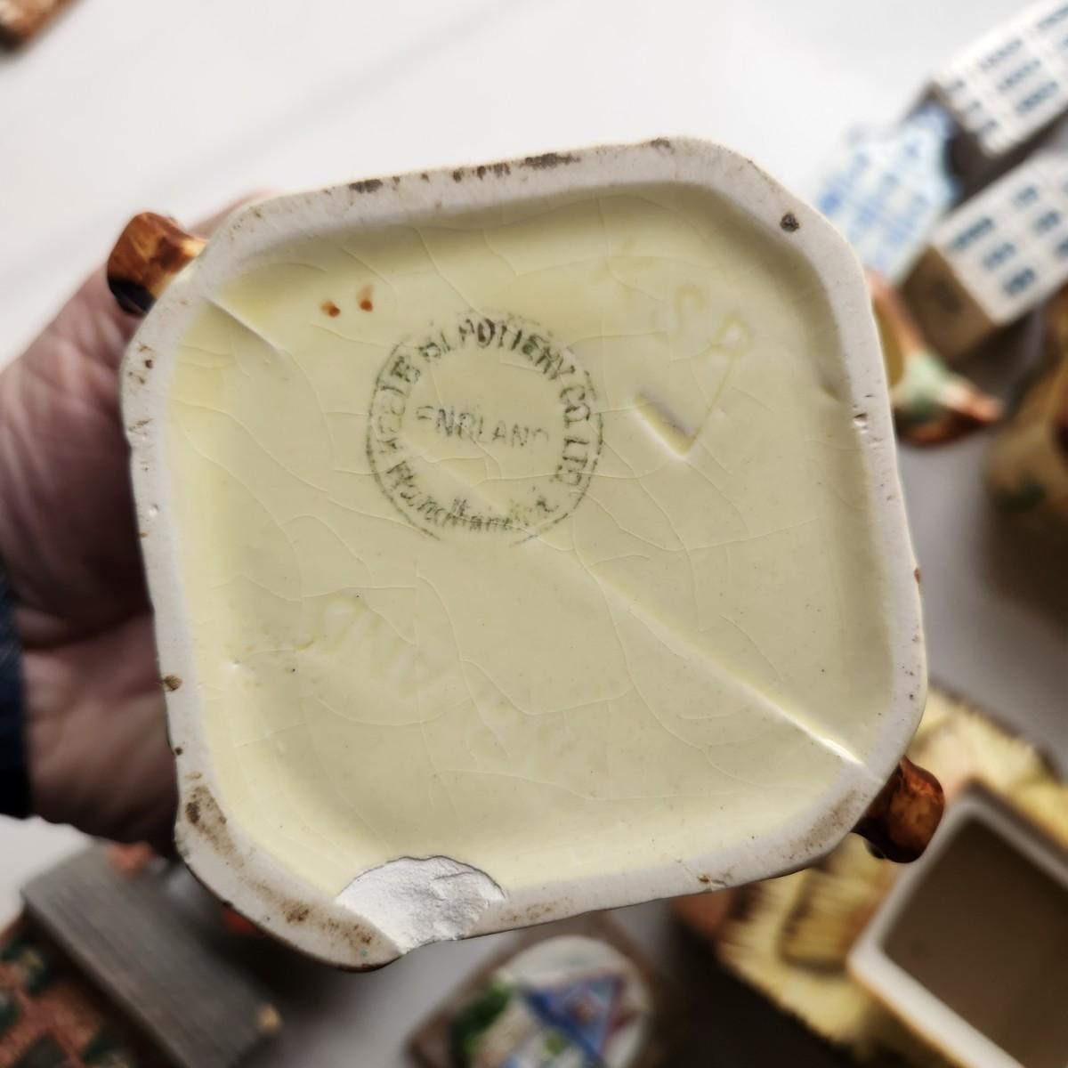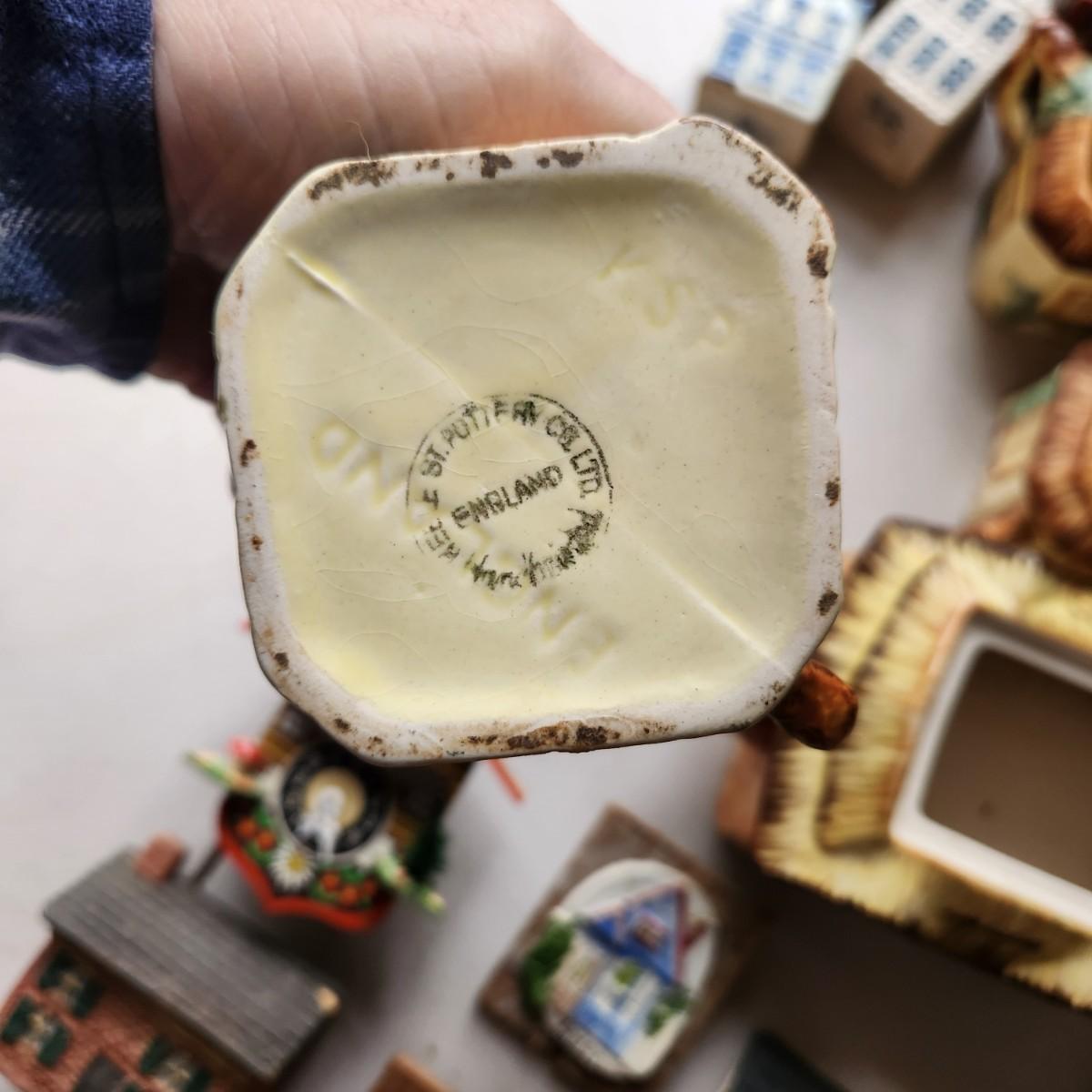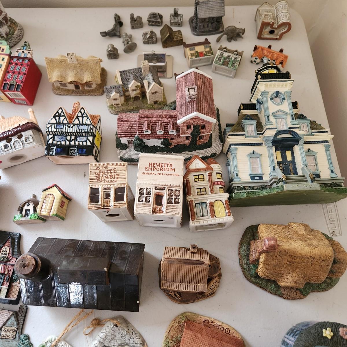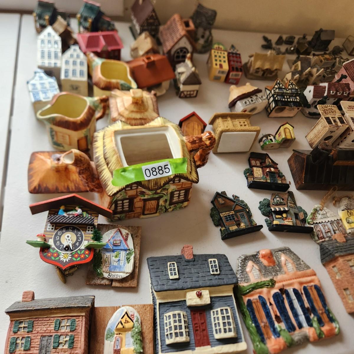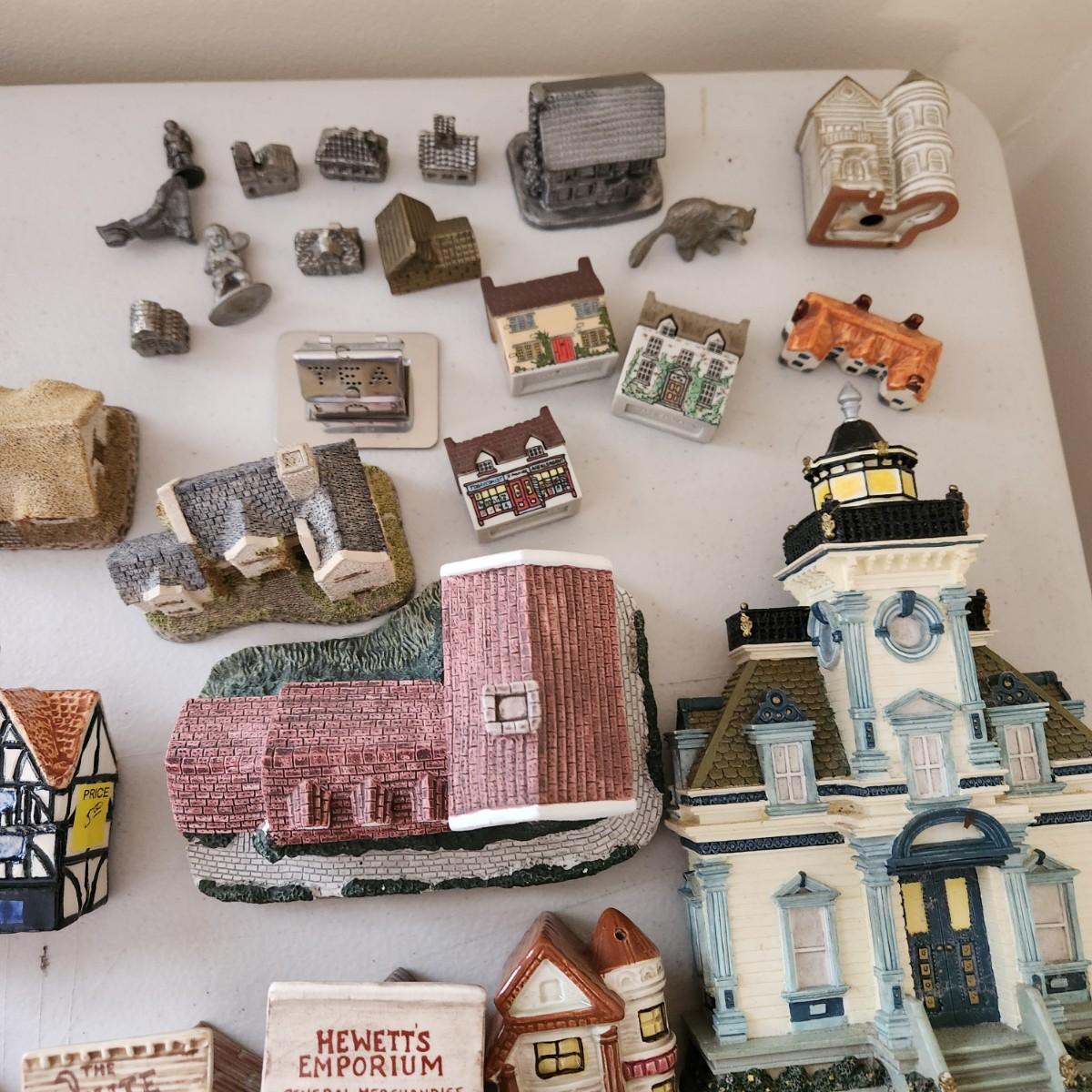 Large Table lot of Collectibles Small Buildings, Clock, Wall hooks, Occupied Japan items, KLM Dutch Airlines Houses