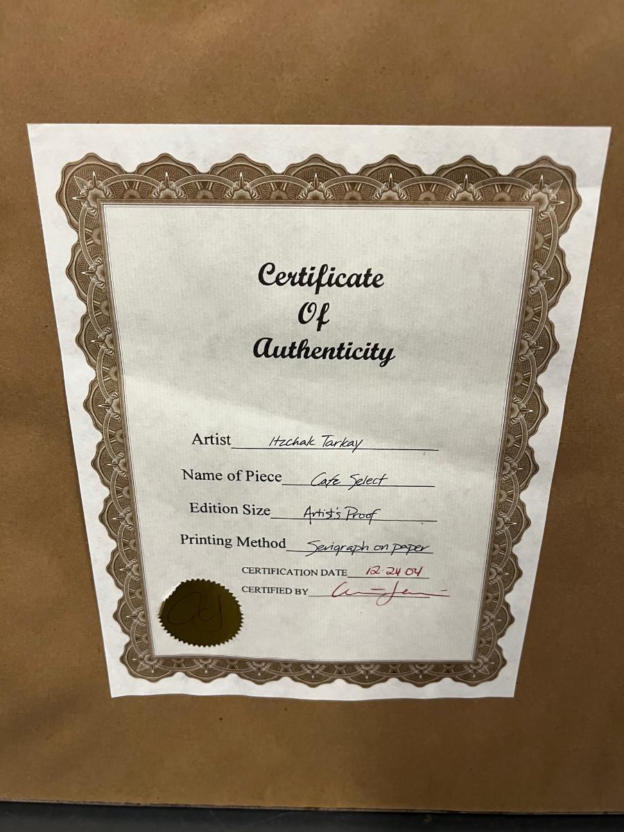Large TARKAY COA Artist Proof! "Café Select" Serigraph on Paper Framed.