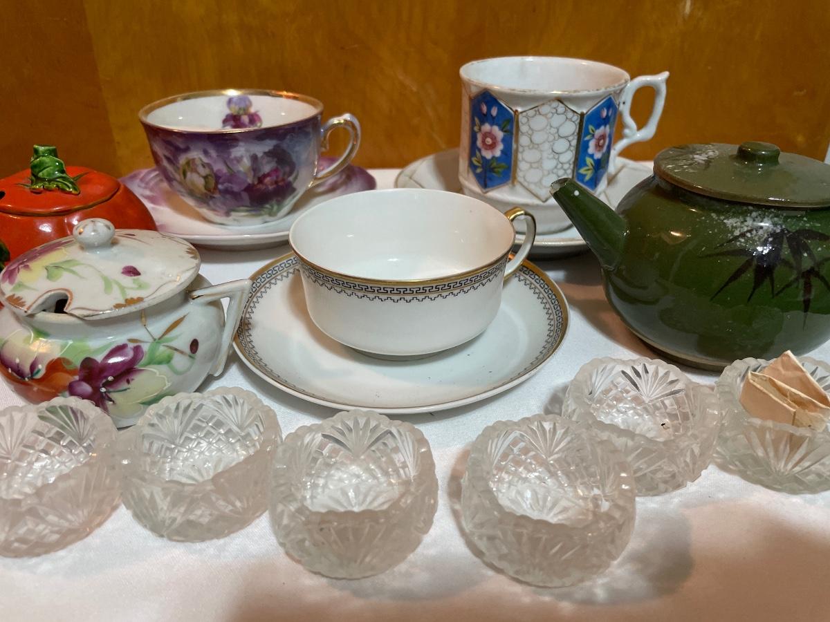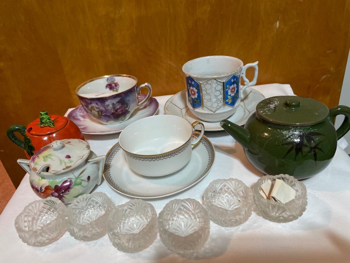 Large teacups and sugar bowls with small tea pot