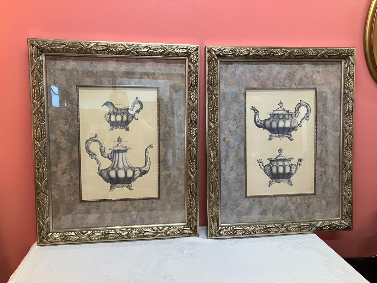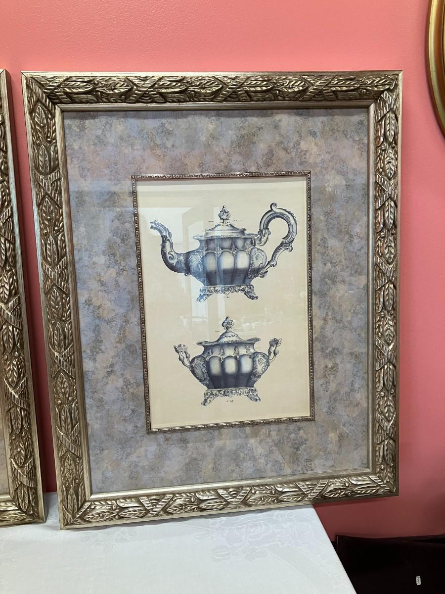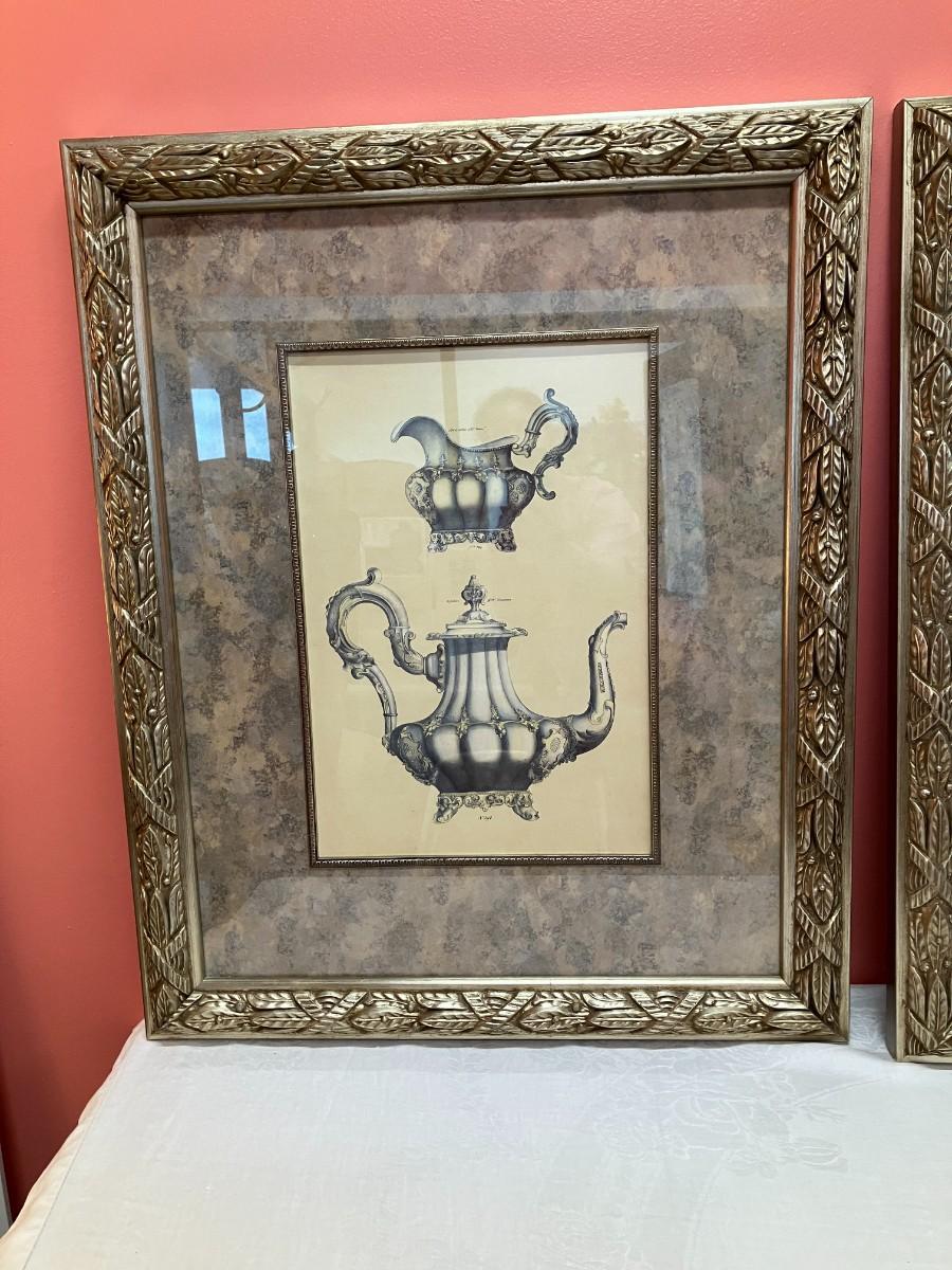 2 pieces of large framed teapot artwork. Each piece is 32.5"H x 26"W