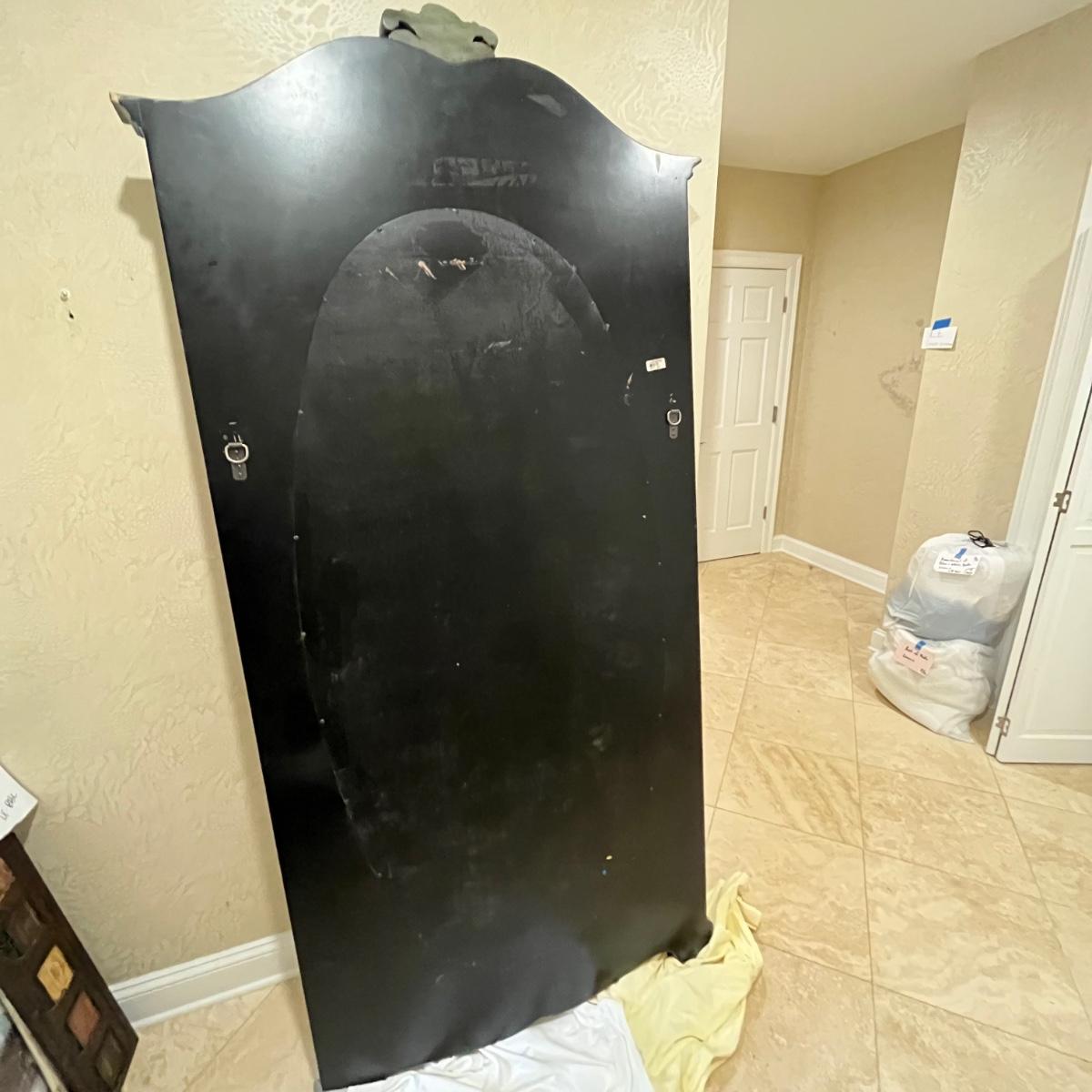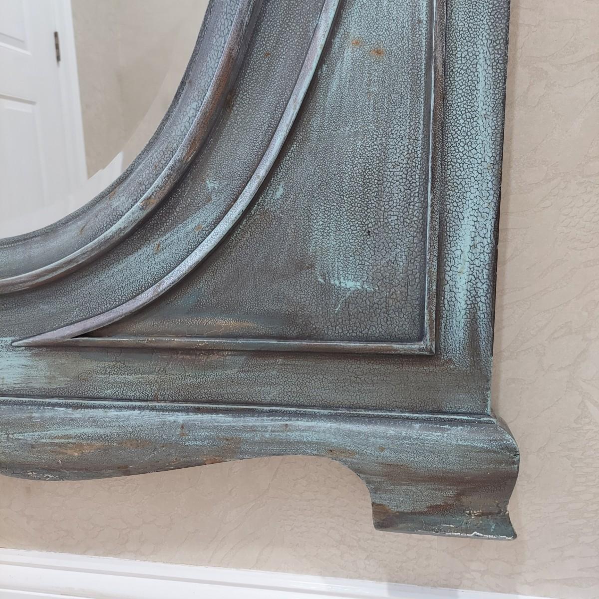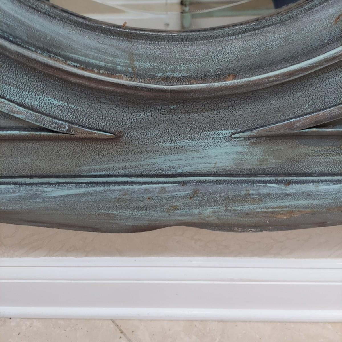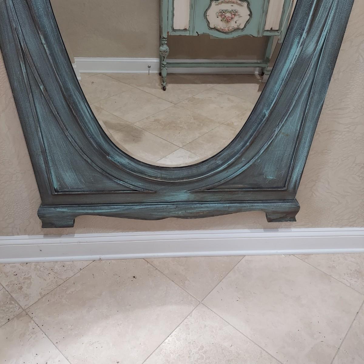 Large full length oval mirror with an ornate textured frame. It has a faux copper patina color. Measures approximately 40" x 2" x 85"H. Local Pickup Only. Winning bidder must bring assistance to help move and load this item due to its weight and/or size.