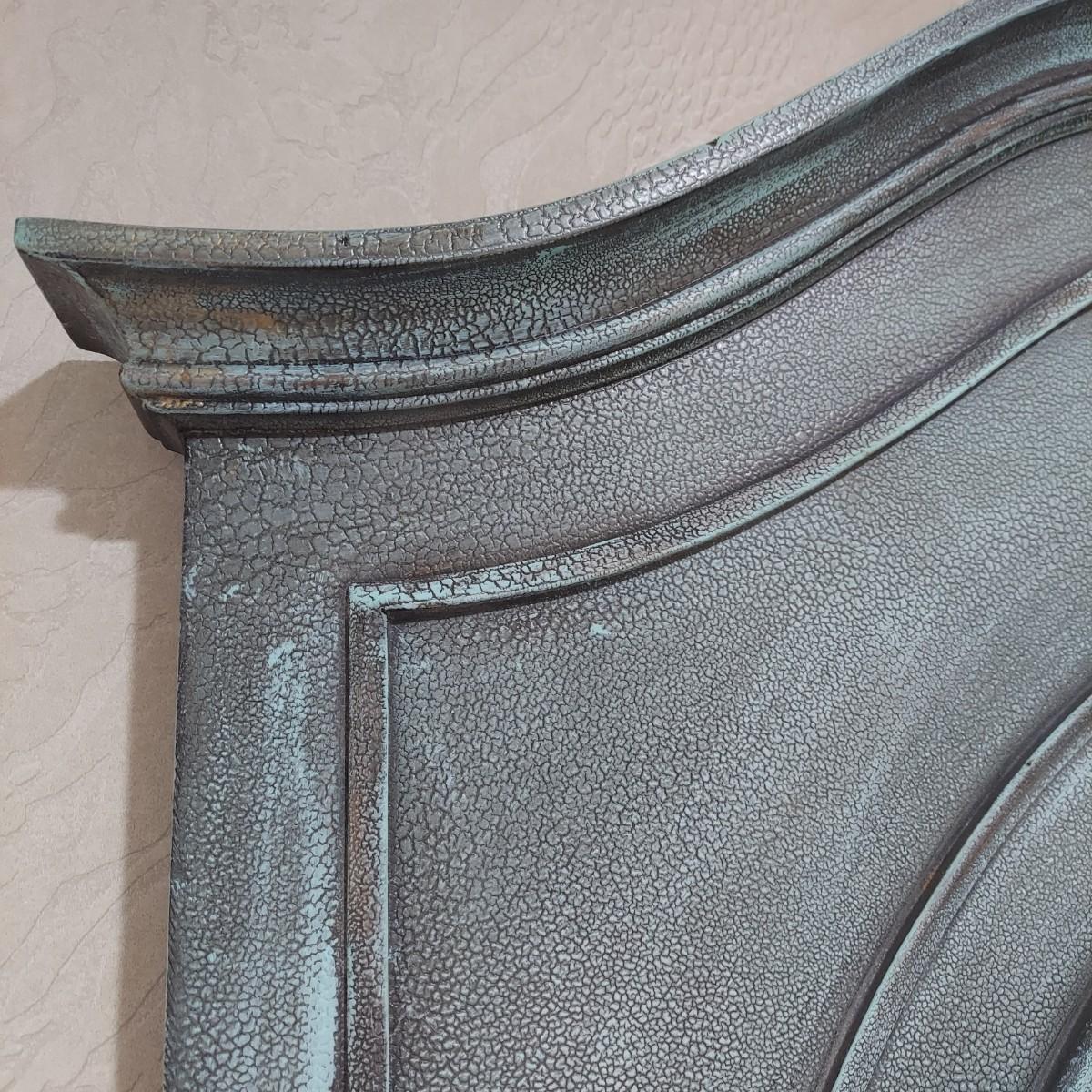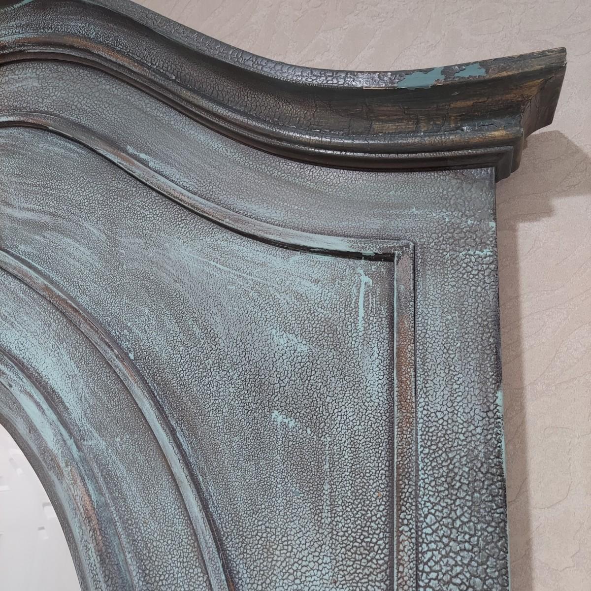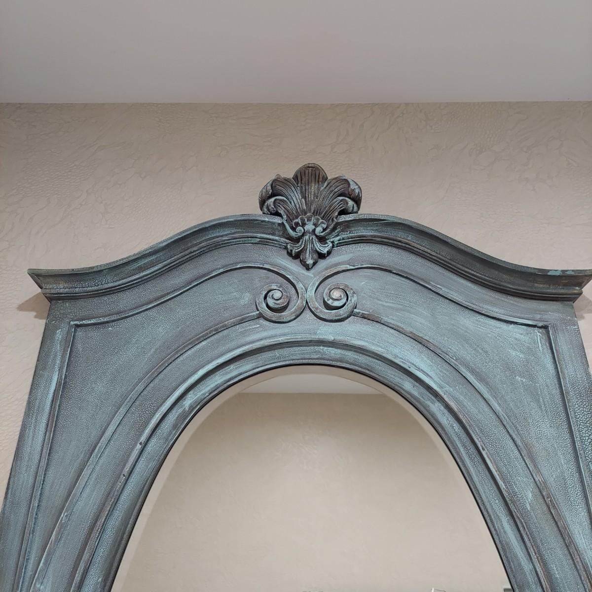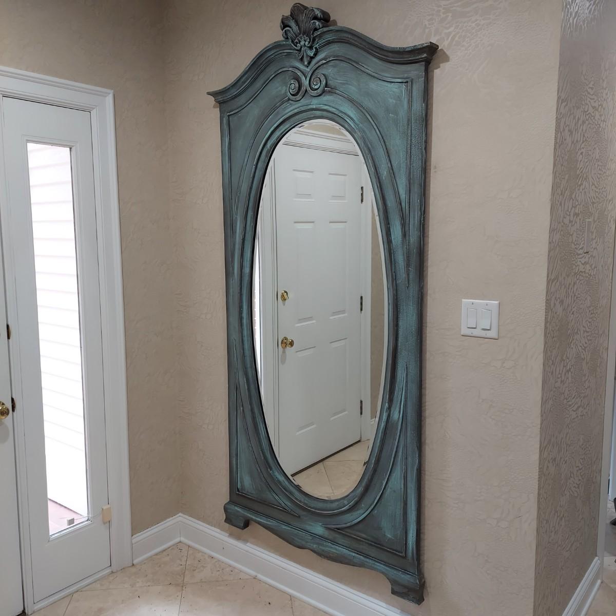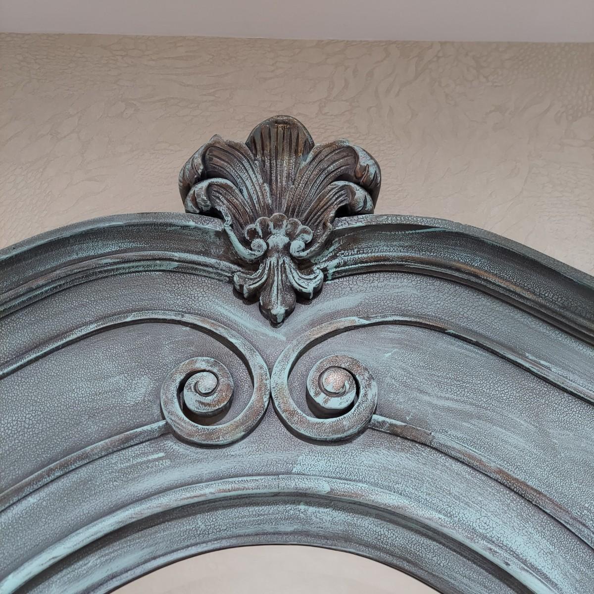 Large full length oval mirror with an ornate textured frame. It has a faux copper patina color. Measures approximately 40" x 2" x 85"H. Local Pickup Only. Winning bidder must bring assistance to help move and load this item due to its weight and/or size.