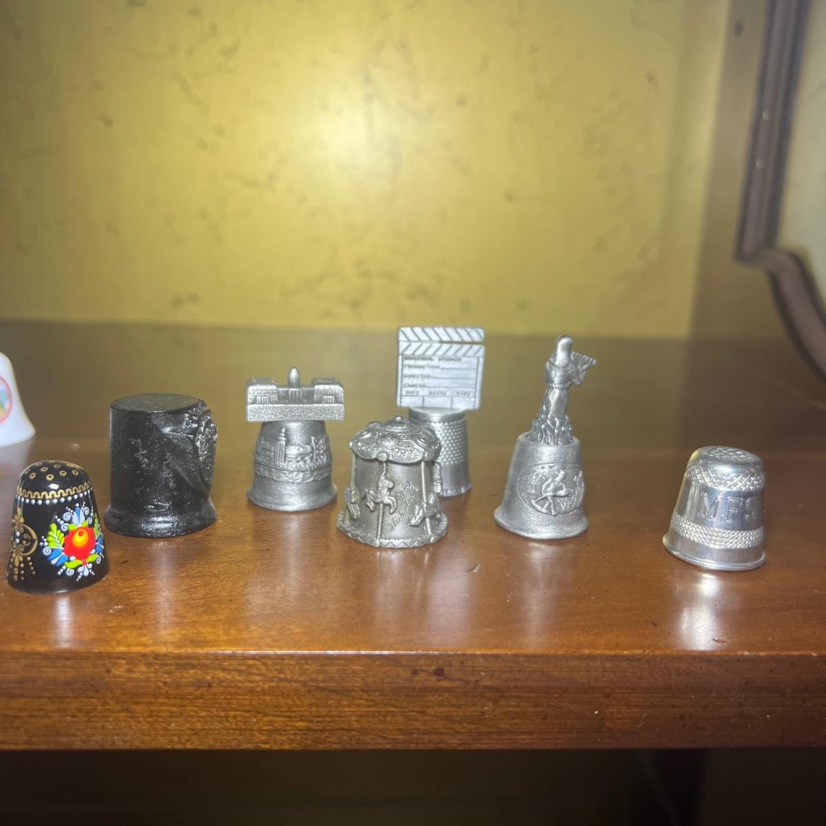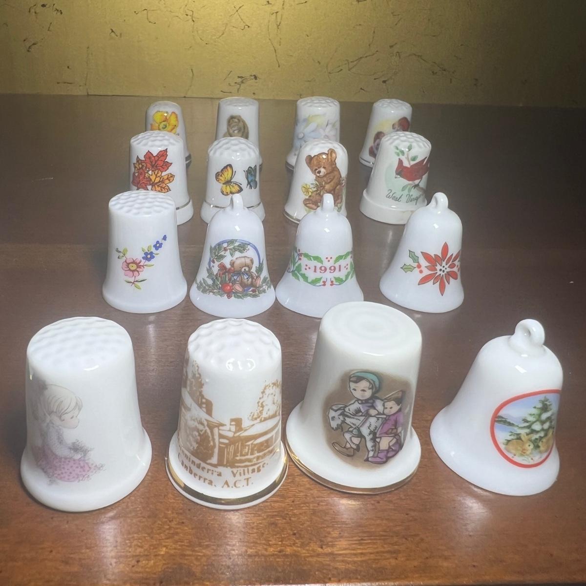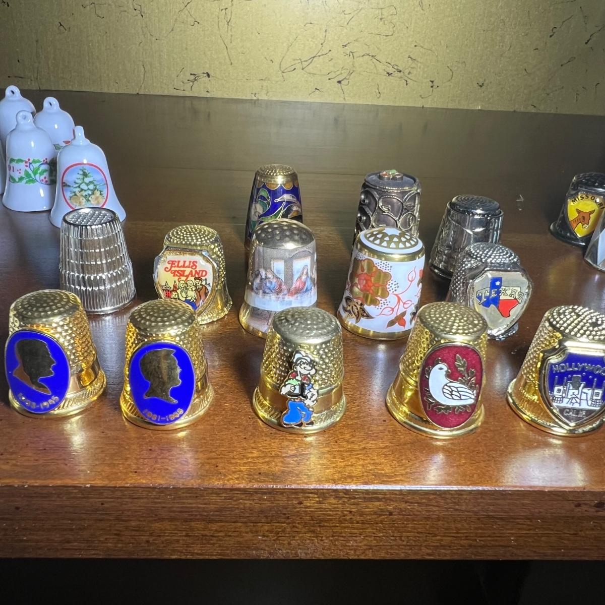 Over 100 thimbles in this collection; a large proportion are fine and bone China, others include metal, wood and even coal! Bells and a miniature lidded pot and miniature pitcher with a dish also included.