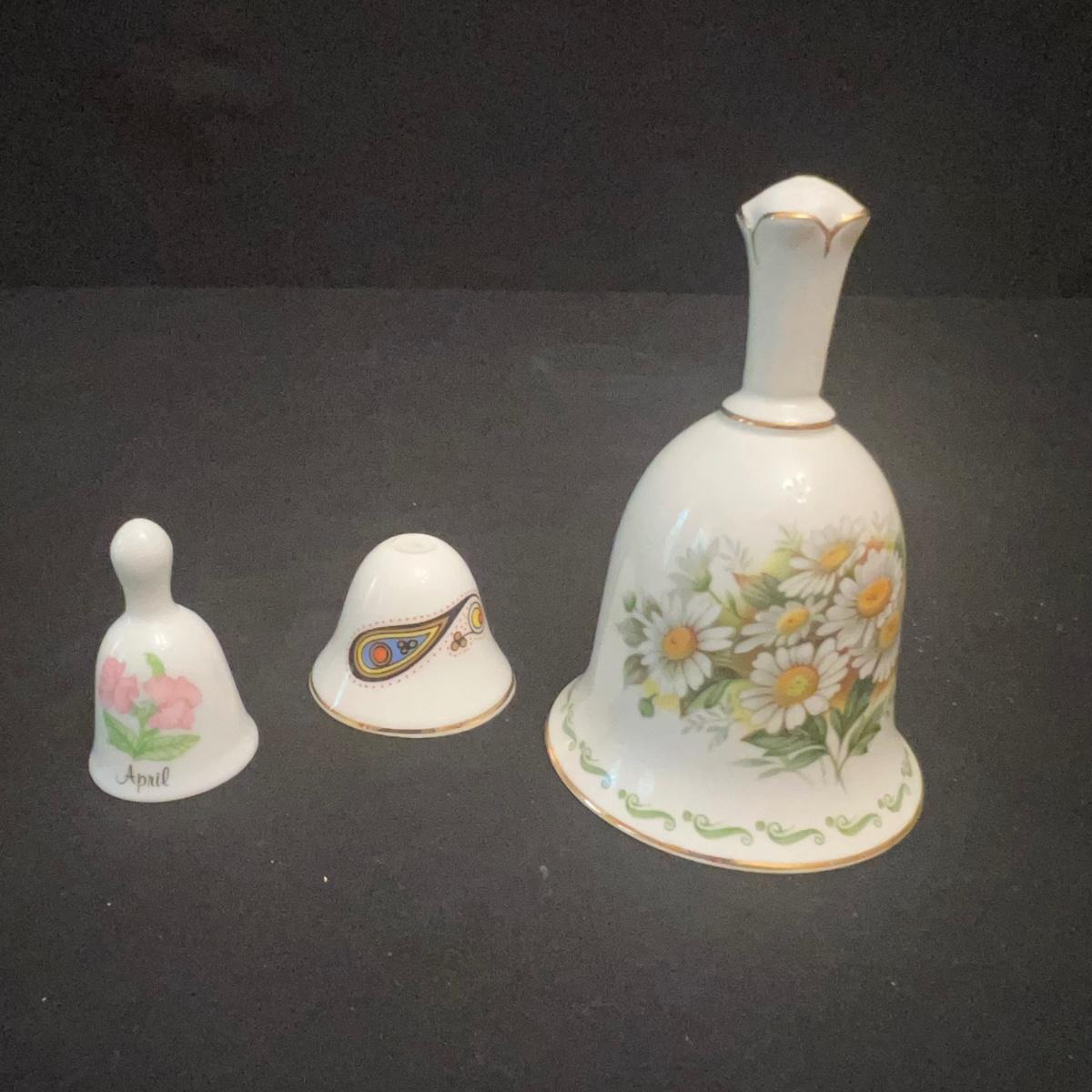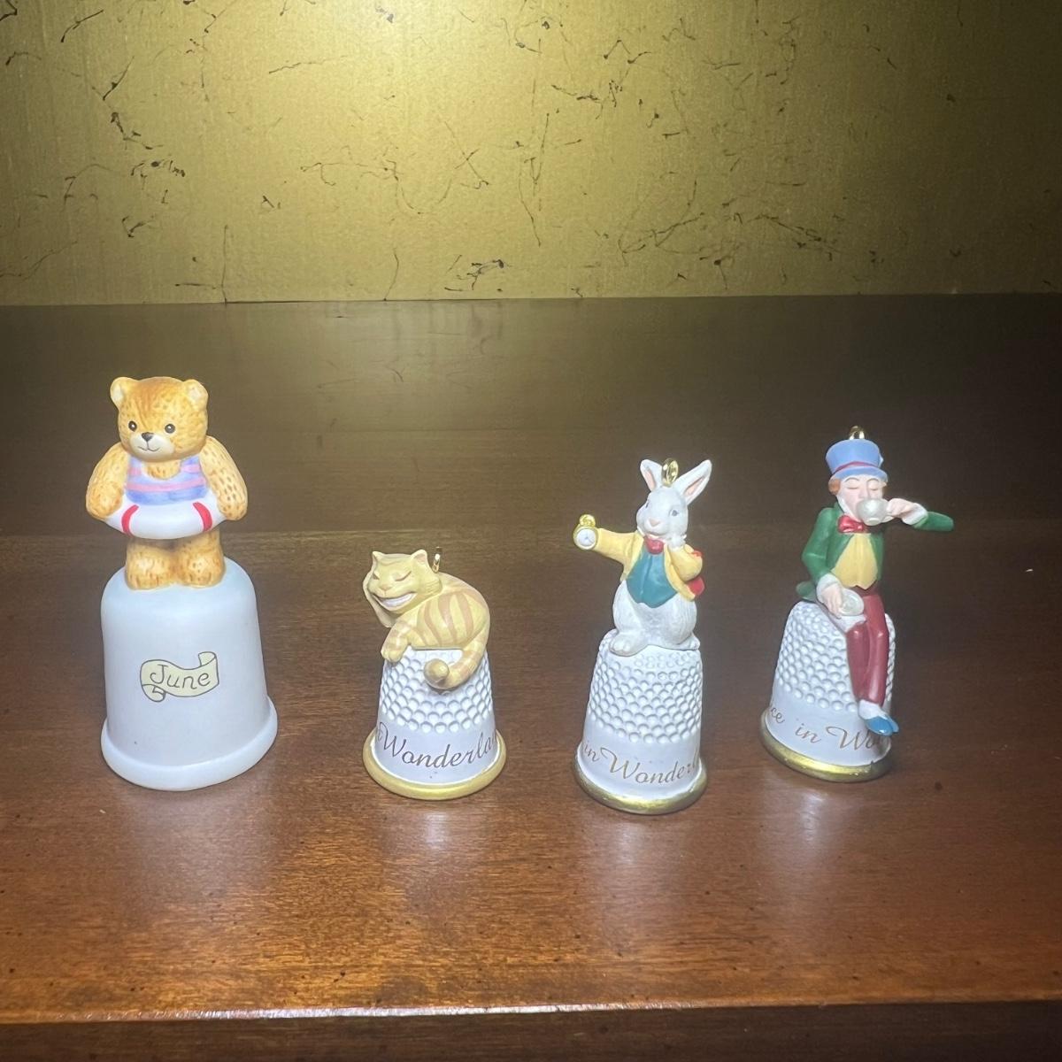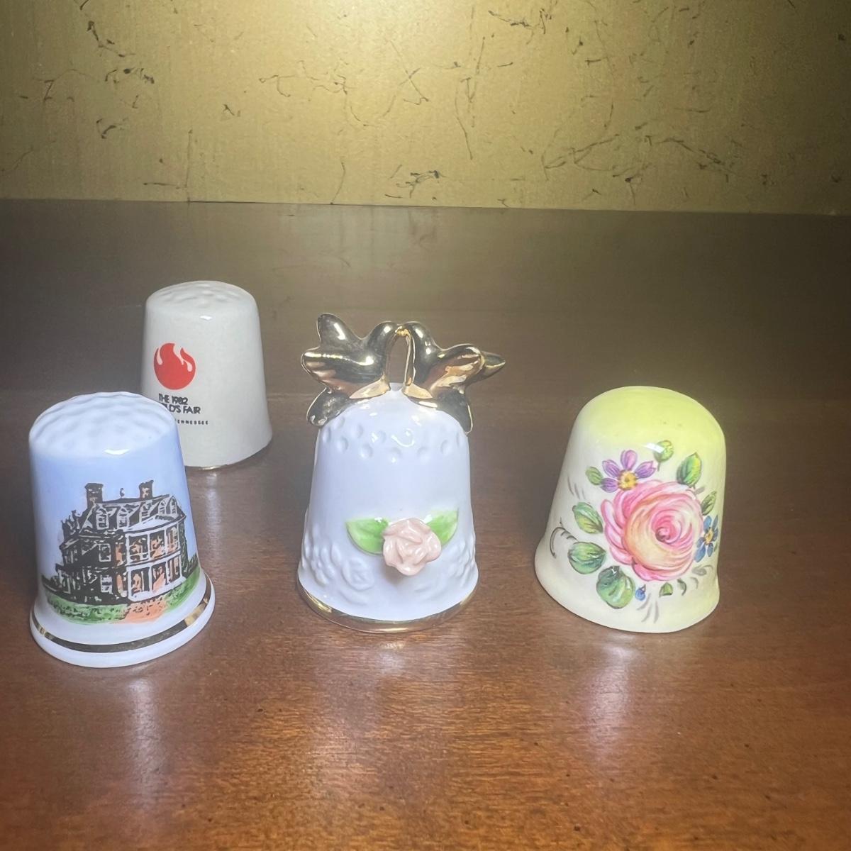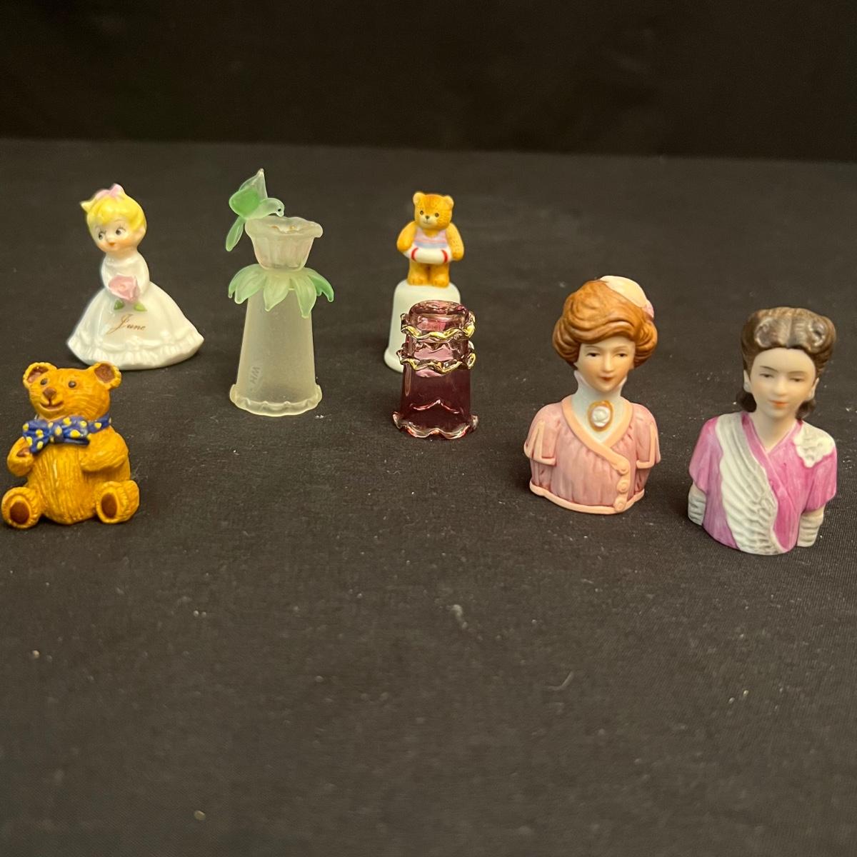 Over 100 thimbles in this collection; a large proportion are fine and bone China, others include metal, wood and even coal! Bells and a miniature lidded pot and miniature pitcher with a dish also included.