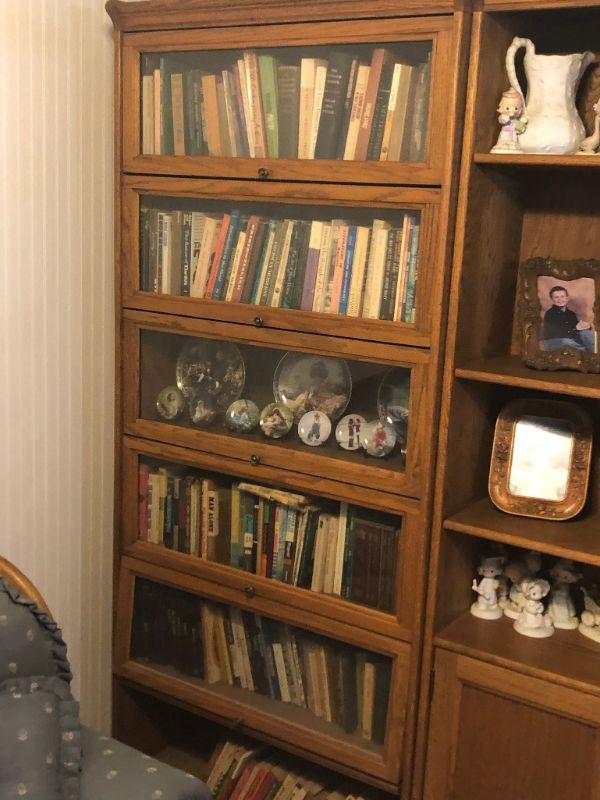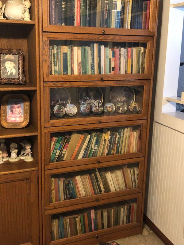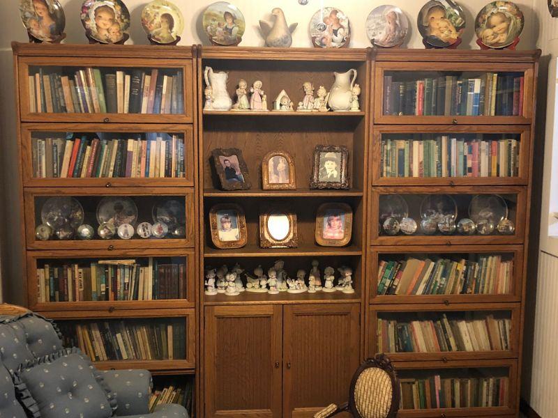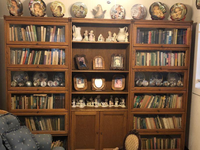 Large three piece bookcase. Lawyer bookcase sides with glass front doors. Center has adjustable shelves and lower cabinet. Medium finish. *DECOR ITEMS NOT INCLUDED, FURNITURE ONLY*