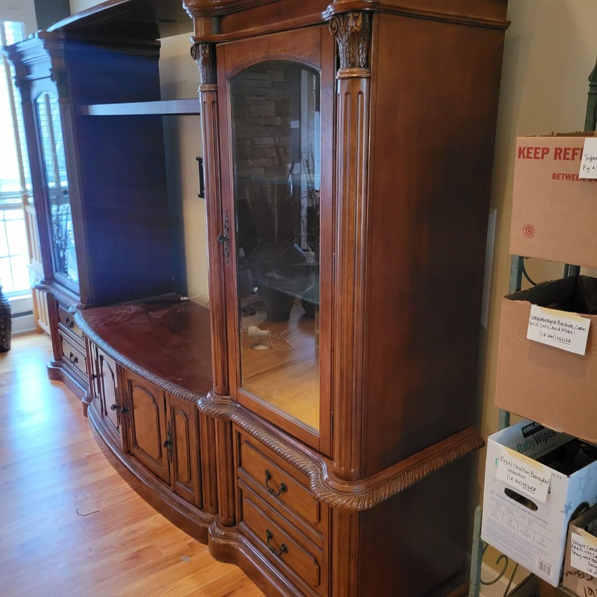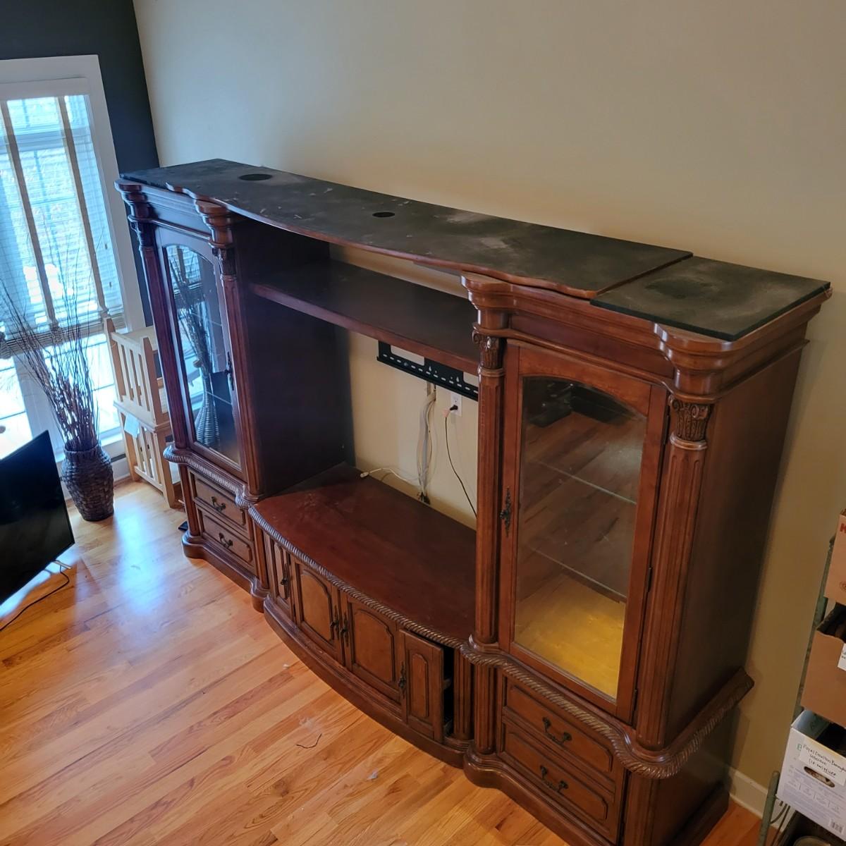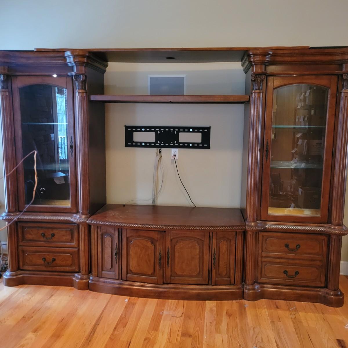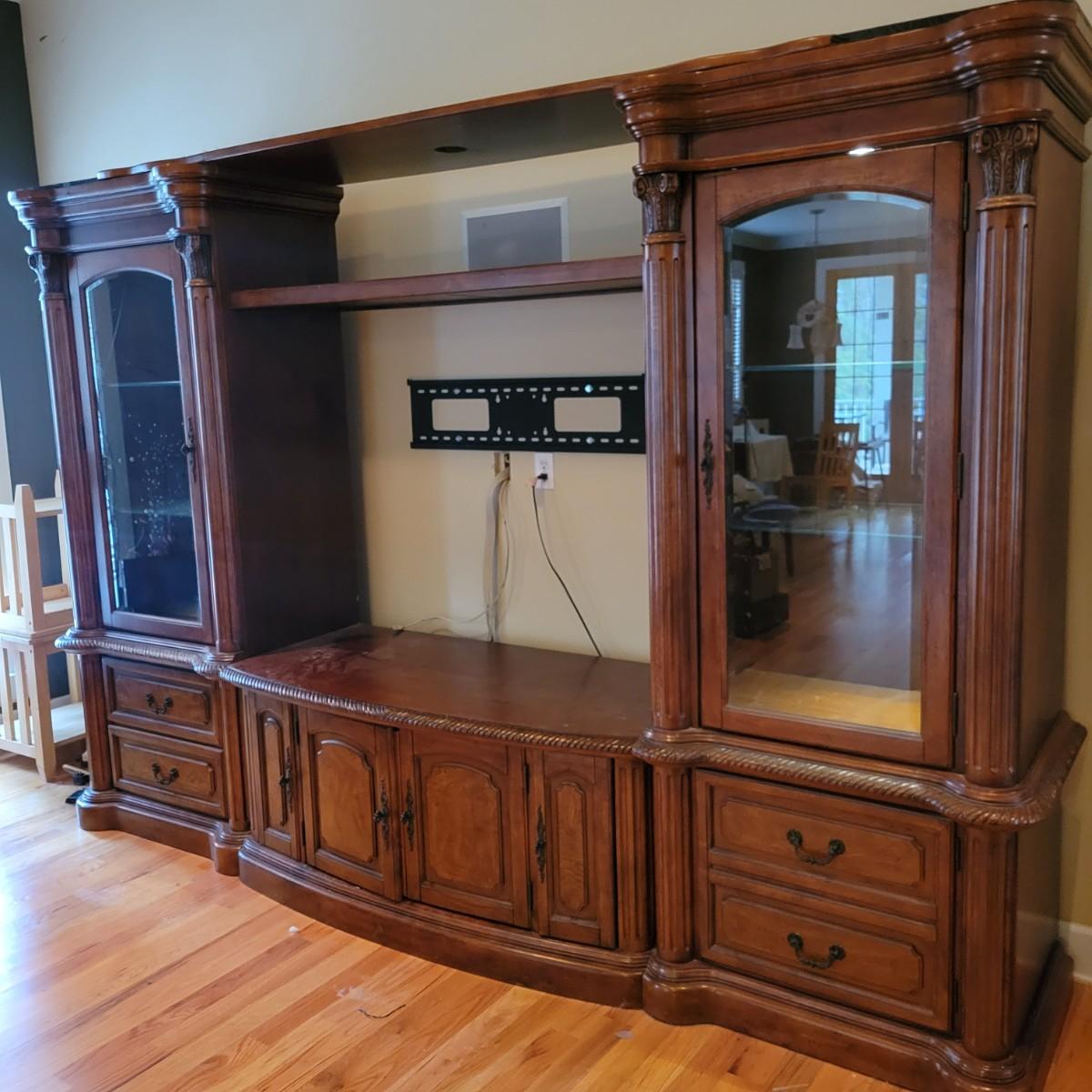A large three piece entertainment center in good condition with no notable damage. This piece is solid wood with a rich brown stain. It features two lighted display cabinets with adjustable glass shelves and storage underneath them. One side has drawers that are dovetailed. Center piece has two pullout cd/dvd storage spaces and a large cabinet for additional components. This piece is exceptionally large and heavy. The two side cabinets are separate pieces that can be moved by themselves. The three pieces could theoretically be used separately. The entire entertainment center measures approximately 120" x 28" x 82". There is some minor dissasembley required of removing four phillips head screws. Local pickup only. Winning bidder must bring assistance to help move and load this item due to its weight and/or size