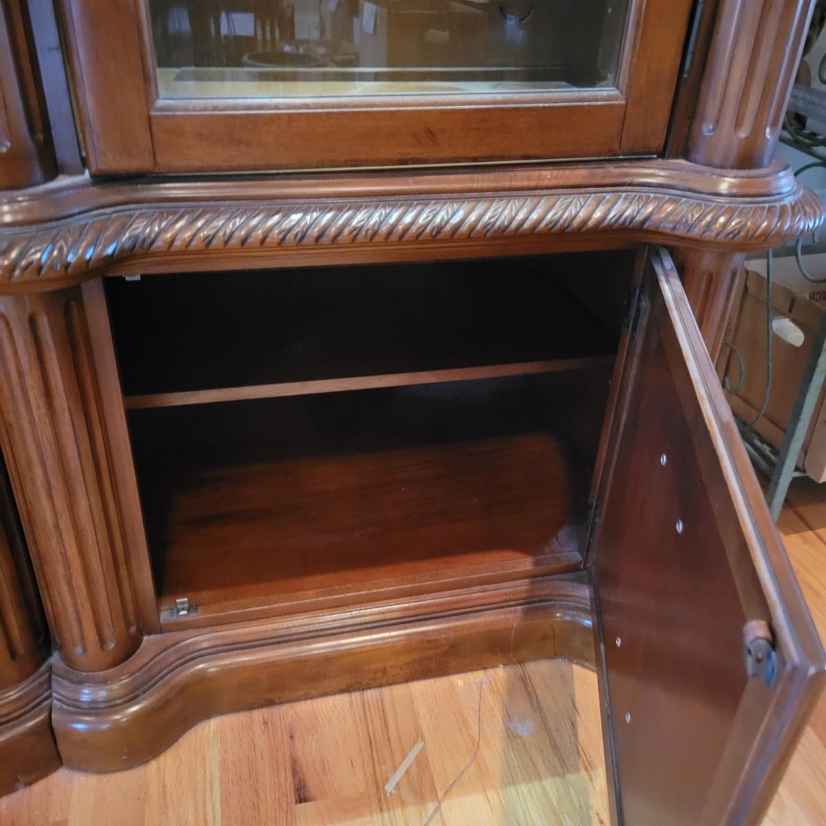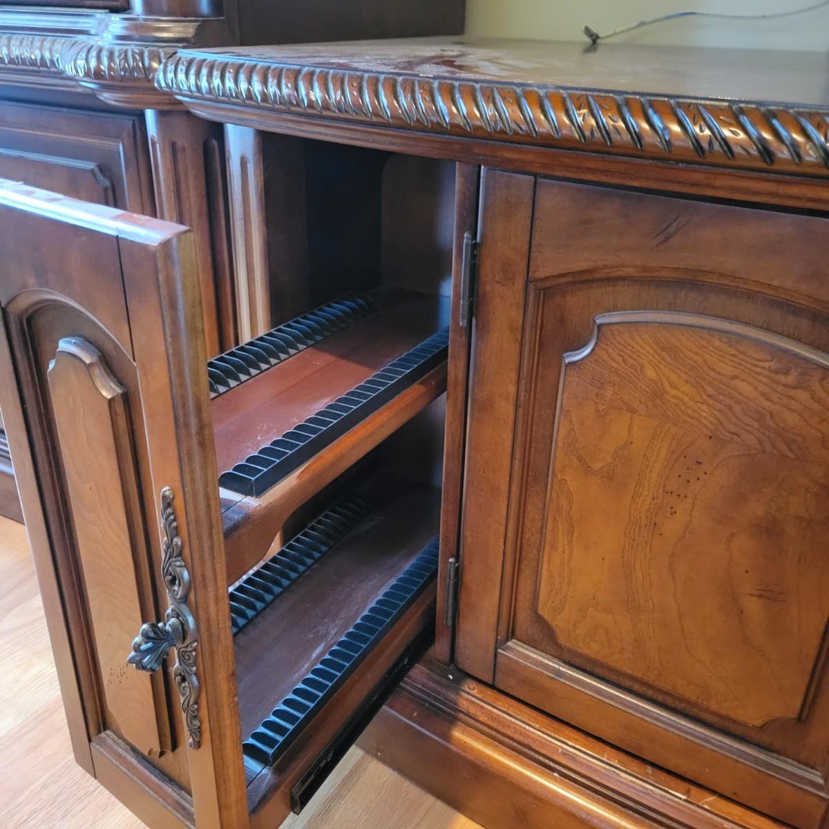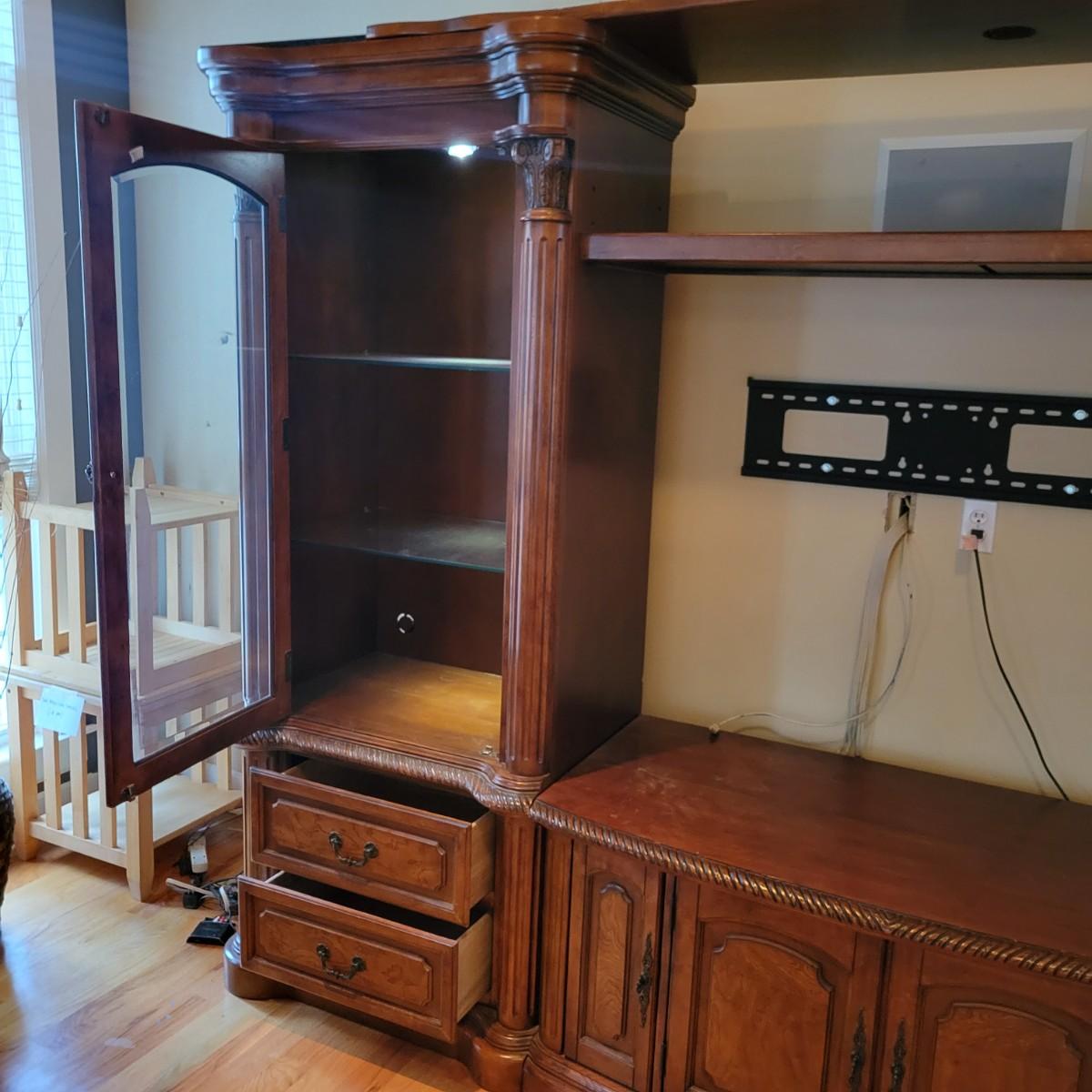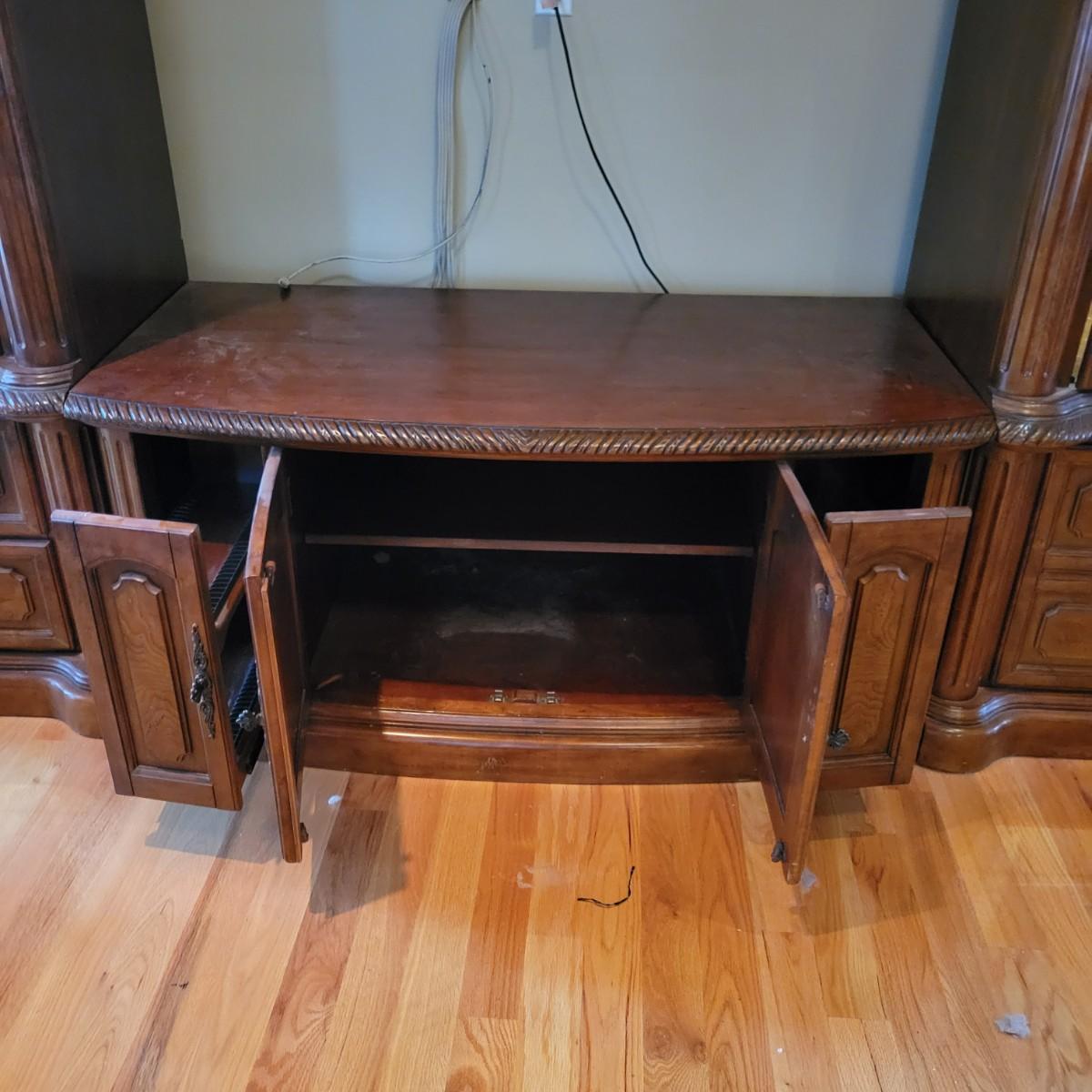 A large three piece entertainment center in good condition with no notable damage. This piece is solid wood with a rich brown stain. It features two lighted display cabinets with adjustable glass shelves and storage underneath them. One side has drawers that are dovetailed. Center piece has two pullout cd/dvd storage spaces and a large cabinet for additional components. This piece is exceptionally large and heavy. The two side cabinets are separate pieces that can be moved by themselves. The three pieces could theoretically be used separately. The entire entertainment center measures approximately 120" x 28" x 82". There is some minor dissasembley required of removing four phillips head screws. Local pickup only. Winning bidder must bring assistance to help move and load this item due to its weight and/or size