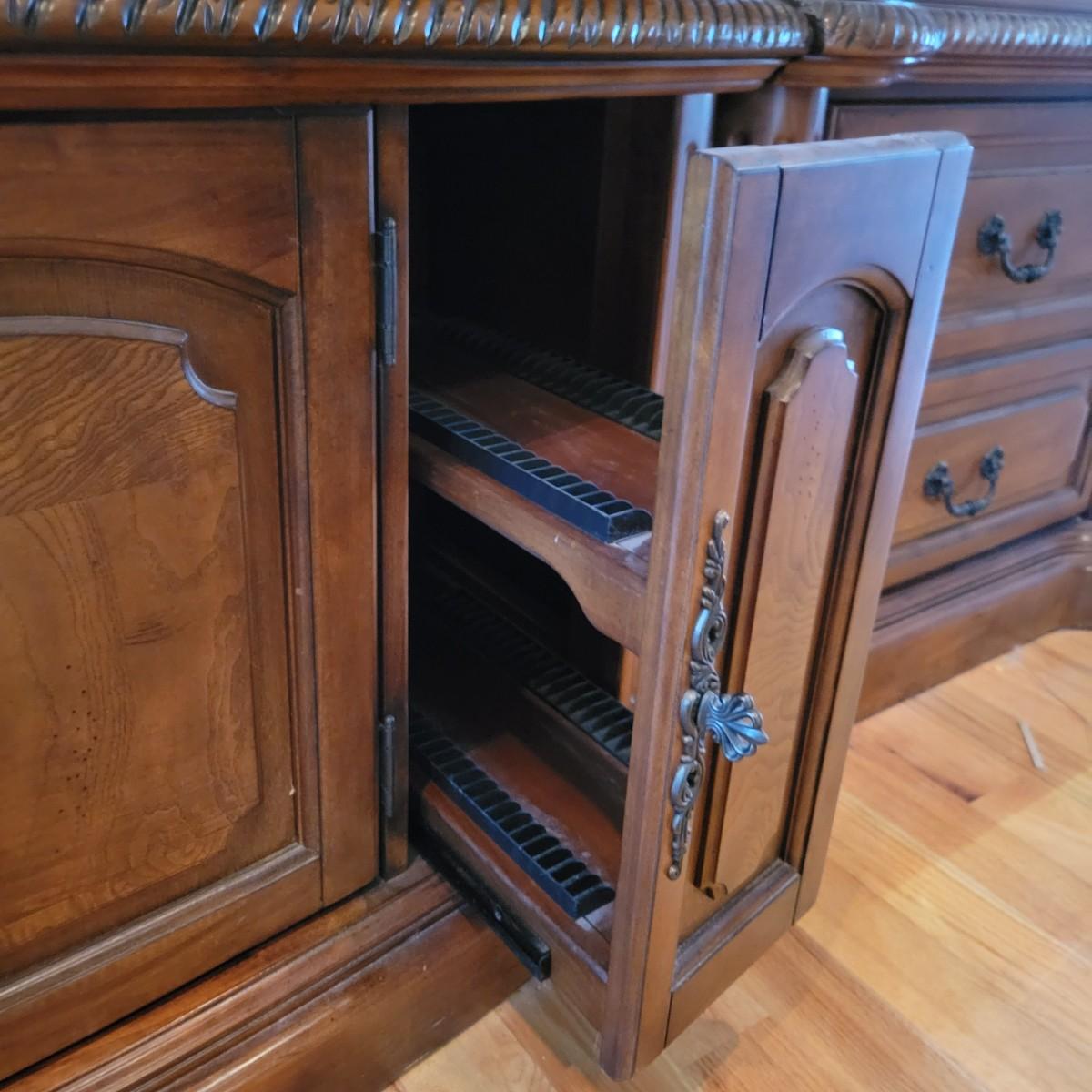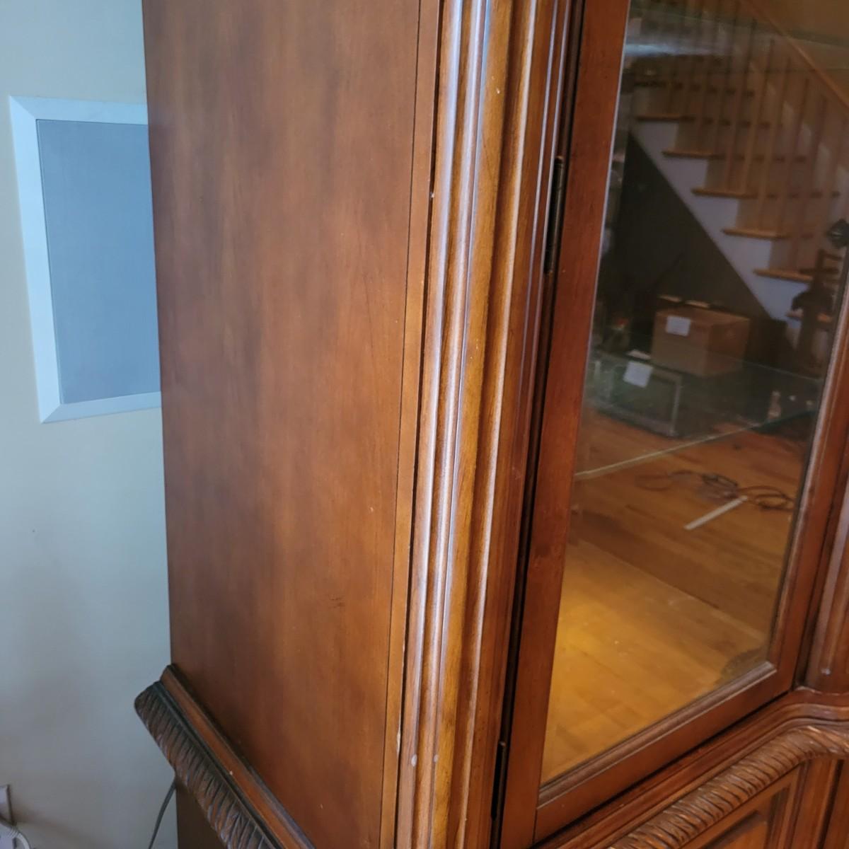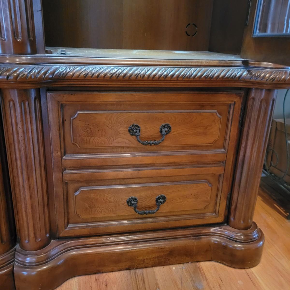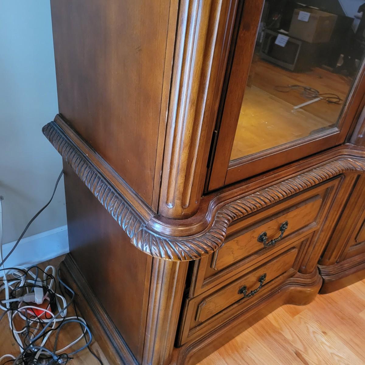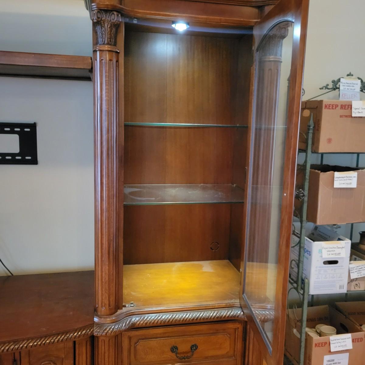 A large three piece entertainment center in good condition with no notable damage. This piece is solid wood with a rich brown stain. It features two lighted display cabinets with adjustable glass shelves and storage underneath them. One side has drawers that are dovetailed. Center piece has two pullout cd/dvd storage spaces and a large cabinet for additional components. This piece is exceptionally large and heavy. The two side cabinets are separate pieces that can be moved by themselves. The three pieces could theoretically be used separately. The entire entertainment center measures approximately 120" x 28" x 82". There is some minor dissasembley required of removing four phillips head screws. Local pickup only. Winning bidder must bring assistance to help move and load this item due to its weight and/or size