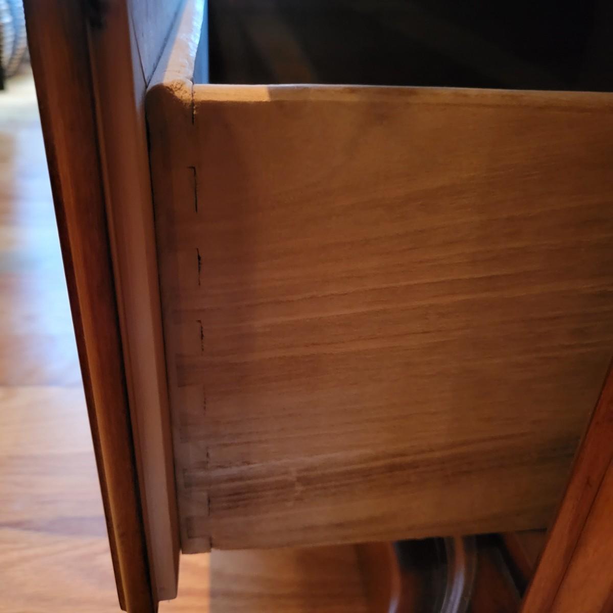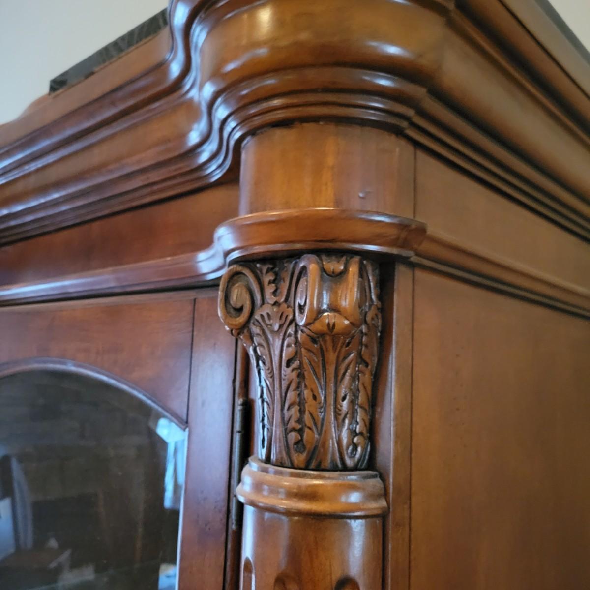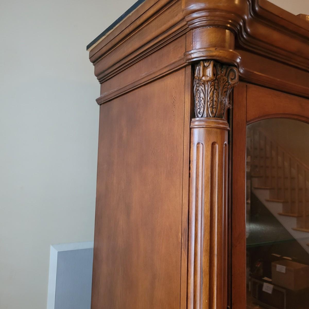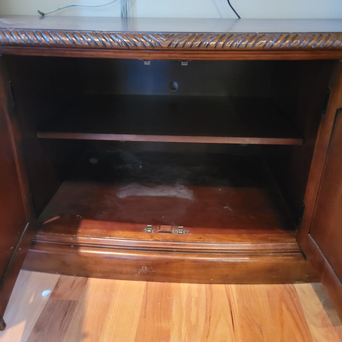 A large three piece entertainment center in good condition with no notable damage. This piece is solid wood with a rich brown stain. It features two lighted display cabinets with adjustable glass shelves and storage underneath them. One side has drawers that are dovetailed. Center piece has two pullout cd/dvd storage spaces and a large cabinet for additional components. This piece is exceptionally large and heavy. The two side cabinets are separate pieces that can be moved by themselves. The three pieces could theoretically be used separately. The entire entertainment center measures approximately 120" x 28" x 82". There is some minor dissasembley required of removing four phillips head screws. Local pickup only. Winning bidder must bring assistance to help move and load this item due to its weight and/or size