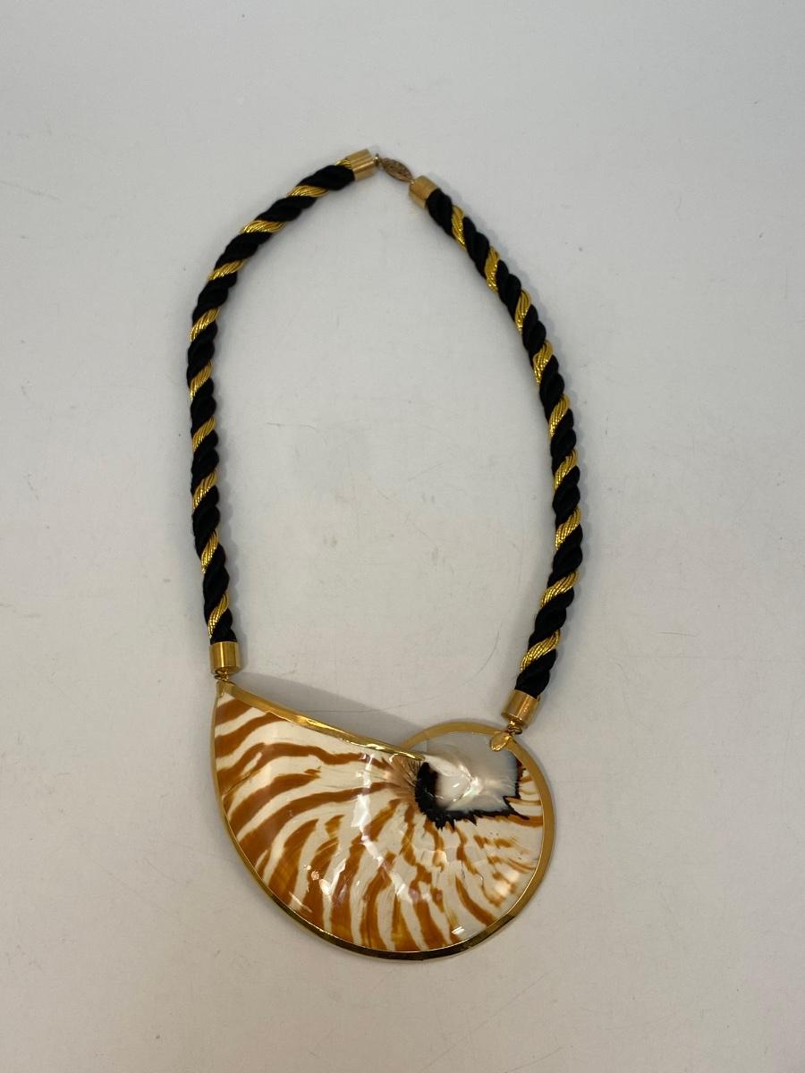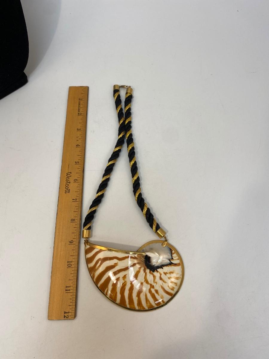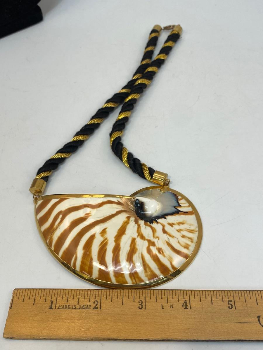 Large Tiger Striped Gold Dip Edge Snail Shell Corded Necklace. In excellent condition. Cord is about 9" length on both sides.