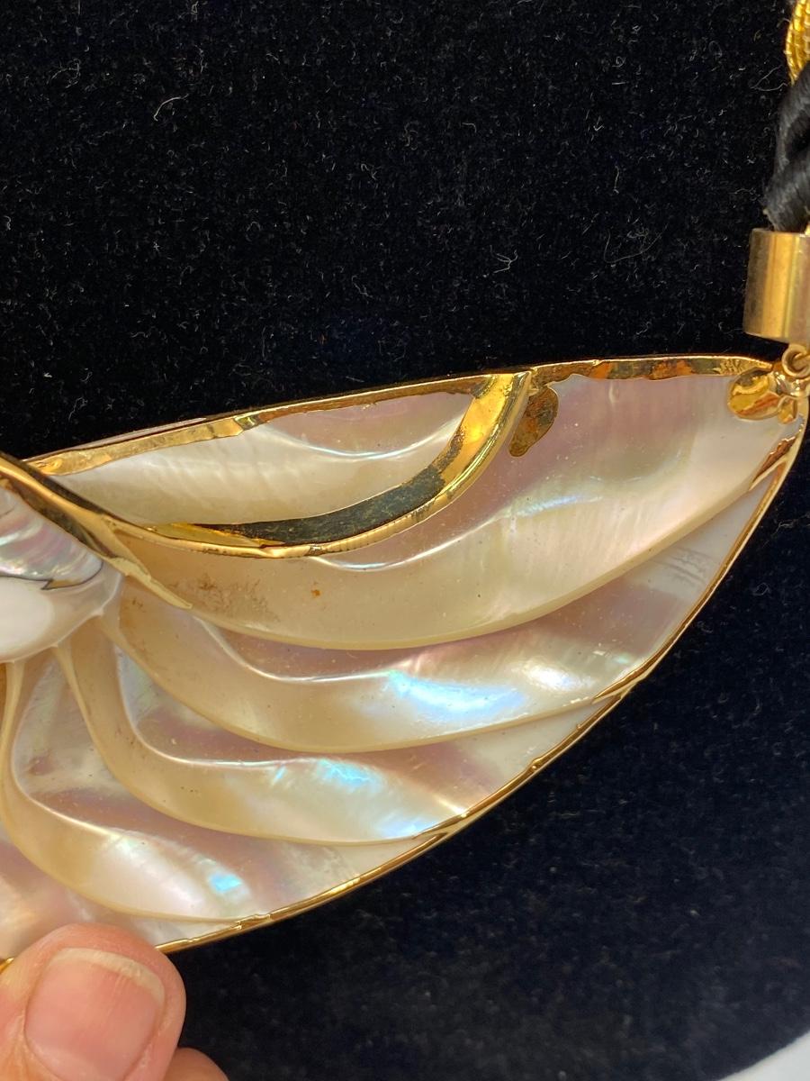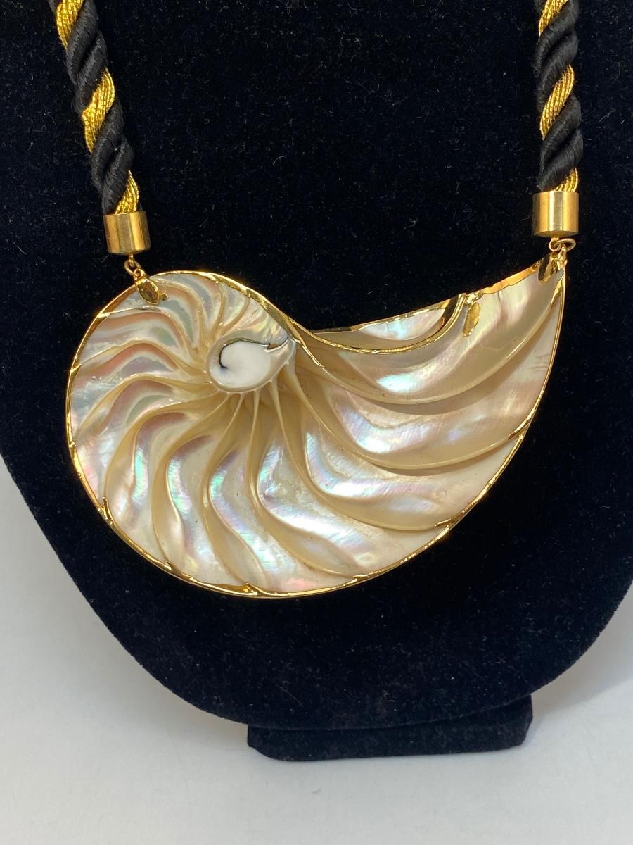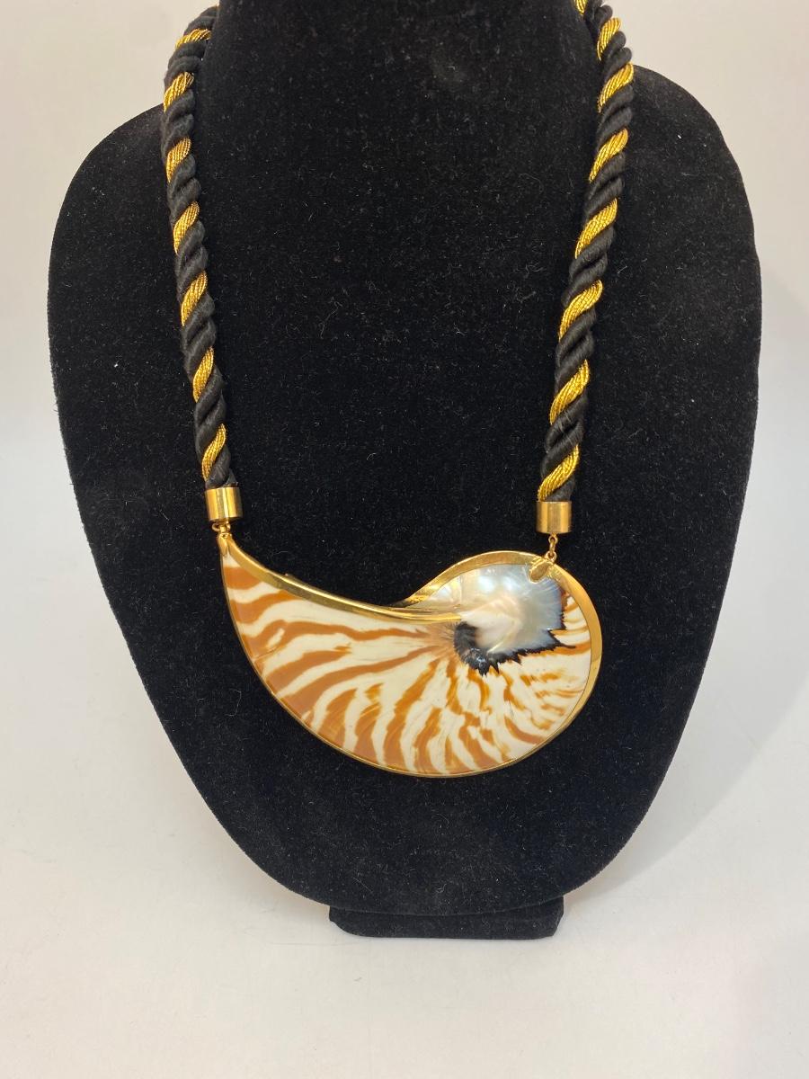 Large Tiger Striped Gold Dip Edge Snail Shell Corded Necklace. In excellent condition. Cord is about 9" length on both sides.