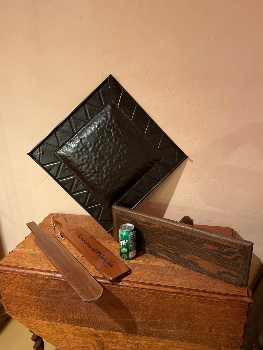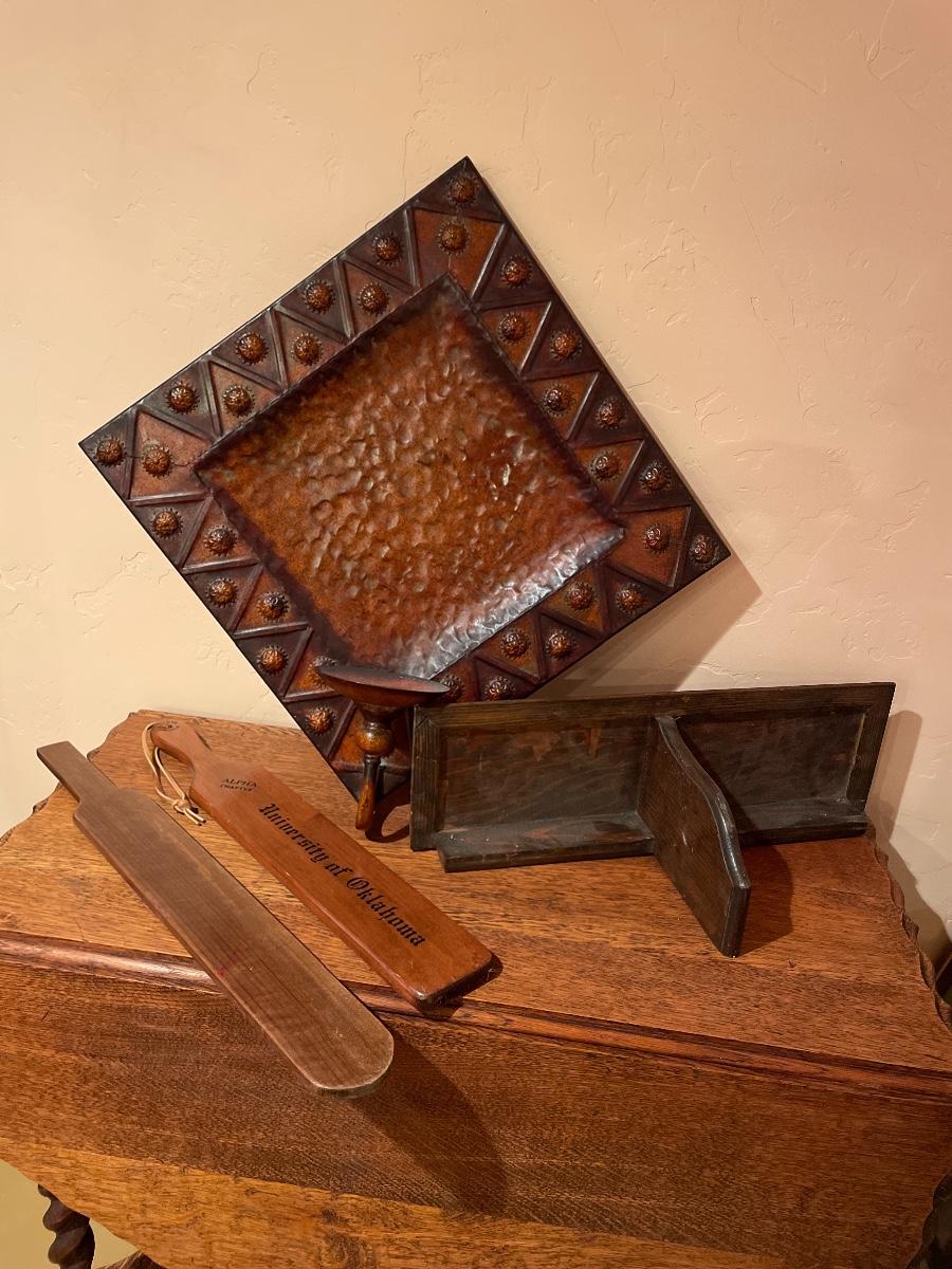 #256 Large Tin Wall Decor, Wood Shelf & Fraternity Paddles