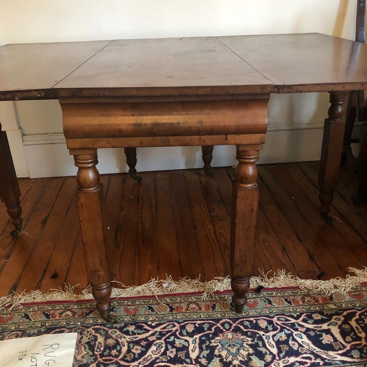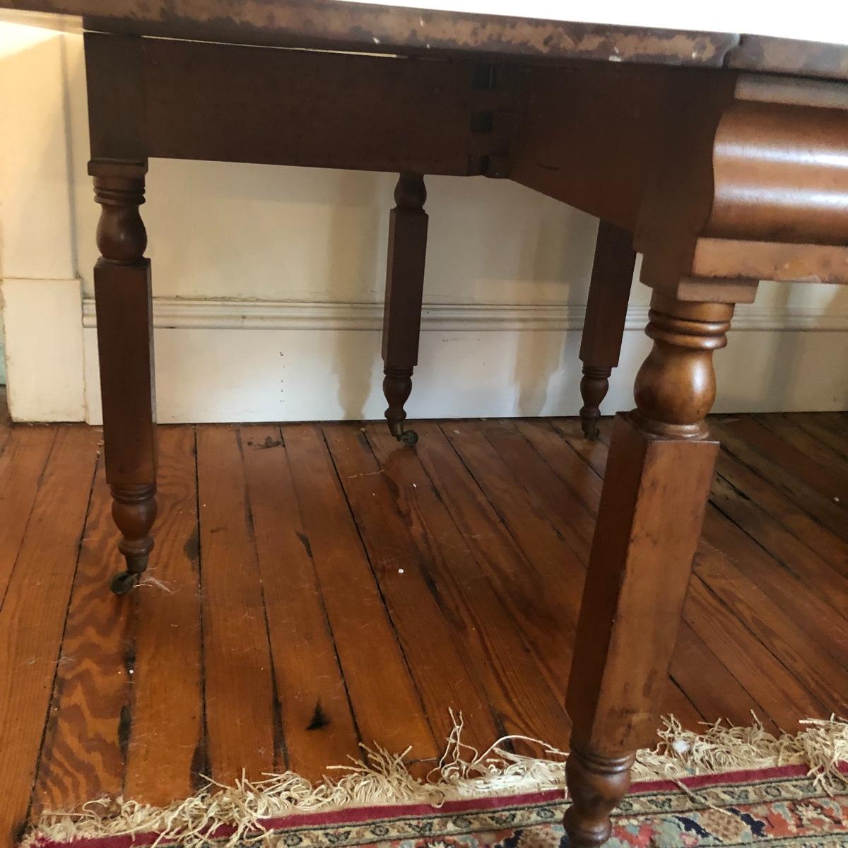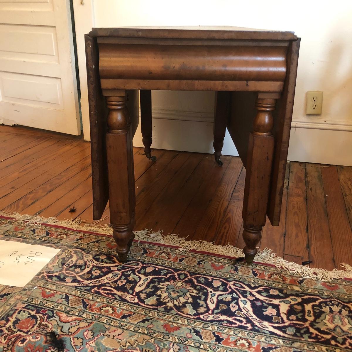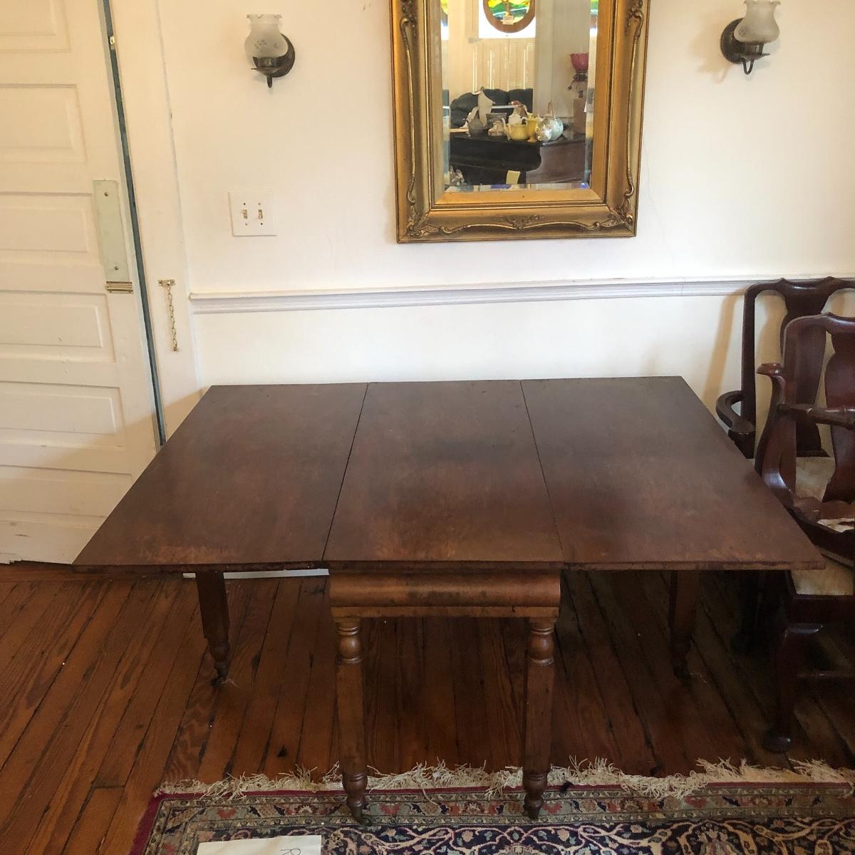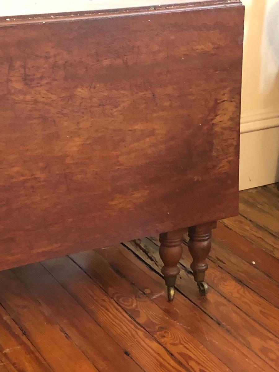 This is one of the largest to smallest drop leaf tables we have come across. It’s in great shape. The legs cleanly swivel behind the existing legs so you cannot see them when the leaves are down. Quality casters make this table very maneuverable.