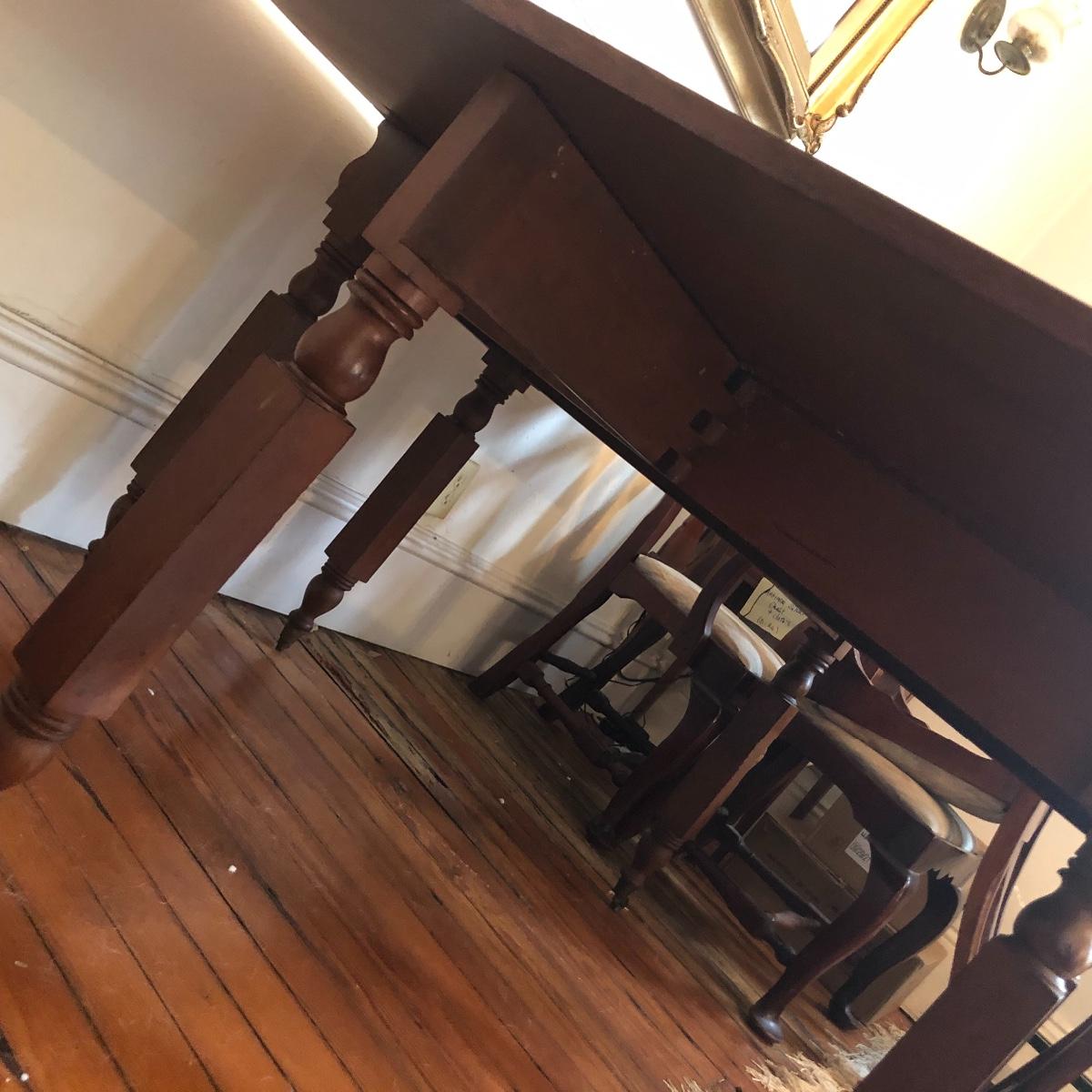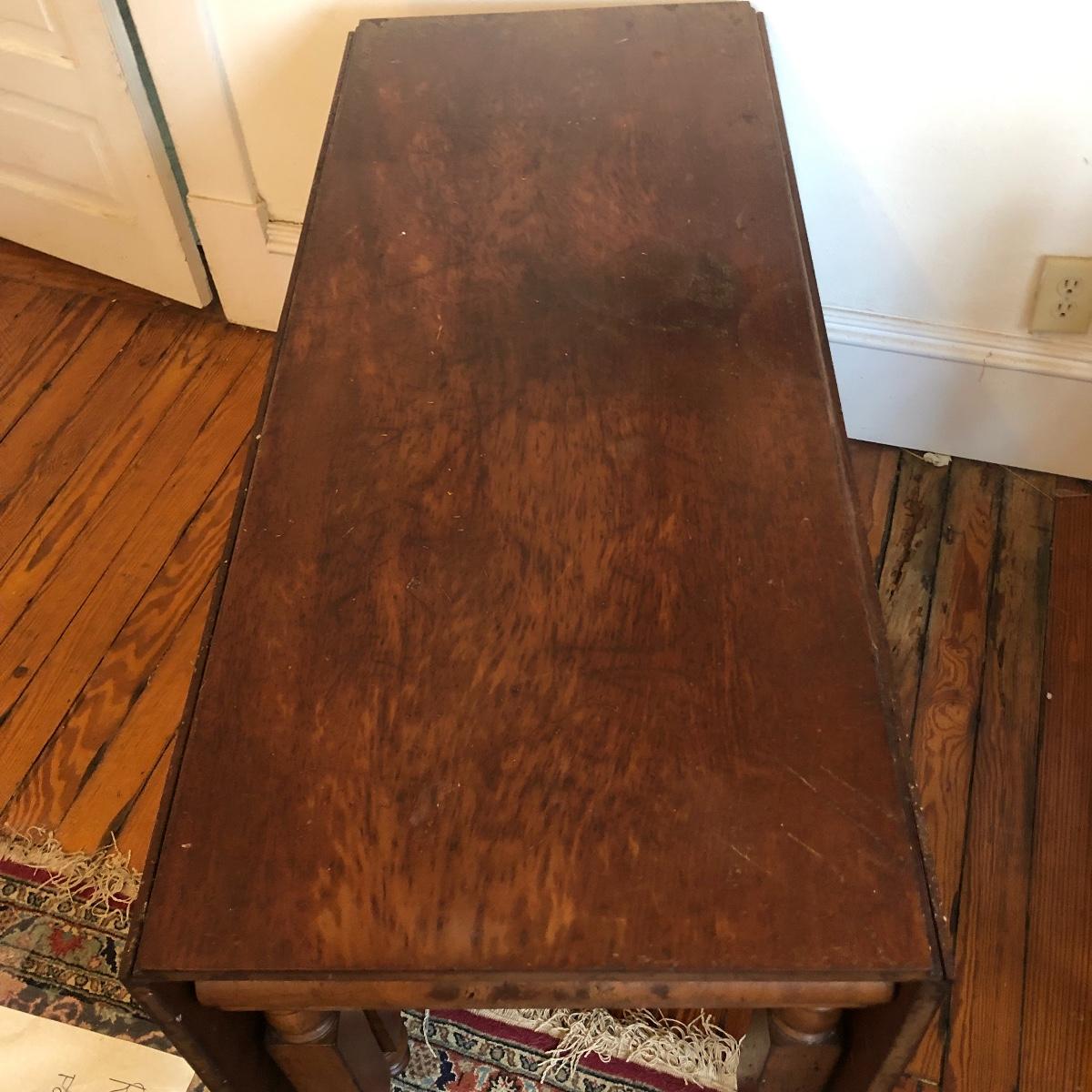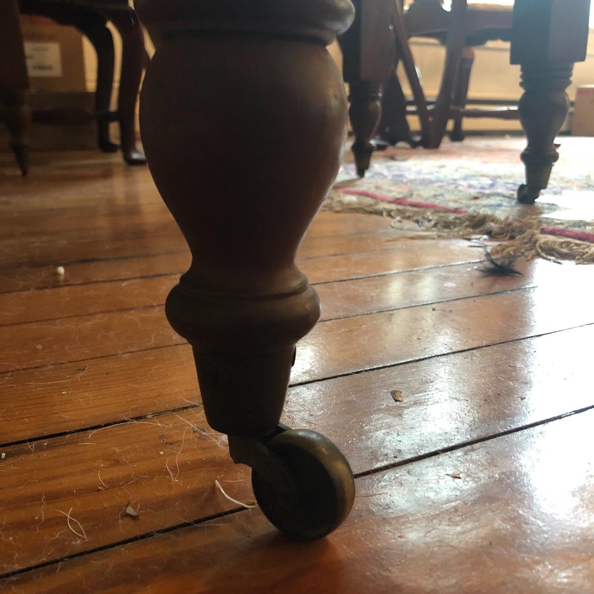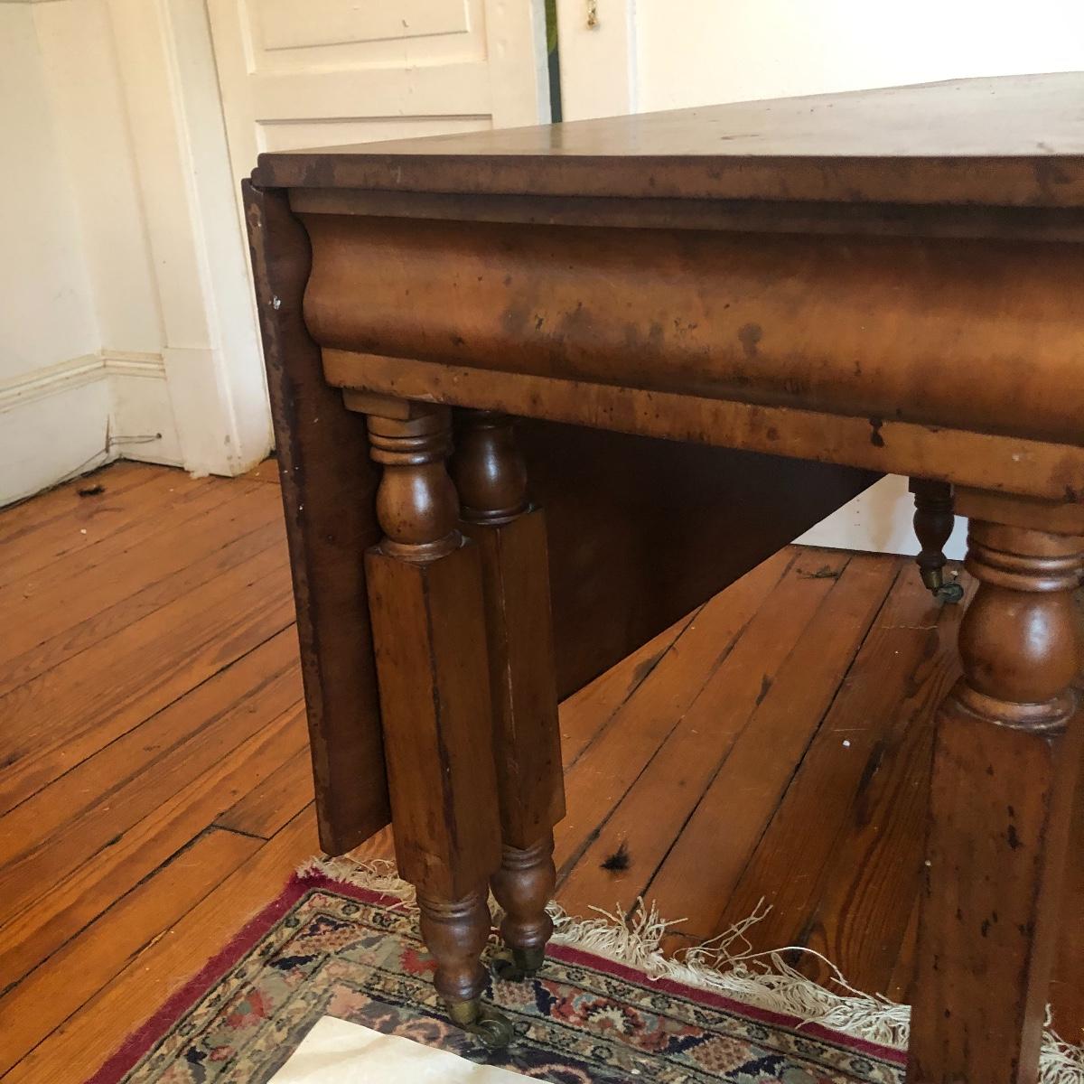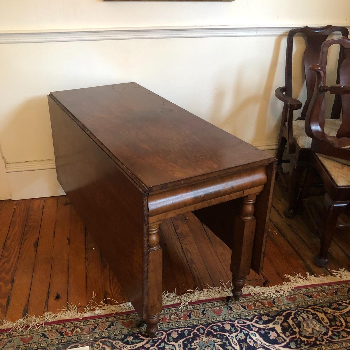 This is one of the largest to smallest drop leaf tables we have come across. It’s in great shape. The legs cleanly swivel behind the existing legs so you cannot see them when the leaves are down. Quality casters make this table very maneuverable.